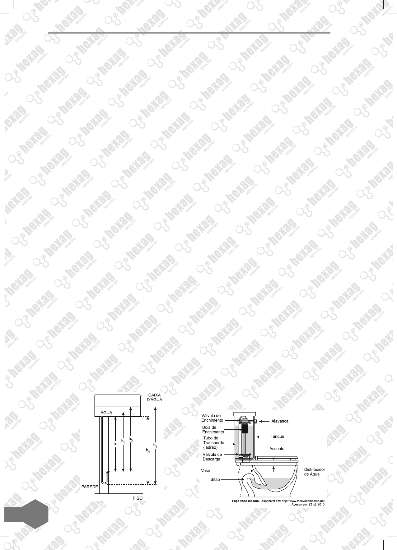474 18. (Enem) Para oferecer acessibilidade aos portadores de dificuldade de locomoção, é utilizado, em ônibus e automóveis, o ele- vador hidráulico. Nesse dispositivo é usada uma bomba elétrica, para forçar um fluido a passar de uma tubulação estreita para outra mais larga, e dessa forma acionar um pistão que movimenta a plataforma. Considere um elevador hidráulico cuja área da cabeça do pistão seja cinco vezes maior do que a área da tubulação que sai da bomba. Desprezando o atrito e considerando uma aceleração gra- vitacional de 10 m/s2, deseja-se elevar uma pessoa de 65 kg em uma cadeira de rodas de 15 kg sobre a plataforma de 20 kg. Qual deve ser a força exercida pelo motor da bomba sobre o fluido, para que o cadeirante seja elevado com velocidade constante? a) 20 N. b) 100 N. c) 200 N. d) 1000 N. e) 5000 N. 19. (Enem) Um dos problemas ambientais vi- venciados pela agricultura hoje em dia é a compactação do solo, devida ao intenso trá- fego de máquinas cada vez mais pesadas, re- duzindo a produtividade das culturas. Uma das formas de prevenir o problema de compactação do solo é substituir os pneus dos tratores por pneus mais: a) largos, reduzindo a pressão sobre o solo. b) estreitos, reduzindo a pressão sobre o solo. c) largos, aumentando a pressão sobre o solo. d) estreitos, aumentando a pressão sobre o solo. e) altos, reduzindo a pressão sobre o solo. 20. (Enem) O manual que acompanha uma du- cha higiênica informa que a pressão mínima da água para o seu funcionamento apropria- do é de 20 kPa. A figura mostra a instalação hidráulica com a caixa-d‘água e o cano ao qual deve ser conectada a ducha. O valor da pressão da água na ducha está as- sociado à altura: a) h1. b) h2. c) h3. d) h4. e) h5. 21. (Enem) Um consumidor desconfia que a balança do supermercado não está aferin- do corretamente a massa dos produtos. Ao chegar a casa resolve conferir se a balança estava descalibrada. Para isso, utiliza um re- cipiente provido de escala volumétrica, con- tendo 1,0 litro d‘água. Ele coloca uma porção dos legumes que comprou dentro do reci- piente e observa que a água atinge a marca de 1,5 litro e também que a porção não ficara totalmente submersa, com 1 __ 3 de seu volume fora d‘água. Para concluir o teste, o consu- midor, com ajuda da internet, verifica que a densidade dos legumes, em questão, é a metade da densidade da água, onde, ρágua = 1 g/cm3. No supermercado a balança regis- trou a massa da porção de legumes igual a 0,500 kg (meio quilograma). Considerando que o método adotado tenha boa precisão, o consumidor concluiu que a balança estava descalibrada e deveria ter re- gistrado a massa da porção de legumes igual a: a) 0,073 kg. b) 0,167 kg. c) 0,250 kg. d) 0,375 kg. e) 0,750 kg. 22. (Enem) Um tipo de vaso sanitário que vem substituindo as válvulas de descarga está esquematizado na figura. Ao acionar a ala- vanca, toda a água do tanque é escoada e aumenta o nível no vaso, até cobrir o sifão. De acordo com o Teorema de Stevin, quan- to maior a profundidade, maior a pressão. Assim, a água desce levando os rejeitos até o sistema de esgoto. A válvula da caixa de descarga se fecha e ocorre o seu enchimento. Em relação às válvulas de descarga, esse tipo de sistema proporciona maior economia de água.