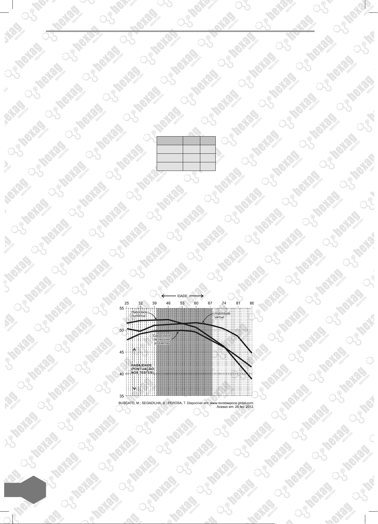 670 Ao acertar uma das regiões do alvo, ele terá direito ao(s) prêmio(s) indicado(s) nesta região. Há ainda o prêmio extra, caso o cliente acerte o dardo no quadrado ABCD. João Maurício fez uma com- pra nessa loja e teve o direito de jogar o dardo. A quantidade de prêmios que João Maurício tem a menor probabilidade de ganhar, sabendo que ele jogou o dardo aleatoriamente, é exatamente: a) 1. b) 2. c) 3. d) 4. e) 5. 10. (Enem PPL) Uma aluna registrou as notas de matemática obtidas nos 3 primeiros bimestres do ano letivo e seus respectivos pesos no quadro a seguir. Bimestre Nota Peso 1 2,5 1 2 5,8 2 3 7,4 3 Ela ainda não sabe qual será sua nota de matemática no quarto bimestre, mas sabe que o peso dessa nota na média final é 4. As notas variam de zero a dez, sendo permitida apenas uma casa na parte decimal (caso contrário, a nota será arredondada, usando como critério “se o algarismo da segunda casa decimal é maior ou igual a 5, então o algarismo na primeira casa decimal será acrescido de uma unidade”). A média final mínima para aprovação na escola dessa aluna é 7. Se ela obtiver média final inferior a 7, precisará realizar uma outra prova que substitua a menor das notas bimestrais, de modo a alcançar a média 7 (mantidos os mesmos pesos anteriores). Se essa aluna precisar realizar uma prova para substituir a nota que obteve no primeiro bimestre, e tal nota precisar ser igual a 4,8, é porque a nota que ela obteve no quarto bimestre foi: a) 2,3. b) 7,3. c) 7,9. d) 9,2. e) 10,0. 11. (Enem PPL) Em variados momentos de nossa vida, precisamos interpretar as diferentes linguagens dos sis- temas de comunicação. O gráfico é um desses sistemas, que, no caso apresentado, indica que as habilidades associadas à inteligência humana variam de acordo com a idade. Considerando essa informação, constata-se que: a) a habilidade verbal destaca-se entre 40 e 60 anos. b) a habilidade numérica diminui consideravelmente entre 20 e 40 anos. c) a habilidade de resolução de problemas piora consideravelmente a partir dos 30 anos. d) as habilidades humanas, em geral, declinam consideravelmente a partir dos 40 anos. e) a habilidade numérica melhora muito na faixa etária entre 60 e 80 anos.