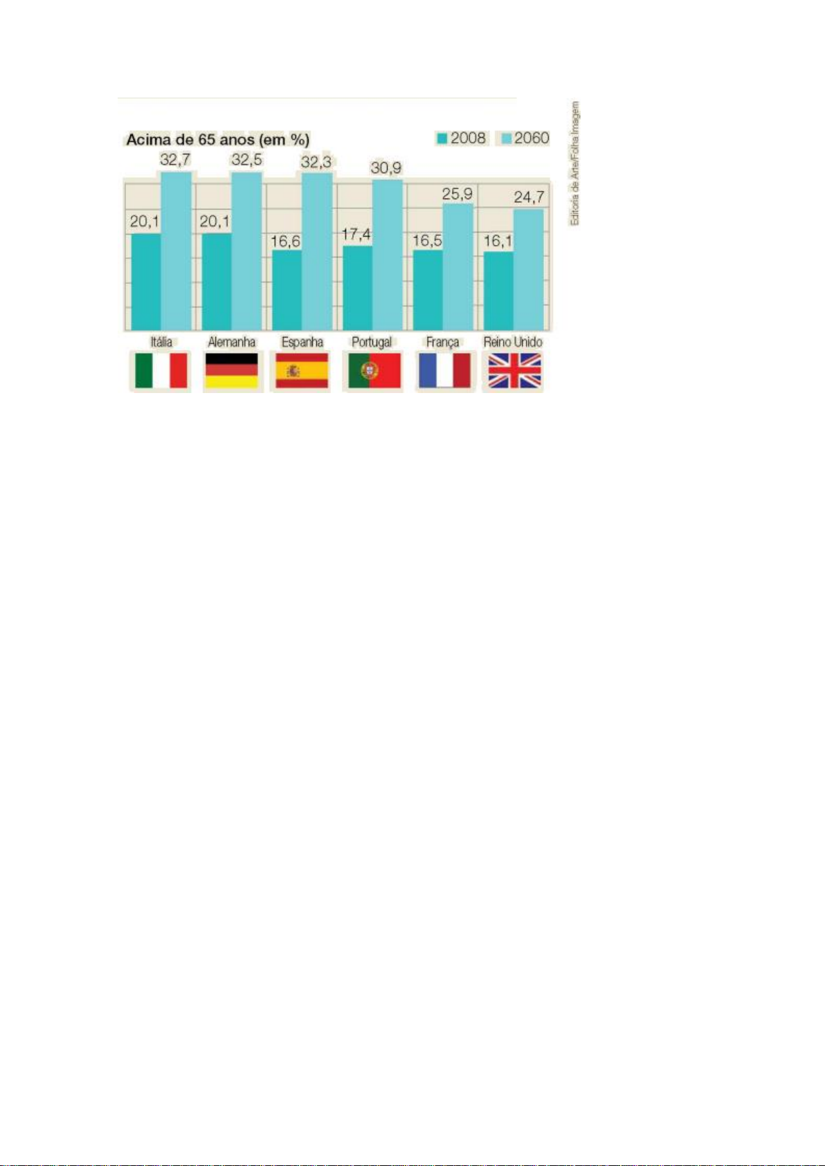 Fonte: Eurostat (http://epp.eurostat.ec.europa.eu) A previsão do Eurostat é de que a porcentagem atual de pessoas acima de 65 anos, de 17,1%, quase dobrará até 2060, chegando a 30%. A população com mais de 80 anos praticamente triplicará no mesmo período, passando de 22 milhões (4,4%) para 61 milhões (12,1%). Pelas projeções do Eurostat, a médio prazo a população total da UE continuará crescendo, dos 495 milhões atuais para 521 milhões em 2035. A partir daí sofrerá um declínio, chegando a 506 milhões em 2060. Dos 27 países do bloco, 13 terão aumento populacional até 2060, contra 14 que passarão pelo processo oposto. (Folha de S.Paulo, 27/8/2008.) a) De acordo com o texto, quantos são os habitantes dos países da União Europeia (UE) com mais de 65 anos em 2008? E quantos serão em 2060? b) Quantos eram os países da UE em 2008? c) Dos países apresentados no gráfico, qual terá maior aumento na porcentagem da população acima de 65 anos? Matemática - Unidade 9 - Capítulo 22 - Inequações do 1º grau - Exercícios - Matemática em notícia Questão 1195 A média geométrica é menor ou maior do que a média aritmética dos números dados? Verifique isso em cada item do exercício anterior. a) 9 e 16 b) 16 e 25 c) 15 e 60 d) 1 e 100 Matemática - Unidade 4 - Capítulo 13 - Medidas estatísticas - Exercícios Questão 1196 Calcule o valor de: a) 32 – 23 + b) 4 · 23 – · (–2)1 c) 51 · 3–2 + 3–1 – 3 · 30 d) 23 – 2 · 32 e) (–1)10 + 3 · (–1)5 – 3 · (–1)6 f) (+5)4 – (–5)4 Matemática - Unidade 2 - Capítulo 3 - Potência de base real e expoente inteiro - Exercícios (pg. 43 - 47) Questão 1197 Numa cidade, uma corrida de táxi custa R$ 4,00 mais a quantia de R$ 0,75 por quilômetro rodado. a) Quanto custa uma corrida de x quilômetros? b) Quantos quilômetros tem uma corrida que custa R$ 10,00? Matemática - Unidade 8 - Capítulo 20 - Equações - Exercícios (pg. 253 - 257)