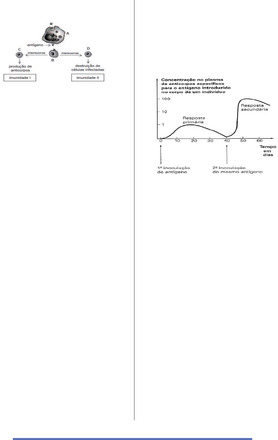10 35 – (Uft) O esquema a seguir representa o mecanismo de ação de componentes do sistema imunitário. As células representadas pelas letras A, B, C e D e os tipos de imunidade representados por I e II são, respectivamente: a) Linfócitos B, linfócitos T auxiliares, linfócitos T citotóxicos, macrófagos, imunidade humoral, imunidade celular. b) Macrófagos, linfócitos B, linfócitos T auxiliares, linfócitos T citotóxicos, imunidade celular, imunidade humoral. c) Linfócitos T citotóxicos, macrófagos, linfócitos T auxiliares, linfócitos B, imunidade celular, imunidade humoral. d) Macrófagos, linfócitos T citotóxicos, linfócitos B, linfócitos T auxiliares, imunidade humoral, imunidade celular. e) Macrófagos, linfócitos T auxiliares, linfócitos B, linfócitos citotóxicos, imunidade humoral, imunidade celular. 36 – (Ufpi) O organismo dos mamíferos é suscetível à infecção por muitos agentes patogênicos, os quais devem, em primeiro lugar, fazer contato com o hospedeiro, para então estabelecer um foco de infecção, causando a doença. Tais microrganismos diferem muito em seus estilos de vida, nas estruturas de suas superfícies e nos métodos patogênicos, exigindo repostas diferentes do sistema imunológico. Sobre a imunidade, é correto afirmar: a) A imunidade inata funciona como primeira linha de defesa pela habilidade de reconhecer certos patógenos e de permitir uma imunidade protetora específica. b) A imunidade adaptativa está baseada na seleção clonal de um repertório de linfócitos portadores de diferentes receptores antígeno-específicos, que permitam ao sistema imune reconhecer qualquer antígeno estranho. c) A imunidade adquirida não é específica e não muda de intensidade com a exposição ao agente invasor, depende da produção de substâncias e da ação de células fagocitárias. d) Os linfócitos B, que sofrem maturação no timo, diferenciam-se em células de memória, que reconhecem os antígenos na resposta imune primária. e) Os linfócitos T, que sofrem maturação na própria medula óssea, diferenciam-se em plasmócitos, que possam produzir anticorpos, liberando-os no plasma sanguíneo para a imunidade humoral. 37 – (Upe) Considere o gráfico abaixo sobre a variação da concentração de anticorpos presentes no plasma, ao longo de 60 dias, em resposta à introdução de antígenos no organismo de um mesmo indivíduo. Biologia – Sônia Lopes vol.1, Ed. Saraiva Em relação às respostas imunológicas, analise as afirmativas a seguir. I. Na resposta imunológica primária, o tempo para produção de anticorpos é maior que na resposta secundária. A primeira corresponde à imunização passiva, e a segunda, à imunização ativa. II. Na primeira inoculação, os antígenos são fagocitados pelos linfócitos T auxiliadores. Estes passam a “informação” para os linfócitos T citotóxicos, produtores de anticorpos. III. A resposta secundária está relacionada com memória imunológica, por isso é mais rápido o aumento da concentração de anticorpos. IV. Os anticorpos produzidos são específicos para cada tipo de antígeno e são denominados genericamente imunoglobulinas (Ig). As IgG são imunoglobulinas que passam para o feto, via placentária. V. A primeira inoculação corresponde à administração de vacina, com resposta lenta, mas de duradoura eficiência, e a segunda inoculação corresponde à administração de soro, com resposta imediata, porém de pouca duração. Assinale a alternativa correta. a) Apenas I, II e III estão corretas. b) Apenas I, II e V estão corretas. c) Apenas III e IV estão corretas. d) Apenas IV e V estão corretas. e) Apenas a V está correta.