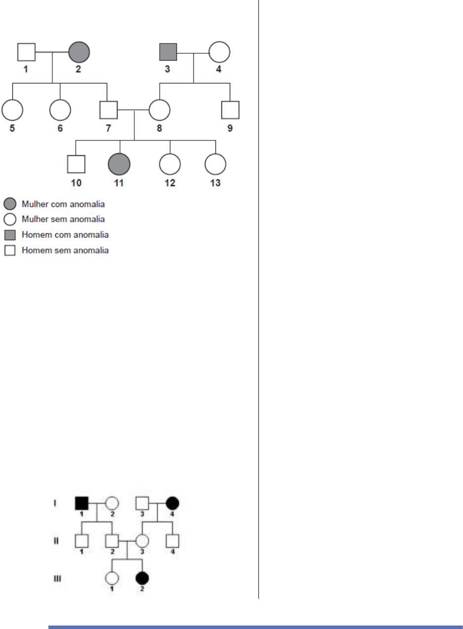 4 A estrutura do DNA, representada na figura, possibilitou desvendar como as características dos pais são repassadas aos filhos. Sabendo que as chances de nascimento de menino e menina são iguais, a probabilidade de um casal, em três gestações, de uma criança em cada gestação, ter pelo menos um menino é a) 1/8. b) 1/3. c) 5/ 8. d) 2/3. e) 7/8. 15 - (Enem) O heredograma mostra a incidência de uma anomalia genética em um grupo familiar. O indivíduo representado pelo número 10, preocupado em transmitir o alelo para a anomalia genética a seus filhos, calcula que a probabilidade de ele ser portador desse alelo é de a) 0%. b) 25%. c) 50%. d) 67%. e) 75%. 16 - (Unp) Você é o médico que está acompanhando um caso de uma doença hereditária em uma família. Após levantar todos os dados de ocorrência da doença na família, você construiu o heredograma representado na figura ao lado. Os indivíduos marcados em preto são afetados. A mulher representada por III-1 no heredograma, está noiva e deseja saber qual a probabilidade de ela ser portadora do gene da doença. a) Ela apresenta 1/2 de probabilidade de ser portadora do gene da doença. b) Ela apresenta 2/3 de probabilidade de ser portadora do gene da doença. c) Ela apresenta 1/4 de probabilidade de ser portadora do gene da doença. d) Ela apresenta 1/3 de probabilidade de ser portadora do gene da doença. 17 - (Fuvest) Numa espécie de planta, a cor das flores é determinada por um par de alelos. Plantas de flores vermelhas cruzadas com plantas de flores brancas produzem plantas de flores cor-de-rosa. Do cruzamento entre plantas de flores cor-de-rosa, resultam plantas com flores a) das três cores, em igual proporção. b) das três cores, prevalecendo as cor-de-rosa. c) das três cores, prevalecendo as vermelhas. d) somente cor-de-rosa. e) somente vermelhas e brancas, em igual proporção. 18 - (UFV) Frutos fvcom fenótipo “Violeta” são os únicos resultantes de herança do tipo dominância incompleta entre cruzamentos de plantas com fruto “Roxo” e plantas com fruto “Branco”. Foram obtidas, de um cruzamento entre heterozigotas, 48 plantas. Espera-se que a proporção fenotípica do fruto entre as plantas descendentes seja: a) Violeta (0): Roxo (36): Branco (12). b) Violeta (12): Roxo (24): Branco (12). c) Violeta (24): Roxo (12): Branco (12). d) Violeta (36): Roxo (12): Branco (0). e) Violeta (48): Roxo (0): Branco (0). 19 -(Ufrgs) Em rabanetes, um único par de alelos de um gene controla a forma da raiz. Três formas são observadas: oval, redonda e longa. Cruzamentos entre estes três tipos apresentam os seguintes resultados: