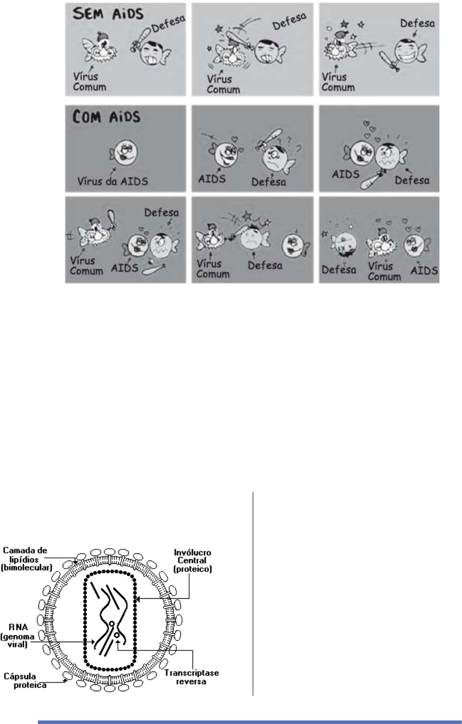 9 33 - (Unifor) A imagem revela a batalha entre o sistema imunológico e o vírus HIV. Considerando o contexto abaixo, responda corretamente: Disponível em: . Acesso em 09/11/11. a) A infecção pelo HIV e a produção de anticorpos anti-HIV no sangue pelo sistema de defesa do organismo em resposta ao HIV é constatada imediatamente após a exposição ao vírus. b) A fase assintomática da AIDS ocorre com o frequente ataque do vírus às células de defesa que funcionam com menos eficiência até serem destruídas, e se caracteriza pela alta redução dos linfócitos T CD4. c) Na fase avançada da AIDS, ocorre o aparecimento de doenças oportunistas, tais como candidíase oral ou de esôfago, tuberculose, sarcoma de Kaposi, toxoplasmose cerebral e pneumonia, entre outras. d) O HIV possui DNA, e sua principal característica é a presença da enzima transcriptase reversa, que produz moléculas de RNA a partir do DNA que penetra no núcleo da célula, e recombina-se com o DNA celular. e) O HIV é bastante resistente no meio externo, sendo ativado por uma variedade de agentes físicos (calor) e químicos (hipoclorito de sódio, glutaraldeído). As partículas virais dentro do corpo sobrevivem lutando contra nosso sistema de defesa. 34 - (Uff) O vírus da AIDS, cuja estrutura é representada a seguir, parasita os linfócitos, células diretamente envolvidas na defesa do organismo. Com relação a este vírus considere as proposições: 1. O vírus da AIDS é um retrovírus capaz de produzir um molde do DNA, pela ação da enzima transcriptase reversa, a partir do RNA. 2. Certas substâncias como o AZT, conseguem frear a reprodução viral, devido à inibição da transcriptase. 3. Após sintetizar o DNA viral (fita única), o RNA do vírus da AIDS se desintegra (degradação), ocorrendo posteriormente a formação de um provírus de DNA. 4. O envoltório externo do vírus da AIDS, constituído por moléculas de lipídios, associadas a proteínas é dispensável para a penetração viral na célula. As proposições que estão corretas são as indicadas por: