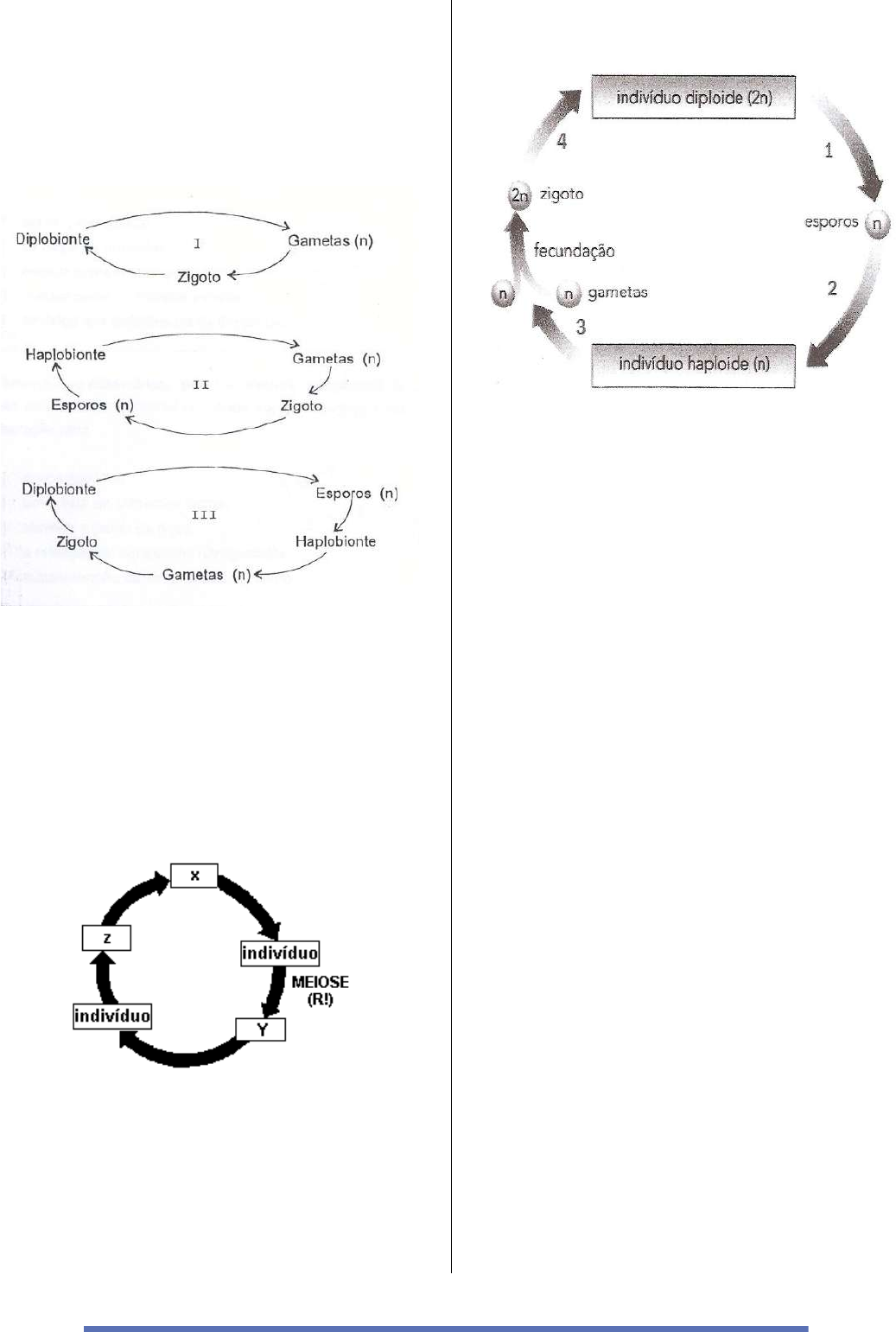4 a) I e II. b) I e III. c) II e I. d) II e III. e) III e II. 15 - (Unifor) Os esquemas abaixo referem-se a ciclos de vida das algas. A meiose em I, II e III é, respectivamente, a) Espórica, gamética e zigótica. b) Espórica, zigótica e gamética. c) Zigótica, gamética e espórica. d) Gamética, zigótica e espórica. e) Gamética, espórica e zigótica. 16 - (Fuvest) Considere o diagrama a seguir, representativo do ciclo de vida de uma planta. Qual alternativa completa corretamente o diagrama? a) x – esporo, y – zigoto, z – gameta. b) x – esporo, y – gameta, z – zigoto. c) x – gameta, y – esporo, z – zigoto. d) x – gameta, y – zigoto, z – esporo. e) x – zigoto, y – esporo, z – gameta. 17 - (Facisa) A ilustração seguinte resume esquematicamente o ciclo de vida haplonte-diplonte. Os eventos que ocorrem nos intervalos 1 – 2 – 3 e 4 são, respectivamente, a) meiose – mitoses – meiose – mitoses. b) meiose – mitoses – mitoses – mitoses. c) mitoses – mitoses – meiose – meiose. d) meiose – meiose – mitoses – mitoses. e) mitoses – meiose – mitoses – meiose. 18 - (Fip) O ciclo diplobionte (do grego diplo, duplo, dois) apresenta duas formas de vidas adultas: uma haploide e uma diploide. Esse tipo de reprodução denomina-se: a) Haplobiontes. b) Diplobionte. c) Gametogênese. d) Sexuada. e) Alternância de gerações. 19 - (Uel) A análise citológica realizada em uma população de algas verdes de uma determinada espécie verificou que alguns indivíduos apresentavam 80 cromossomos, enquanto que outros, apenas 40. Com base nessas informações, considere as afirmativas a seguir: I. Trata-se de indivíduos que se reproduzem por um ciclo haplodiplobionte, no qual a geração diplóide é resultante da fecundação de esporos. II. Trata-se de indivíduos haploides que sofrem meiose gamética para produzirem gametas diploides. III. Trata-se de indivíduos diploides que sofrem meiose espórica para produzirem esporos haploides. IV. Trata-se de indivíduos que se reproduzem por um ciclo haplodiplobionte, no qual a geração haploide é resultante da germinação de esporos.