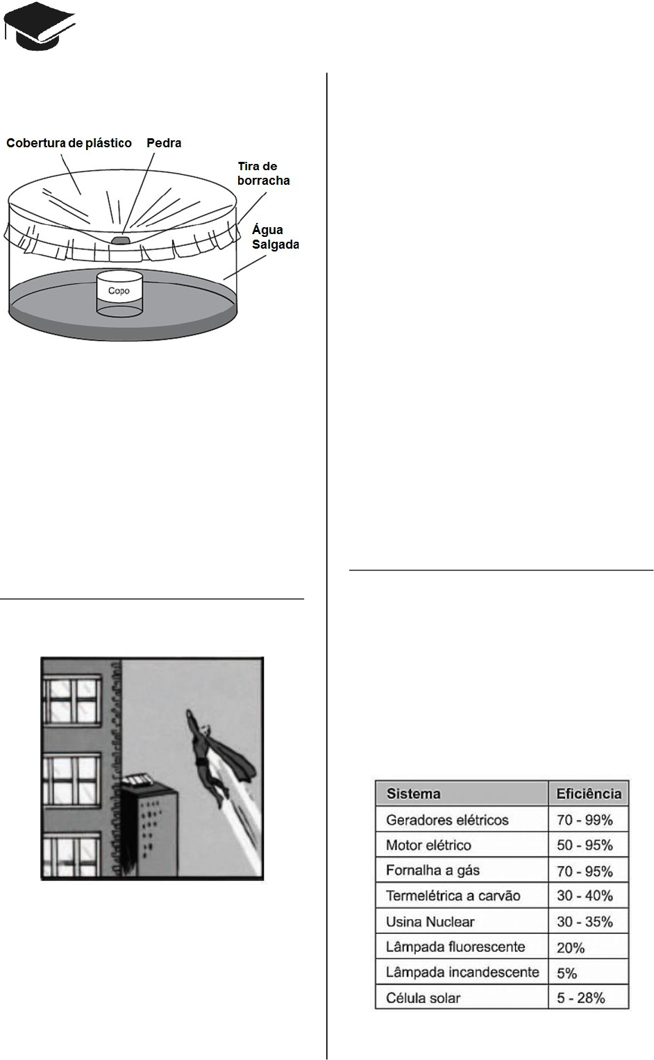 CADERNO FÍSICA ENEM novocadernoenem@gmail.co 4 A água evaporada se condensa no plástico e escorre até o ponto mais baixo, caindo dentro do copo. Nesse processo, a energia solar cedida à água salgada: A) fica retida na água doce que cai no copo, tornando-a, assim, altamente energizada. B) fica armazenada na forma de energia poten- cial gravitacional contida na água doce. C) é usada para provocar a reação química que transforma a água salgada em água doce. D) é cedida ao ambiente externo através do plástico, onde ocorre a condensação do vapor. E) é reemitida como calor para fora do tanque, no processo de evaporação da água salgada. Questão 09 (2009.1) O Super-homem e as leis do movimento Uma das razões para pensar sobre a física dos super-heróis é, acima de tudo, uma forma diver- tida de explorar muitos fenômenos físicos inte- ressantes, dede fenômenos corriqueiros até eventos considerados fantásticos. A figura se- guinte mostra o Super-homem lançando-se no espaço para chegar ao topo de um prédio de altura H. Seria possível admitir que com seus superpoderes ele estaria voando com propulsão própria, mas considere que ele tenha dado um forte salto. Neste caso, sua velocidade final no ponto mais alto do salto deve ser zero, caso contrário, ele continuaria subindo. Sendo g a aceleração da gravidade, a relação entre a ve- locidade inicial do Super-homem e a altura atin- gida é dada por: V2 = 2gG. A altura que o Super-homem alcança em seu salto depende do quadrado de sua velocidade inicial porque: A) a altura do seu pulo é proporcional à sua velocidade média multiplicada pelo tempo que ele permanece no ar ao quadrado. B) o tempo que ele permanece no ar é direta- mente proporcional à aceleração da gravidade e essa é diretamente proporcional à velocidade. C) o tempo que ele permanece no ar é inversa- mente proporcional à aceleração da gravidade e essa é inversamente proporcional à velocidade média. D) a aceleração do movimento deve ser elevada ao quadrado, pois existem duas acelerações envolvidas: a aceleração da gravidade e a ace- leração do salto. E) a altura do pulo é proporcional à sua veloci- dade média multiplicada pelo tempo que ele permanece no ar, e esse tempo também de- pende da sua velocidade inicial. Questão 10 (2009.1) A eficiência de um processo de conversão de energia, definida como sendo a razão entre a quantidade de energia ou trabalho útil e a quan- tidade de energia que entra no processo, é sempre menor que 100% devido a limitações impostas por leis físicas. A tabela a seguir, mos- tra a eficiência global de vários processos de conversão. Eficiência de alguns sistemas de conversão de energia (HINRICHS, R. A; KLEINBACH, M. Energia e meio ambiente. São Paulo: Pioneira Leaming, 2003) Na sequência apresentamos a relação das provas presentes no Caderno Enem. A sigla no início de cada questão é uma referência do ano e da ordem de aplicação da prova. Por exemplo, uma questão com a sigla ENEM 2014.2 foi aplicada nas Unidades Prisio- nais no ano de 2014, conforme explicamos: ENEM 2018.2 - Prova Unidades Prisionais 2018 Questão 09 (2009.1) Questão 10 (2009.1) Eficiência de alguns sistemas de conversão de energia