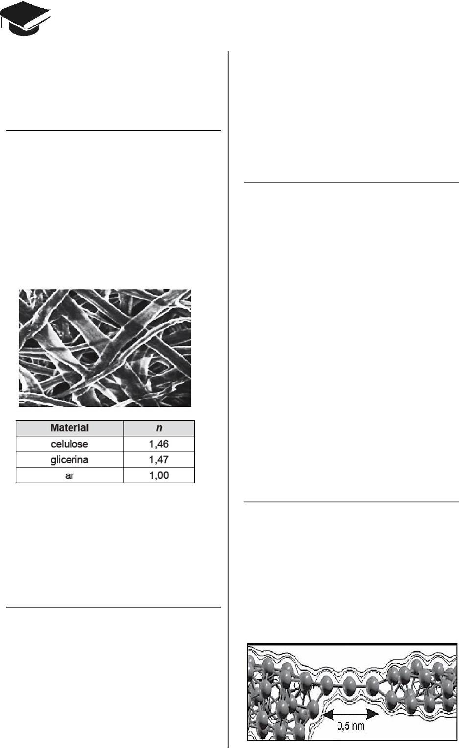 CADERNO FÍSICA ENEM novocadernoenem@gmail.co 5 A) dureza. B) elasticidade. C) dilatação térmica. D) compressibilidade. E) condutividade elétrica. Questão 184 (2014.2) Folhas de papel, como as utilizadas para a im- pressão de documentos, são opacas e permeá- veis aos líquidos. Esse material é constituído de microfibras entrelaçadas de celulose, que são transparentes à luz. Quando sobre elas se der- rama glicerina, elas se tornam translúcidas. Uma imagem da superfície de uma folha de papel, ampliada por um microscópio eletrônico de varredura, pode ser vista na figura. No qua- dro é apresentada a razão (n) entre a velocida- de da luz no vácuo e no respectivo material (celulose, glicerina ou ar). Nessa situação, o papel se tornou translúcido porque a luz é: A) mais refletida. B) mais absorvida. C) mais espalhada. D) menos refratada. E) menos transmitida. Questão 185 (2014.2) Ao assistir a uma apresentação musical, um músico que estava na plateia percebeu que conseguia ouvir quase perfeitamente o som da banda, perdendo um pouco de nitidez nas notas mais agudas. Ele verificou que havia muitas pessoas bem mais altas à sua frente, bloquean- do a visão direta do palco e o acesso aos alto- falantes. Sabe-se que a velocidade do som no ar é 340m s e que a região de frequências das notas emitidas é de, aproximadamente, 20Hz a 4000Hz. Qual fenômeno ondulatório é o principal respon- sável para que o músico percebesse essa dife- renciação do som? A) Difração. B) Reflexão. C) Refração. D) Atenuação. E) Interferência. Questão 186 (2014.2) Na Antiguidade, algumas pessoas acreditavam que, no lançamento obliquo de um objeto, a resultante das forças que atuavam sobre ele tinha o mesmo sentido da velocidade em todos os instantes do movimento. Isso não está de acordo com as interpretações científicas atual- mente utilizadas para explicar esse fenômeno. Desprezando a resistência do ar, qual é a dire- ção e o sentido do vetor força resultante que atua sobre o objeto no ponto mais alto da traje- tória? A) Indefinido, pois ele é nulo, assim como a velocidade vertical nesse ponto. B) Vertical para baixo, pois somente o peso está presente durante o movimento. C) Horizontal no sentido do movimento, pois devido à inércia o objeto mantém seu movimen- to. D) Inclinado na direção do lançamento, pois a força inicial que atua sobre o objeto é constante. E) Inclinado para baixo e no sentido do movi- mento, pois aponta para o ponto onde o objeto cairá. Questão 187 (2014.2) Recentemente foram obtidos os fios de cobre mais finos possíveis, contendo apenas um áto- mo de espessura, que podem, futuramente, ser utilizados em microprocessadores. O chamado nanofio, representado na figura, pode ser apro- ximado por um pequeno cilindro de comprimen- to 0,5nm (1nm 10-9 m). A seção reta de um áto- mo de cobre é 0,05nm2 e a resistividade do cobre é 17 Ω.nm. Um engenheiro precisa esti- mar se seria possível introduzir esses nanofios nos microprocessadores atuais. Na sequência apresentamos a relação das provas presentes no Caderno Enem. A sigla no início de cada questão é uma referência do ano e da ordem de aplicação da prova. Por exemplo, uma questão com a sigla ENEM 2014.2 foi aplicada nas Unidades Prisio- nais no ano de 2014, conforme explicamos: ENEM 2018.2 - Prova Unidades Prisionais 2018 Questão 184 (2014.2) Questão 185 (2014.2) Questão 186 (2014.2) Questão 187 (2014.2)
