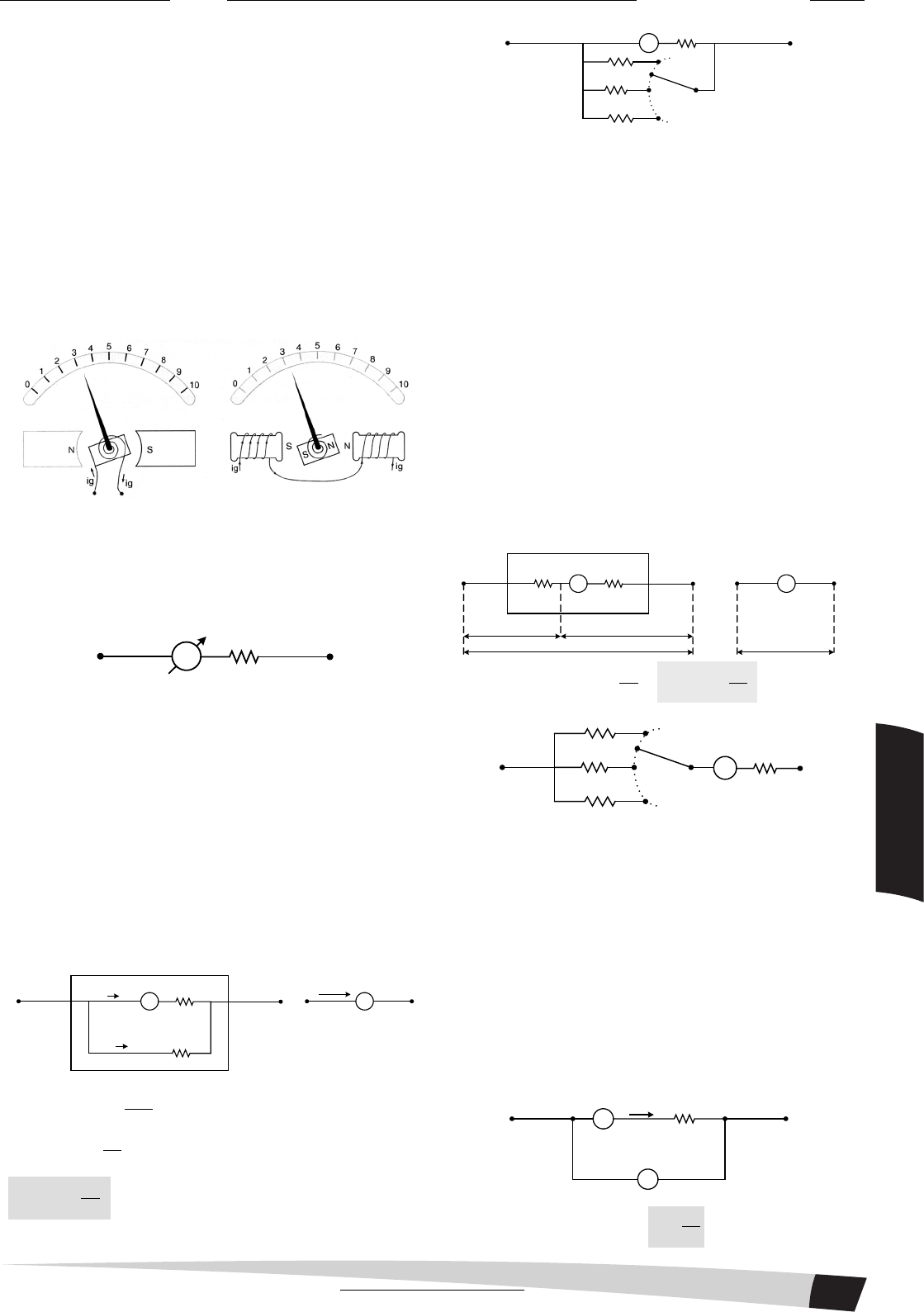 25 FÍ SI CA II nômetro, modificando-o de maneira que ele apresente as características desejáveis do instrumento de medida. O galvanômetro, assim denomina- do em homenagem a Luigi Galvani, é essencialmente um indicador de corrente elétrica, não tendo em geral a função de medir sua intensidade, podendo, entretanto, fazê-lo, se for devidamente graduado. Galvanômetro O princípio de funcionamento de um galvanômetro baseia-se na força magnética que age sobre um condutor percorrido por corrente elétrica, quando esse condutor está imerso em um campo magnético. Esse efeito será oportunamente estudado com detalhes no eletromagnetismo. Por hora, basta sabermos que a força magnética, agindo sobre o condutor percorrido por corrente elétrica, origina um binário que atua sobre a espira e provoca a deflexão de um ponteiro sobre uma escala previamente calibrada. O máximo valor da intensidade de corrente que pode atraves- sar o galvanômetro, sem danificá-lo, é denominado corrente de fundo de escala e será representado por iG. Do ponto de vista da eletrodinâmica, um galvanômetro comporta-se como um resistor com resistência interna RG. A figura abaixo indica a maneira esquemática de representação de um galvanômetro em um circuito elétrico. G RG Amperímetro real O instrumento que se destina a medir intensidades de correntes elétricas, como já sabemos, é o amperímetro. O amperímetro ideal, que temos utilizado até então, tem resistência interna nula. Entretanto, um bom amperímetro — com pequena resistência elétrica interna — pode ser fabri- cado a partir de um galvanômetro modificado. Um galvanômetro pode medir apenas correntes de intensidades muito pequenas, caso contrário a corrente pode danificar o fino arame de suas espiras. Quando correntes de grandes intensidades devem ser medidas, uma resistência shunt (palavra da língua inglesa que significa “desvio”) é associada em paralelo ao galvanômetro. A resistência shunt deve ser de pequeno valor para que a maior parte da corrente seja desviada para passar através dela. G iG RG iS = A Rs i = iG + iS, onde iS = G G S i R R G G G S Rlogo, i i i R = + ⋅ ∴ G G S Ri i 1 R ∴ = ⋅ + G RG Ch RS R’S R”S Voltímetro real Num galvanômetro, a deflexão do ponteiro sobre a escala graduada é proporcional à intensidade de corrente que o atravessa e esta é proporcional à ddp entre seus terminais. Portanto, podemos concluir que a deflexão do ponteiro também é proporcional à ddp suportada pelo galvanômetro. Sendo assim, podemos nos valer de um galvanômetro para medir pequenas diferenças de potencial. Para medir grandes dife- renças de potencial precisamos de um bom voltímetro. O voltímetro, bastante utilizado por nós até este ponto, é, como sabemos, um aparelho que se destina a medir diferenças de potencial entre dois pontos de um circuito elétrico. Até agora temos utilizado apenas o voltímetro ideal, aquele que apresenta uma resistência interna infinita. Contudo, um voltímetro de boa qualidade — com grande resis- tência interna —também pode ser construído a partir de um galvanômetro modificado, bastando para isso associar em série com o galvanômetro um resistor denominado multiplicador. O resistor multiplicador deve ter resistência elétrica bastante elevada para aumentar a resistência elétrica do instrumento e ainda suportar uma grande diferença de potencial. G U UM UG RM RG = V U M M G G G G G R RU U U U U 1 R R = + ⋅ ⇒ = ⋅ + Ch RM R’M R”M G RG Ohmímetro real O valor da resistência elétrica de um resistor pode ser deter- minado, basicamente, através de um dos três processos: da lei de Ohm, do ohmímetro e da ponte de Wheatstone. Primeiro processo: a partir da aplicação da lei de Ohm Nesse processo de determinação do valor de uma resistência elétrica, os valores da intensidade de corrente elétrica que atravessa o resistor e da ddp entre seus terminais são obtidos diretamente a partir da indicação de um amperímetro e de um voltímetro, ambos de boa qualidade. A V UV iA Rx Aplicando-se a Lei de Ohm temos: V X A UR i = Prof. Sérgio Torres Caderno - 01 - Com Resoluções das Questões Física 15/05/2010 76/160