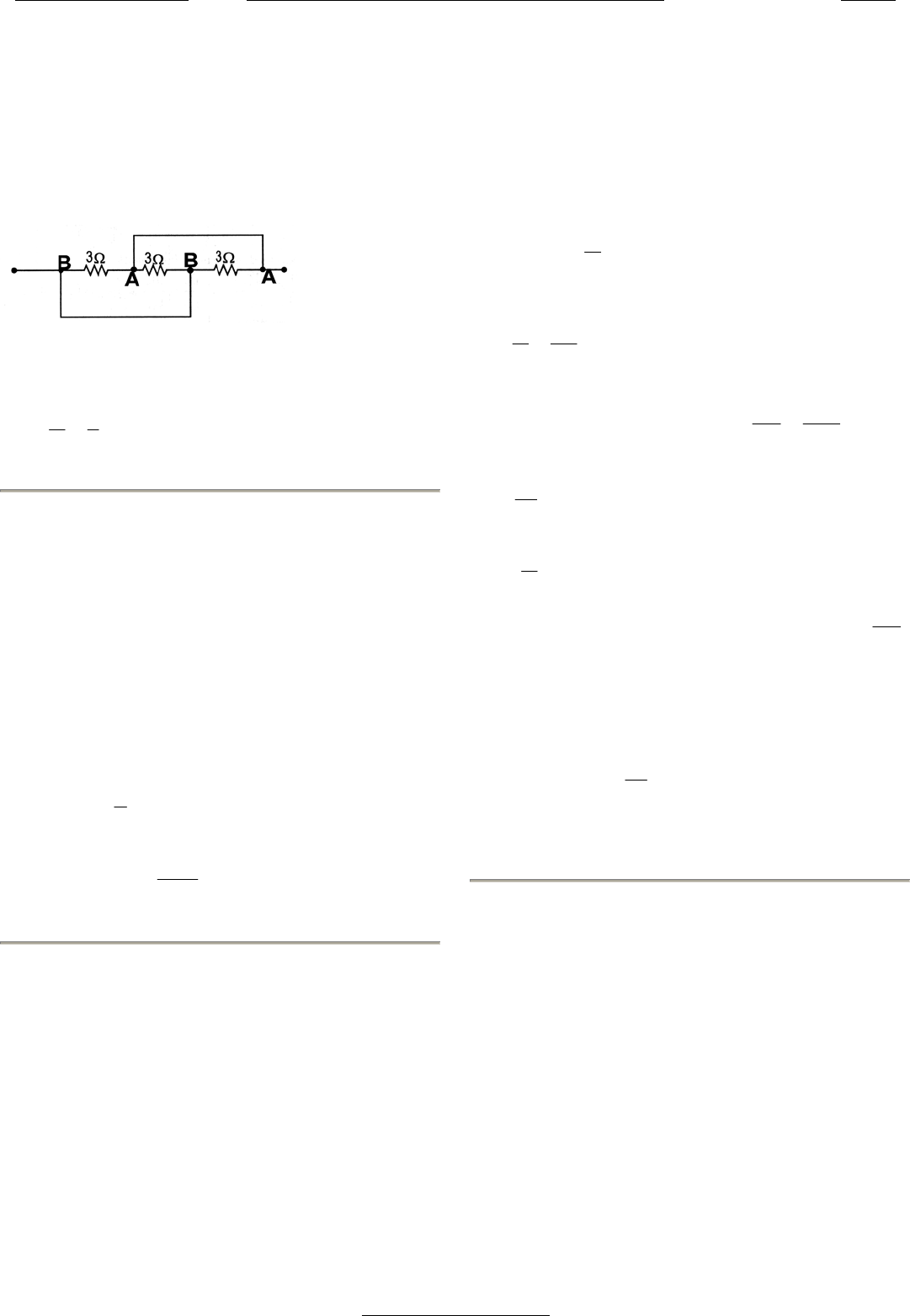 (NI:0154) Física 02 Tópico 04 Propostas Questão 06 Nível: fácil Assunto: 6.26.67 Vemos pela figura que todos os três resistores estão ligados com um “perna” em A e a outra “perna” em B, portanto os três resistores estão em paralelo. Como seus valores são iguais temos: Ω=== 1 3 3 3 RRE Resposta: 1Ω (NI: 0155) Física 02 Tópico 04 Vestibulares Questão 01 Nível: fácil Assunto: 6.26.67 Como a diferença de potencial manteve-se constante, a resistência de 2Ω foi inserida em série. Como a queda na associação inicial caiu para 4V, a queda no resistor de 2Ω é de 1V. Portanto a intensidade de corrente no circuito é: Ai 5,0 2 1 == , portanto a associação inicial é a intensidade de corrente de 0,5A quando submetido a 4V. Portanto: Ω== 8 5,0 4 A VRA Resposta letra (d) (NI: 0156) Física 02 Tópico 04 Vestibulares Questão 02 Nível: médio Assunto: 6.26.63 a) Sendo i VR = vemos que o gráfico é linear e repre- sentado por uma reta, portanto o resistor é ôhmico. O valor do resistor pode ser calculado por: Ω=== 0,3 0,1 0,3 i VR b) A potência dissipada determinada pelo efeito joule pode ser calculada por: W R UiUPd 27 0,3 0,9 22 ===⋅= , como a potência dissipada pode ser expressa por: JtPQ t QP dd 310.1,8)60(0,527 =⋅⋅=Δ⋅=⇒ Δ = c) A associação 1 tem como resistor equivalente 3 RReq = , enquanto que a associação 2 tem como resis- tor equivalente )3(⋅= RReq . Pela equação R UPd 2 = , vemos que quanto menor o resistor equivalente maior será a potência dissipa, potência dissipada e resistência equivalente são inversamente proporcionais. Portanto, a configuração que dissipa maior potência é a associação 1. Como a potência dissipada é inversamente proporcio- nal ao tempo, t QPd Δ = , o circuito que leva menos tempo é o de maior potência dissipada associação 1 Respostas: a) sim, 3,0Ω; b) 8,1.103J; c) Associação 1 12 Prof. Sérgio Torres Caderno - 01 - Com Resoluções das Questões Física 15/05/2010 93/160
