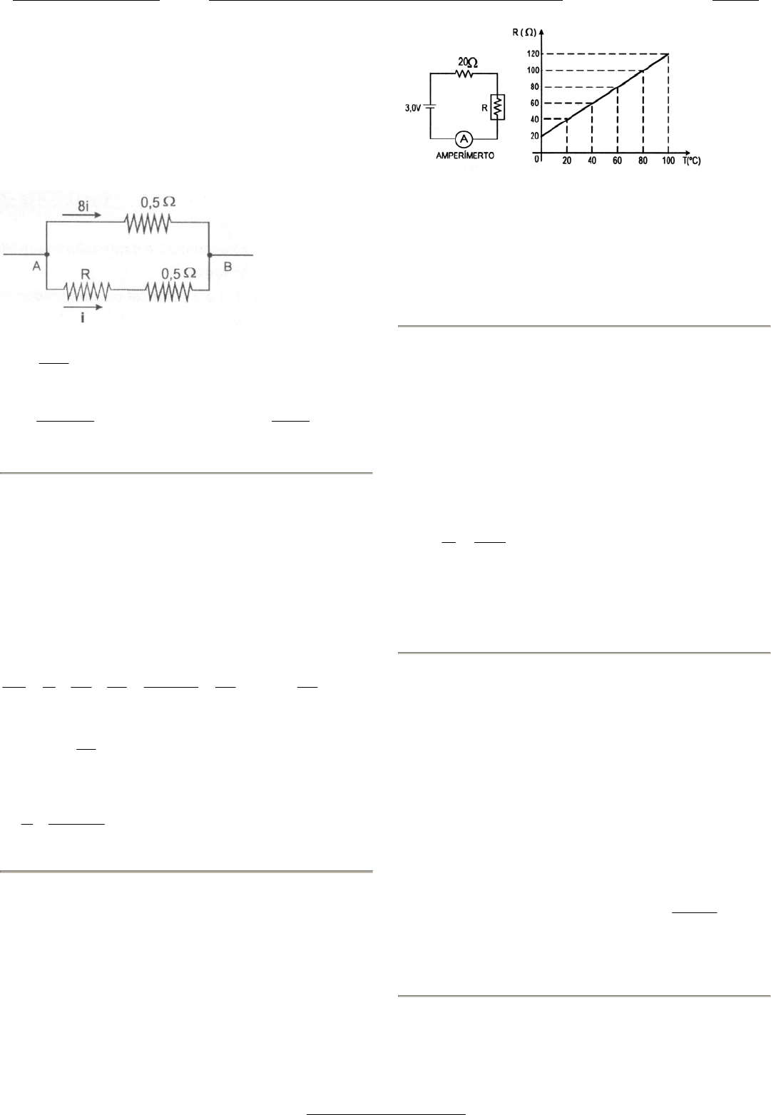 (NI: 0160) Física 02 Tópico 04 Vestibulares Questão 06 Nível: fácil Assunto: 6.26.67 Observe a figura a seguir: Como a ddp entre A e B é 20V temos: AiAVi 540 5,0 208 =⇒= Ω =⋅ Tomando o outro ramo com i=5A temos: Ω==⇒=+⇒ Ω+ = 5,3 5 5,17205,25 5,0 205 VRVVR R VA Resposta letra (d) (NI: 0161) Física 02 Tópico 04 Vestibulares Questão 07 Nível: médio Assunto: 6.26.67 A resistência equivalente pode ser obtida por: 11 6 6 11 6 236 3 1 2 111 RR RRRRRR eq eq =⇒= ++ =++= Como a intensidade de corrente total é 22mA temos: 31022 11 6 −⋅⋅=⋅= RiRV eq 31012 −⋅=⇒ RV Sabendo a ddp em função de R podemos calcular o valor da intensidade de corrente que passa em R por: mA R R R Vi 121012 3 = ⋅ == − Resposta: 12mA (NI: 0162) Física 02 Tópico 04 Vestibulares Questão 08 Nível: fácil Assunto: 6.26.63 Observe a figura a seguir: Como a intensidade de corrente no circuito é 30mA e o resistor de 20Ω está em série com o “termistor” temos: ( ) ( ) Ω=⇒ ⋅⋅+=⇒⋅+= − 80 1030200,3 3 termistor termistortermistor R RiRRV Analisando o gráfico vemos que 80Ω corresponde a uma temperatura do “termistor” de 60ºC Resposta: 60ºC (NI: 0163) Física 02 Tópico 04 Vestibulares Questão 09 Nível: fácil Assunto: 6.26.63 A resistência equivalente pode ser calculada por: Ω=== 293 75,0 220 i VReq Como os fios estão ligados paralelamente e todos têm a mesma resistência temos: Ω=Ω=⋅= kR 4410.44293150 3 Resposta: 44kΩ (NI: 0164) Física 02 Tópico 04 Vestibulares Questão 10 Nível: fácil Assunto: 6.26.67 A potência total deve ser calculada pela soma das po- tências individuais de cada aparelho, portanto: kWkkkkkPP iT 121,071,12,15,45,4 =⋅++++=∑= Como P=V.i, temos: Aii 55 220 10122201012 3 3 = ⋅ =⇒⋅=⋅ Como nas opções o disjuntor mais próximo, acima do valor encontrado, é 60A, esta é a resposta: Resposta letra (d) 14 Prof. Sérgio Torres Caderno - 01 - Com Resoluções das Questões Física 15/05/2010 95/160