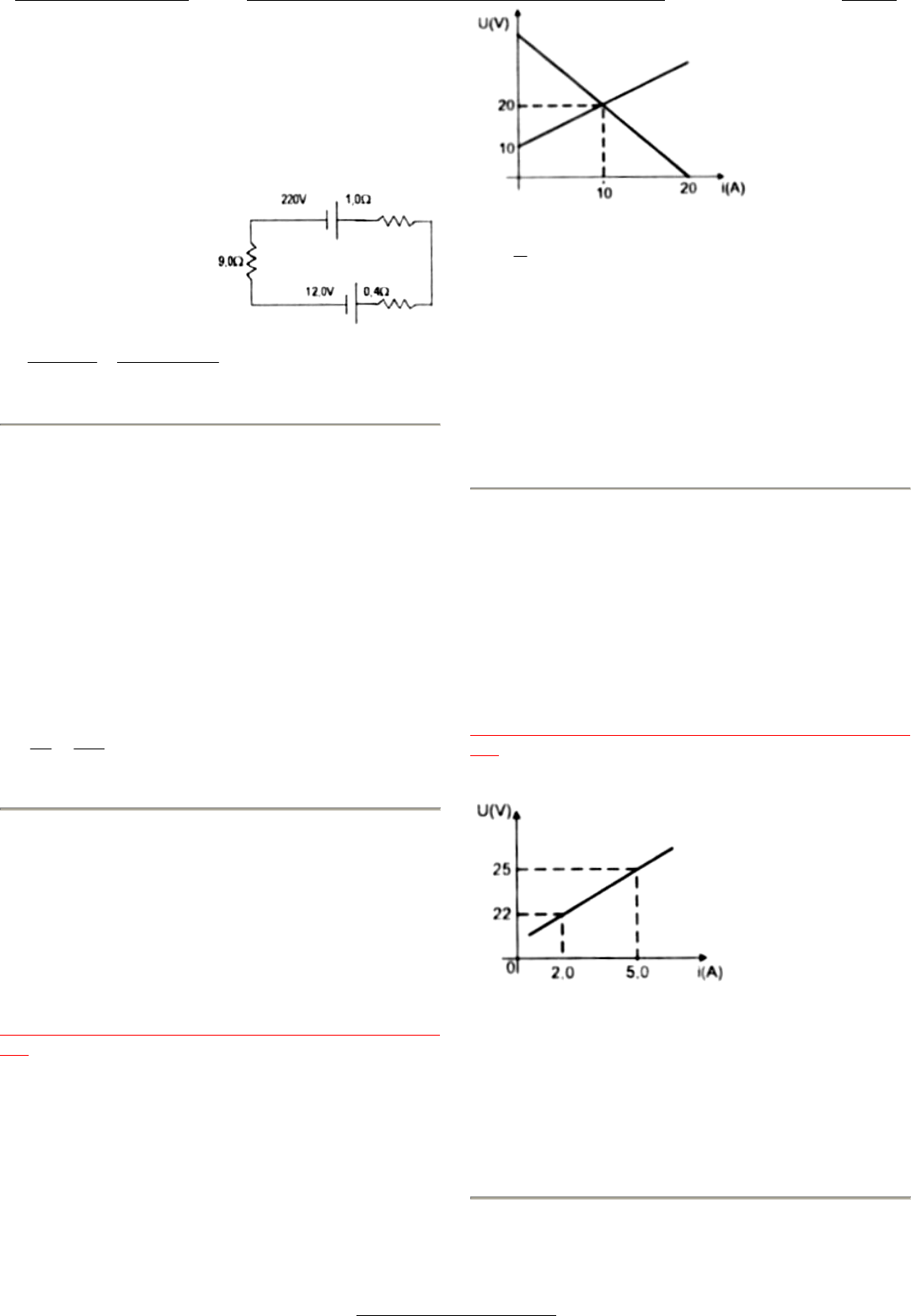 (NI:0194) Física 02 Tópico 06 Propostas Questão 04 Nível: fácil Assunto: 6.26.65 Utilizando a regra de Pouillet, agregando as resistências do circuito temos: A rrR i 20 0,14,00,9 12220 ' ' = ++ − = ++ − = εε Resposta: 20A (NI:0195) Física 02 Tópico 06 Propostas Questão 05 Nível: fácil Assunto: 6.26.65 Neste caso o motor deixa de ter fcem e toda potência será dissipada em sua resistência interna: A r Ui VUirU 55 2 110 ' ' 11052100''' === =⋅+=⇒⋅+= ε Resposta: 55A (NI: 0196) Física 02 Tópico 06 Vestibulares Questão 01 Nível: médio Assunto: 6.26.65 Obs.: Os gráficos das questões 01 e 02 estão troca- dos Observe o gráfico: Para o gerador temos o seguinte: Vrr rrirU r r icc 40202 102020 2020 ==⇒Ω=⇒ ⋅−=⇒⋅−= =⇒== ε ε εε Para o receptor temos: Ω=⇒⋅+=⇒⋅+= =⇒⋅+=⇒⋅+= 1'10'1020''' 10'0''10''' rrirU VrirU ε εεε Resposta letra (d) (NI: 0197) Física 02 Tópico 06 Vestibulares Questão 02 Nível: médio Assunto: 6.26.65 Obs.: Os gráficos das questões 01 e 02 estão troca- dos Observe o gráfico Podemos dispor de um sistema de duas equações a duas incógnitas para solução do problema: ⎩ ⎨ ⎧ ⋅+= ⋅+= ⋅+= 0,5''25 0,2''22 ''' r r irU ε ε ε Resolvendo o sistema temos: Vr 20'1' =⇒Ω= ε Resposta letra (c) 23 Prof. Sérgio Torres Caderno - 01 - Com Resoluções das Questões Física 15/05/2010 104/160