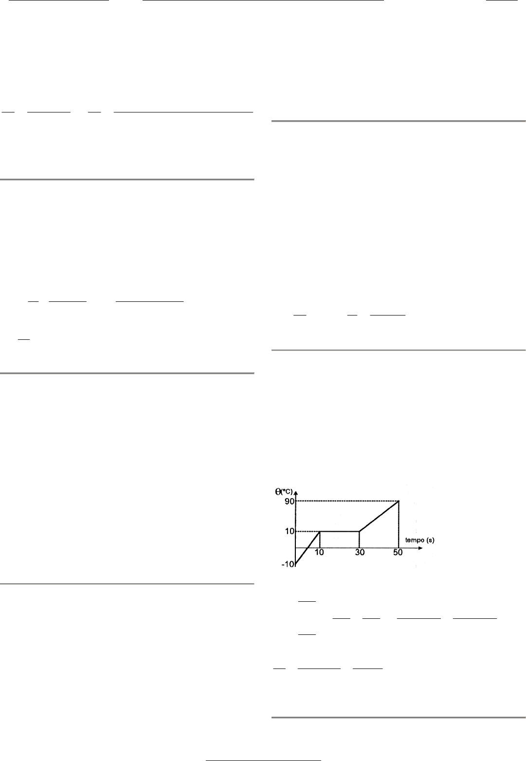 (NI: 0262) Física 03 Tópico 03 Vestibulares Questão 04 Nível: fácil Assunto: 5.22.49 A equação do fluxo de calor é dado por: ( )( ) calQ Q e Ak t Q 2 45 1003,6 0,8 3037104,2105 60 ⋅= ⇒ −−⋅⋅⋅⋅ =⇒ Δ⋅⋅ = Δ −θ Resposta: 603cal (NI: 0263) Física 03 Tópico 03 Vestibulares Questão 05 Nível: fácil Assunto: 5.22.49 Pela lei de Fourier temos: a) ( ) scal e Ak t Q /12 60 1090109,0 = −⋅⋅ =⇒ Δ⋅⋅ = Δ = φθφ b) Em um minuto temos: calQscalQ 720/12 60 =⇒==φ Respostas: a) 12cal/s; b) 720cal (NI: 0264) Física 03 Tópico 03 Vestibulares Questão 06 Nível: fácil Assunto: 5.22.50 a) Falsa – elas só ocorrem através de meio material b) Falsa – a irradiação é a maneira pela qual o calor do Sol atravessa o vácuo para aquecer a Terra c) Falsa – A condução térmica necessita de um meio material e a convecção que este meio seja fluido. d) Falsa – A única forma de propagação é por irradiação e) Verdadeira (Obs.: corrigir a letra (e) Convenção Convecção) Resposta letra (e) (NI:0265) Física 03 Tópico 04 Propostas Questão 01 Nível: médio Assunto: 5.21.47 A equação que procuramos necessita conter: o calor sen- sível para elevar a temperatura do gelo de –10ºC para 0ºC; o calor latente para fundir o gelo e finalmente o calor sensível para elevar a água proveniente do gelo à temperatura de 10ºC. Todo este calor é proveniente da água (1 litro) que inicialmente está a uma temperatura desconhecida. ( ) C cmcmLmcm QQQQ aaaaaagfgggg águageloáguafusãogelo º29 0101100010120080200105,0200 0 0 0 = ⇒=−⋅⋅+⋅⋅+⋅+⋅⋅ ⇒=Δ⋅⋅+Δ⋅⋅+⋅+Δ⋅⋅ ⇒=+ + + 0 − − θ θ θθθ Resposta letra (a) (NI:0266) Física 03 Tópico 04 Propostas Questão 02 Nível: médio Assunto: 5.21.47 O calor total será aquele necessário para derreter o gelo e aquecer a água proveniente dele a 100ºC, então: JcalQ cmLmQ aagfg 14400036000 100120080200 == ⇒⋅⋅+⋅=Δ⋅⋅+⋅= − θ Como a potência é 800W, temos: s P Qt t QP 180 800 144000 ===Δ⇒ Δ = Resposta letra (c) (NI:0267) Física 03 Tópico 04 Propostas Questão 03 Nível: alto Assunto: 5.21.48 Observe o gráfico: Temos que: 2,0 2020 1080 = ⋅ ⋅ = Δ⋅Δ Δ⋅Δ = Δ Δ/= Δ Δ/⇒ Δ = Δ ⇒ ⎪ ⎪ ⎩ ⎪⎪ ⎨ ⎧ Δ = Δ = LS SL L S L LLL S SSS L L S S L L S S t t c c t cm t cm t Q t Q t QP t Q P θ θ θθ Resposta: 0,2 8 Prof. Sérgio Torres Caderno - 01 - Com Resoluções das Questões Física 15/05/2010 148/160
