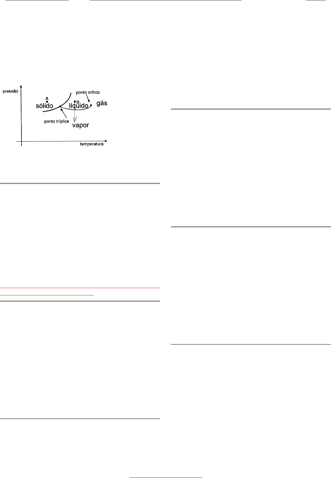 (NI:0283) Física 03 Tópico 05 Propostas Questão 01 Nível: fácil Assunto: 5.23.51 Observe o gráfico: Caso a substância simples for expandida isotermica- mente sua pressão cairá. Pelo gráfico vemos que ela passará do ponto de estado líquido para vapor. Resposta letra (e) (NI:0284) Física 03 Tópico 05 Propostas Questão 02 Nível: fácil Assunto: 5.23.51 Do ponto A para o B, a substância passa do estado sóli- do para o líquido, portanto fusão. Resposta letra (b) Obs.: colocar no enunciado que os pontos A e B referem-se a questão anterior. (NI:0285) Física 03 Tópico 05 Propostas Questão 03 Nível: médio Assunto: 5.23.51 Quando o líquido está em equilíbrio dinâmico com o seu vapor a pressão do vapor tem valor constante, porém há vaporização e condensação simultânea de mesma inten- sidade. Resposta letra (b) (NI: 0286) Física 03 Tópico 05 Vestibulares Questão 01 Nível: médio Assunto: 5.23.51 Ao aumentar a pressão sobre o gelo este entra em fusão pela característica anômala da mudança de fase do es- tado sólido para o líquido da água. Resposta letra (a) (NI: 0287) Física 03 Tópico 05 Vestibulares Questão 02 Nível: fácil Assunto: 5.23.51 Quanto menor a pressão menor o ponto de ebulição, como em lugares mais altos a pressão é menor e portan- to o ponto de ebulição também, concluímos que a altitu- de de A é maior que de B. Resposta letra (b) (NI: 0288) Física 03 Tópico 05 Vestibulares Questão 03 Nível: fácil Assunto: 5.23.51 Altitudes mais altas que o nível do mar possuem pres- são atmosférica menor. Com isso facilita a evaporação da água não se levando em conta a umidade relativa do ar. Resposta letra (c) 13 Prof. Sérgio Torres Caderno - 01 - Com Resoluções das Questões Física 15/05/2010 153/160