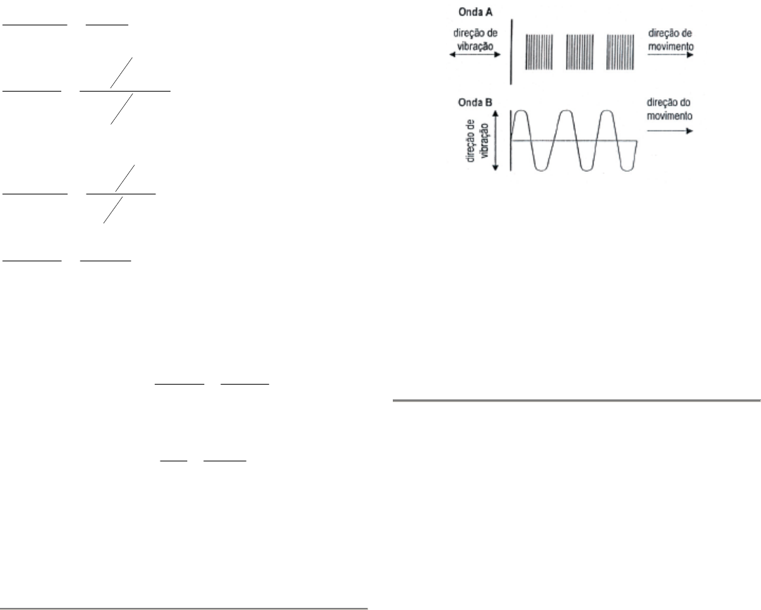 (NI: 0650) Caderno 02 Física 03 Tópico 06 vestibulares Questão 09 Nível: fácil Assunto: 9.35.96 00 – Falso. Demonstração a seguir: 2 108 103 104 103 500 30 15000 7 8 7 8 (min) (max) (min) (max) = ⋅ ⋅ ⋅ ⋅ = == − − visão visão ouvido ouvido f f f f 11 – Falso. Demonstração a seguir: 2 4000 8000 5000 15000 330 30 330 0 0 (min) (max) (min) (max) = Α Α = == visão visão ouvido ouvido λ λ λ λ 22 – Verdadeiro. Demonstração a seguir: Hzff Hzff visãovisão ouvidoouvido 14 7 8 7 8 (min)(max) (min)(max) 1075,3 108 103 104 103 14970 ⋅= ⋅ ⋅ − ⋅ ⋅ ⇒− =− −− 33 – Falso. Demonstração a seguir: m m visãovisão ouvidoouvido 777 (min)(max) (min)(max) 104104108 11 15000 330 30 330 −−− ⋅=⋅−⋅=− ≅−=− λλ λλ 44 – Falso. A razão é a maneira mais eficaz, uma vez que relaciona quantas vezes uma grandeza é maior que a outra. Sendo a resposta uma grandeza adimensional Resposta: FFVFF (NI: 0651) Caderno 02 Física 03 Tópico 06 vestibulares Questão 10 Nível: fácil Assunto: 9.35.96 Observe a figura a seguir: I. Vê-se claramente que as zonas de compressão da onda longitudinal correspondem aos vales da onda transver- sal, portanto ambas possuem o mesmo comprimento. II. Correto. As ondas sonoras são caracterizadas por zonas de compressão e zonas de rarefação. (o que fazem vibrar o tímpano, resultando no sentido da audição) III. Falso. A velocidade é a relação entre o comprimento de onda e o seu período. Caso o comprimento de uma das ondas aumente, não se pode preservar o período e ainda assim determinar que ambas possuam a mesma velocidade. Resposta letra (a) 29 Prof. Sérgio Torres Apostila 02 Física Pura 15/05/2010 180/181
