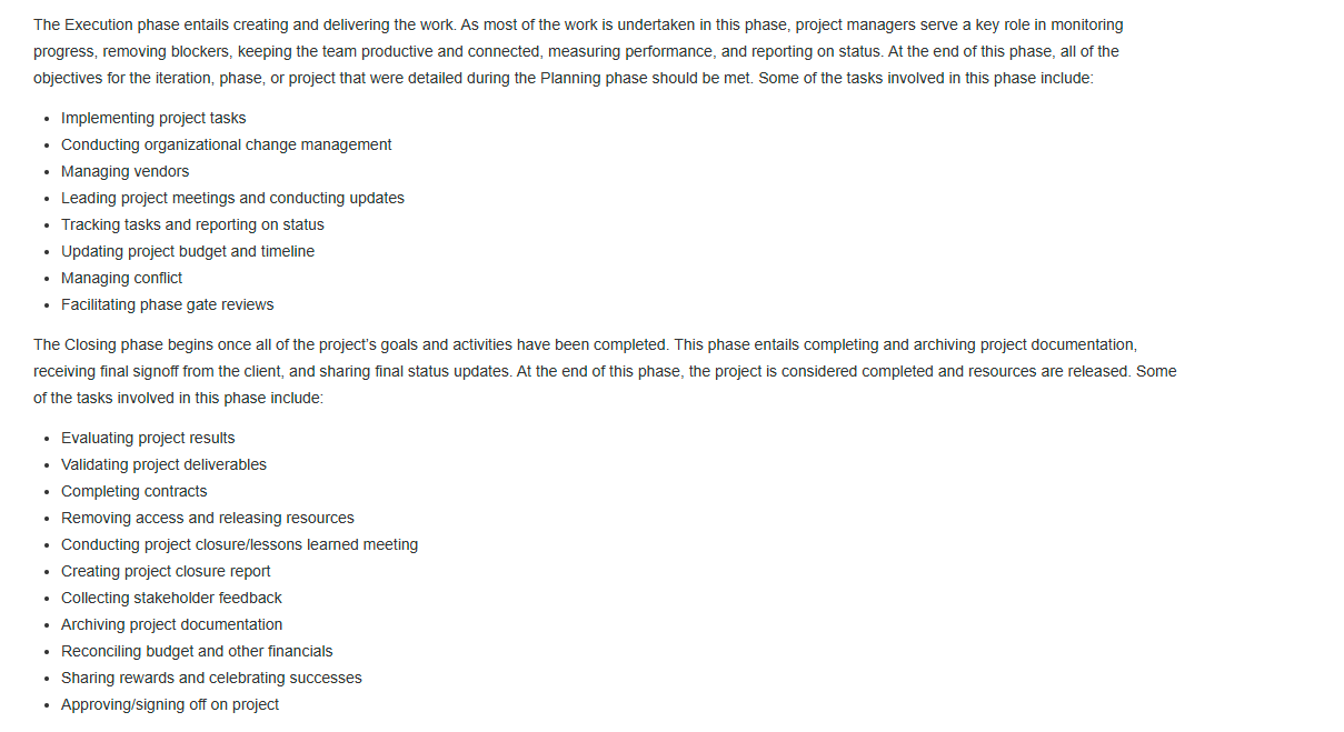 The Execution phase entails creating and delivering the As most of the work is undertaken in this phase, project managers serve a key role in monitoring progress, removing blockers, keeping the team productive and connected, measuring and reporting on status. At the end of this phase, all of the objectives for the iteration, phase, or project that were detailed during the Planning phase should be met. Some of the tasks involved in this phase include: Implementing project tasks Conducting organizational change management Managing vendors Leading project meetings and conducting updates Tracking tasks and reporting on status Updating project budget and timeline Managing conflict Facilitating phase gate reviews The Closing phase begins once all of the project's goals and activities have been completed This phase entails completing and archiving project documentation, receiving final signoff from the client, and sharing final status updates. At the end of this phase, the project is considered completed and resources are released Some of the tasks involved in this phase include: Evaluating project results Validating project deliverables Completing contracts Removing access and releasing resources Conducting project closure/lessons learned meeting Creating project closure report Collecting stakeholder feedback Archiving project documentation Reconciling budget and other financials Sharing rewards and celebrating successes Approving/signing off on project