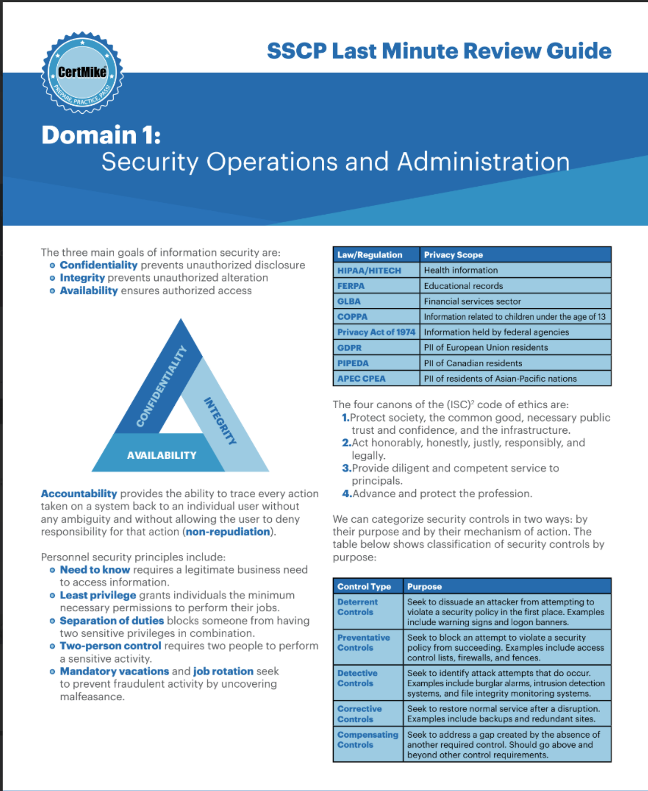SSCP Last Minute Review Guide CertMike Domain 1: Security Operations and Administration The three main goals of information security are: Law/Regulation Privacy Scope Confidentiality prevents unauthorized disclosure HIPAA/HITECH Health information Integrity prevents unauthorized alteration FERPA Educational records Availability ensures authorized access GLBA Financial services sector COPPA Information related to children under the age of 13 Privacy Act of 1974 Information held by federal agencies GDPR of European Union residents PIPEDA PII of Canadian residents APEC CPEA PII of residents of Asian-Pacific nations The four canons of the code of ethics are: 1.Protect society, the common good, necessary public trust and confidence, and the infrastructure. 2.Act honorably, honestly, justly, responsibly, and AVAILABILITY legally. 3.Provide diligent and competent service to principals. Accountability provides the ability to trace every action 4.Advance and protect the profession. taken on a system back to an individual user without any ambiguity and without allowing the user to deny We can categorize security controls in two ways: by responsibility for that action (non-repudiation). their purpose and by their mechanism of action. The table below shows classification of security controls by Personnel security principles include: purpose: Need to know requires a legitimate business need to access information. Control Type Purpose Least privilege grants individuals the minimum Deterrent Seek to dissuade an attacker from attempting to necessary permissions to perform their jobs. Controls violate a security policy in the first place. Examples Separation of duties blocks someone from having include warning signs and logon banners. two sensitive privileges in combination. Preventative Seek to block an attempt to violate a security Two-person control requires two people to perform Controls policy from succeeding. Examples include access a sensitive activity. control lists, firewalls, and fences. Mandatory vacations and job rotation seek Detective Seek to identify attack attempts that do occur. to prevent fraudulent activity by uncovering Controls Examples include burglar alarms, intrusion detection malfeasance. systems, and file integrity monitoring systems. Corrective Seek to restore normal service after a disruption. Controls Examples include backups and redundant sites. Compensating Seek to address a gap created by the absence of Controls another required control. Should go above and beyond other control requirements.SSCP Last Minute Review Guide CertMike Domain 1: Security Operations and Administration The next table shows the classification of security Security frameworks provide templates for security controls by their mechanism of action: activities. These include COBIT, NIST CSF, and ISO 27001/2. Control Type Mechanism of Action Due care is taking reasonable steps to protect the Technical Controls Use technological means to achieve control objectives. Examples include session timeout interest of the organization. Due diligence ensures and password aging. those steps are carried out. Physical Controls Use real-world physical means to achieve control objectives. Examples include Security governance is carried out through mantraps, cameras, and locks. Policies which state high-level objectives Administrative Use policy and procedure mechanisms to (mandatory compliance). Controls achieve control objectives. Examples include Standards which state detailed technical security policies and standards, procedures, requirements (mandatory compliance). and baselines. Procedures which provide step-by-step processes (mandatory compliance). Change and configuration management processes Guidelines which offer advice and best practices ensure that organizations have standardized processes (optional compliance). in place for requesting changes, implementing those changes, and releasing code to productions. Organizations are subject to a wide variety of legal and Request control manages, evaluates, and prioritizes regulatory compliance obligations from: inbound requests from customers Criminal laws that may involve prison or fines. Change control grants permission for developers to Civil laws that regulate non-criminal disputes. make changes to application code Administrative laws set by government agencies. Release control moves code from the development Regulations from industry bodies. environment into production Security professionals are responsible for assessing and In a well-managed environment, change processes ensuring the organization's compliance with internal are designed to enforce segregation of duties so policies and external laws, regulations, and contractual that developers cannot move their own code into obligations. production. Asset management systems track hardware, software, and data assets throughout their lifecycle. The stages of this lifecycle include: Process, planning, design, and initiation Development or acquisition of the asset Inventory and licensing Implementation and assessment Operation and maintenance Archiving and retention (per requirements) Disposal and destructionSSCP Last Minute Review Guide CertMike Domain 2: Access Controls The core activities of identity and access management are: Single sign-on allows the use of a single account Identification where a user makes a claim of identity. across multiple systems without requiring repeated logins. Authentication where the user proves the claim of Federation shares account information across systems identity. belonging to different service providers. Authorization where the system confirms that the user is permitted to perform the requested action. The Security Assertion Markup Language (SAML) allows browser-based single sign on across a variety of In access control systems, we seek to limit the access systems. There are three entities in a SAML that subjects (e.g. users, applications, processes) have The principal is the end u