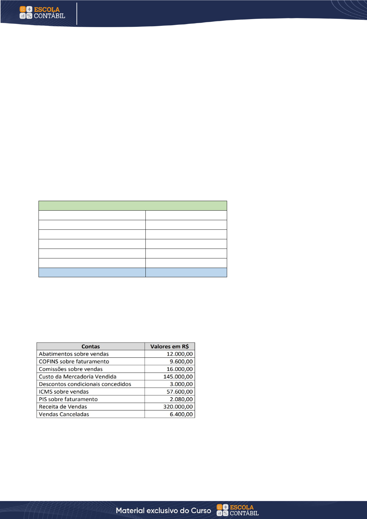 98 CADERNO 300 QUESTÕES COMENTADAS COMENTADAS CADERNO 300 QUESTÕES COMENTADAS COMENTADAS CADERNO 300 QUESTÕES EXAME DE SUFICIÊNCIA Mas quantas unidades a companhia produziu, nesta hipótese, 90.000 ou 80.000? Apenas 80.000. Isso significa que teremos custos fixos para os produtos de R$ 80.000 x 3 = R$ 240.000,00. Então, este é o custo que você teve EFETIVAMENTE. Ocorre que os seus custos fixos reais são de R$ 270.000,00. Portanto, faltam R$ 30.000,00. Estes R$ 30.000,00 representam a variação do volume de produção, que, como a questão disse, são distribuídos para o CPV. Então, fica assim: - Custo fixo dos produtos vendidos (70.000 x 3) 210.000 - Variação do volume de produção 30.000 Custos fixos apropriados 240.000 Vamos montar a DRE: Demonstração do resultado do exercício Receita de vendas (70.000 x 15) R$ 1.050.000,00 (-) Custo variável (70.000 x 4) -R$ 280.000,00 (-) Despesa variável (70.000 x 1) -R$ 70.000,00 (-) Custos fixos -R$ 210.000,00 (-) Despesas fixas -R$ 50.000,00 (-) Variação no volume de produção -R$ 30.000,00 Resultado operacional R$ 410.000,00 GABARITO: B. 74. (Consulplan/Exame CFC/2022.2) Uma empresa comercial apresentou os seguintes saldos em suas contas de resultado em 31/12/2021: Considerando exclusivamente as informações apresentadas e de acordo com a Lei nº 6.404/1976 – Lei das Sociedades por Ações, os valores da Receita Líquida de Vendas e do Lucro Bruto evidenciados na Demonstração do Resultado em 31/12/2021 correspondem, respectivamente, a: