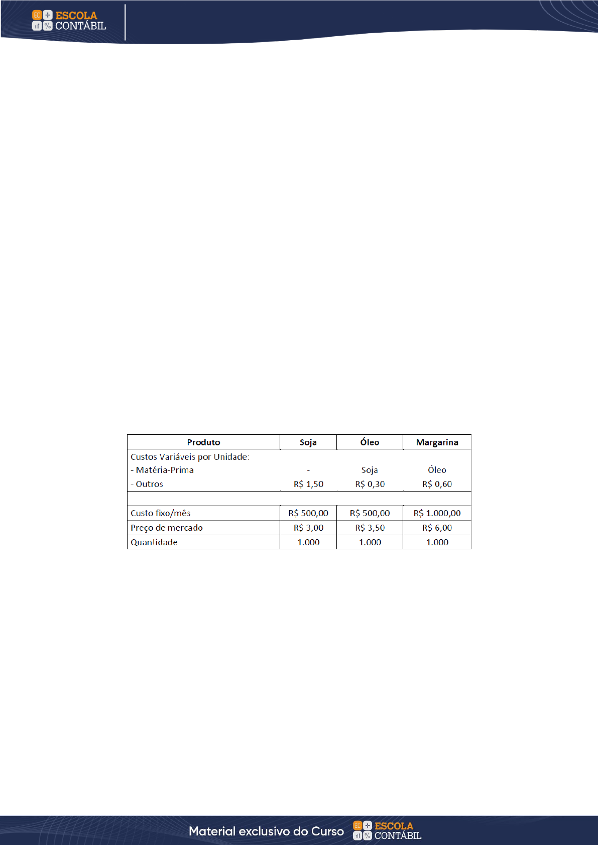 126 CADERNO 300 QUESTÕES COMENTADAS COMENTADAS CADERNO 300 QUESTÕES COMENTADAS COMENTADAS CADERNO 300 QUESTÕES EXAME DE SUFICIÊNCIA Errado. O custo de produção foi de R$ 200.000,00. C) O saldo de estoque de produtos em elaboração no final do mês de janeiro de 2019 foi superior a R$ 100.000,00. Errado. O saldo foi de R$ 96.000,00. D) O saldo final do estoque de produtos acabados da empresa no final do mês de janeiro de 2019 foi superior a R$ 200.000,00. Correto. O valor foi de R$ 224.000,0. GABARITO: D. Métodos de custeamento 93. (Consulplan/Exame CFC/2019.2) A missão da controladoria é assegurar a otimização do resultado econômico da organização, com a responsabilidade de tornar as informações úteis para breves ou futuras e importantes mudanças no cenário empresarial. O centro de responsabilidade é uma parte, segmento ou subunidade de uma organização, cujo gerente é responsável por um conjunto específico de atividades. A indústria de fabricação de soja e seus derivados avalia o desempenho de seus três centros de responsabilidades (soja, óleo e margarina). Para esse fim, utiliza o Preço de Transferência nas transações internas. Para a determinação do Preço de Transferência, a empresa considera o quanto pagaria no mercado para adquirir prontos seus produtos intermediários. Considerando os dados a seguir, o controller pretende identificar se todos os negócios da empresa são lucrativos. Observações: -A soja não tem matéria-prima; -A soja é utilizada como matéria-prima para fabricar o óleo, que é utilizado como matéria-prima para fabricar a margarina; -Não será considerada a alíquota de Imposto de Renda para o cálculo do resultado operacional de cada unidade de negócio. Ao analisar os dados e verificar o resultado operacional de cada unidade de negócio, o controller concluiu que: A) A soja e o óleo são negócios lucrativos. B) A soja e a margarina são negócios lucrativos.