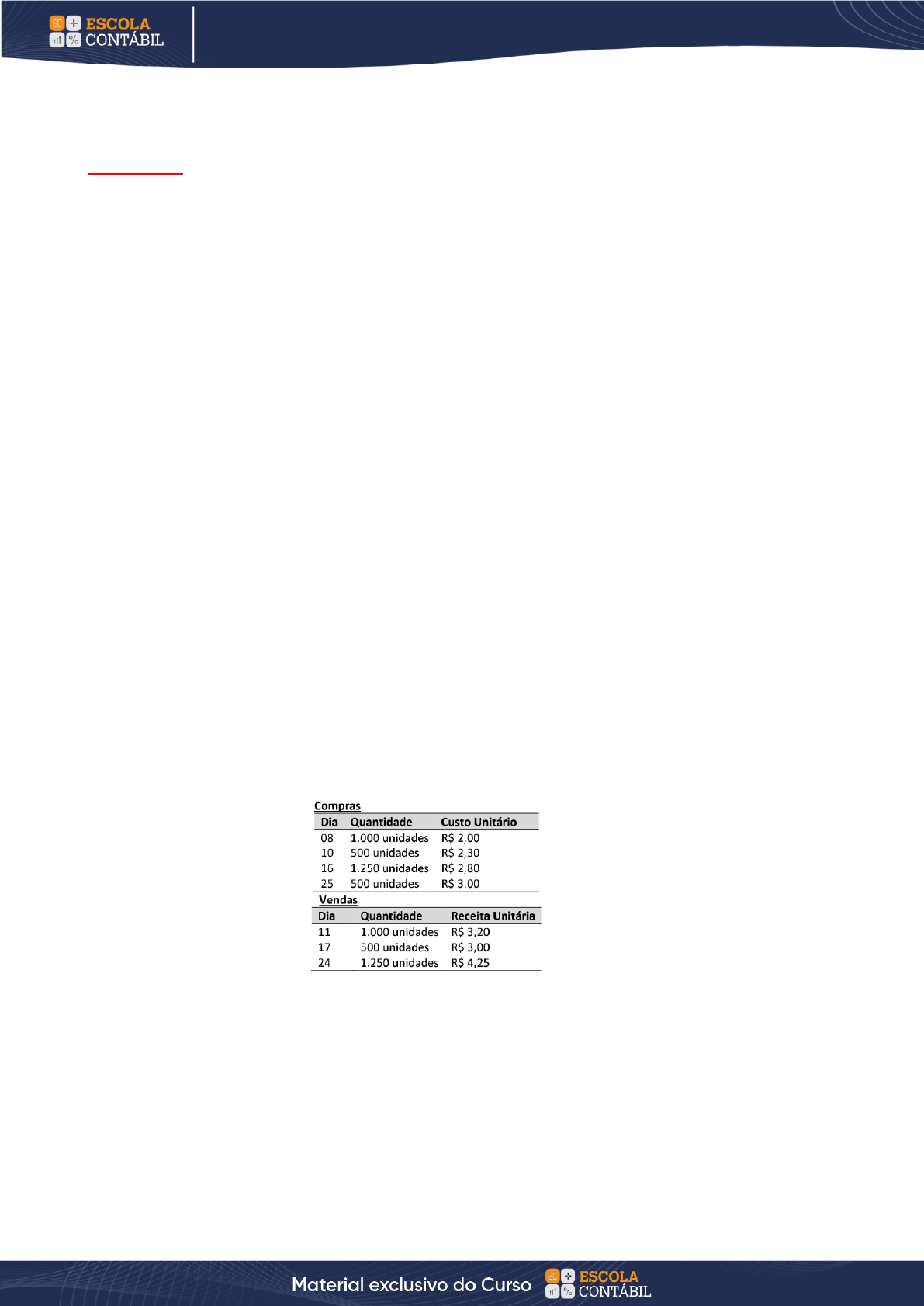 145 CADERNO 300 QUESTÕES COMENTADAS COMENTADAS CADERNO 300 QUESTÕES COMENTADAS COMENTADAS CADERNO 300 QUESTÕES EXAME DE SUFICIÊNCIA Crédito Juros a Apropriar (DRE) R$ 3.045,30 Comentários: A aplicação foi de R$ 75.000,00 e, ao término, resgataremos capital e juros. O cálculo dos juros é feito da seguinte forma: Montante = Capital x (1 + 𝑖)𝑛 Montante = Valor futuro Capital = Valor presente I = Taxa de juros N = Período A questão pede os juros de 2020. Neste caso, estamos falando de dois meses. Montante = 75.000 x (1,01)2 = 76.507,50 Os juros até o momento, portanto, serão de 76.507,50 – 75.000,00 = R$ 1.507,50 A única alternativa com essa resposta é a letra a. O lançamento contábil será: Débito Juros a Apropriar (AC) Crédito Receita Financeira (DRE) R$ 1.507,50 Gabarito →A. 107. (Consulplan/Exame CFC/2022.1) As seguintes operações de compras e de vendas da mercadoria A foram realizadas por uma sociedade empresária no mês de fevereiro de 2022: O valor do saldo inicial em estoque de mercadorias no mês de fevereiro de 2022 corresponde a zero. A sociedade empresária utiliza o critério do custo médio ponderado como critério de valoração do estoque da mercadoria A. Considerando exclusivamente as informações apresentadas e o disposto na NBC TG 16 (R2) – Estoques, assinale o valor do custo das mercadorias vendidas apurado no encerramento do mês de fevereiro de 2022. A) R$ 6.508,33