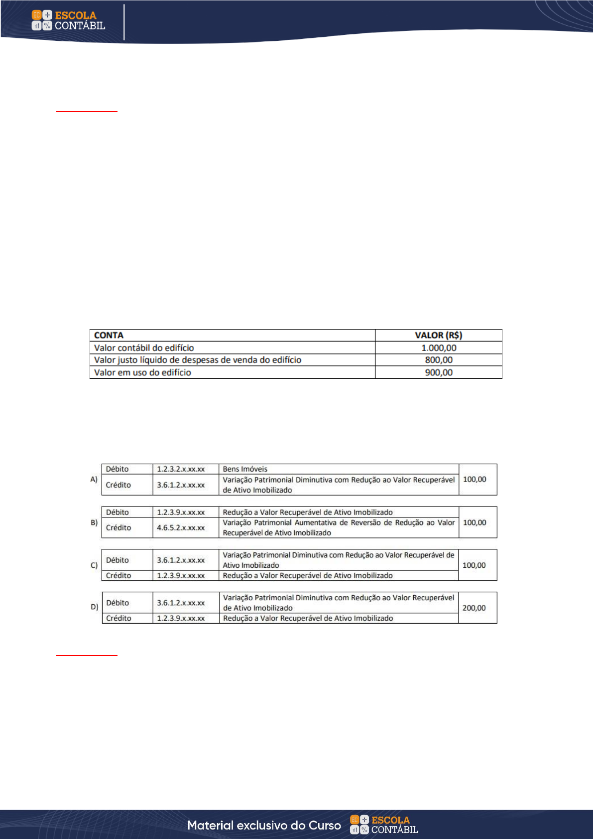 173 CADERNO 300 QUESTÕES COMENTADAS COMENTADAS CADERNO 300 QUESTÕES COMENTADAS COMENTADAS CADERNO 300 QUESTÕES EXAME DE SUFICIÊNCIA Comentários: A questão pede o registro contábil do empenho (natureza de informação orçamentária). Logo, conforme vimos em aula, as contas que mencionam contrato ou disponibilidade por destinação de recursos fazem parte da natureza de informação de CONTROLE. As contas quem mencionam serviços de terceiros e fornecedores a pagar são do passivo, ou seja, contas que fazem parte da natureza de informação PATRIMONIAL. Sabendo isso, nosso gabarito é débito em crédito disponível e crédito em crédito empenhado a liquidar. Gabarito → A. 129. (Consulplan/Exame CFC/2021.1) Um edifício pertencente a uma entidade do setor público foi danificado por um incêndio. Após esse acontecimento, a entidade apresentou as seguintes informações: Com base nessas informações e considerando o disposto na NBC TSP 09 – Redução ao valor recuperável de ativo não gerador de caixa, assinale a alternativa que descreve o registro contábil, pela informação de natureza patrimonial, do ajuste ao valor recuperável do edifício. Comentários: Questão que cobrou a NBC TSP 09. A ideia é saber fazer o teste de recuperabilidade. De acordo com a Norma supracitada, item 25, o ativo não gerador de caixa é objeto de redução ao valor recuperável quando o seu valor contábil EXCEDER o seu valor recuperável de serviço. E o que seria esse valor recuperável de serviço? É o MAIOR montante entre o valor justo líquido de despesas de venda do ativo e o seu valor em uso.