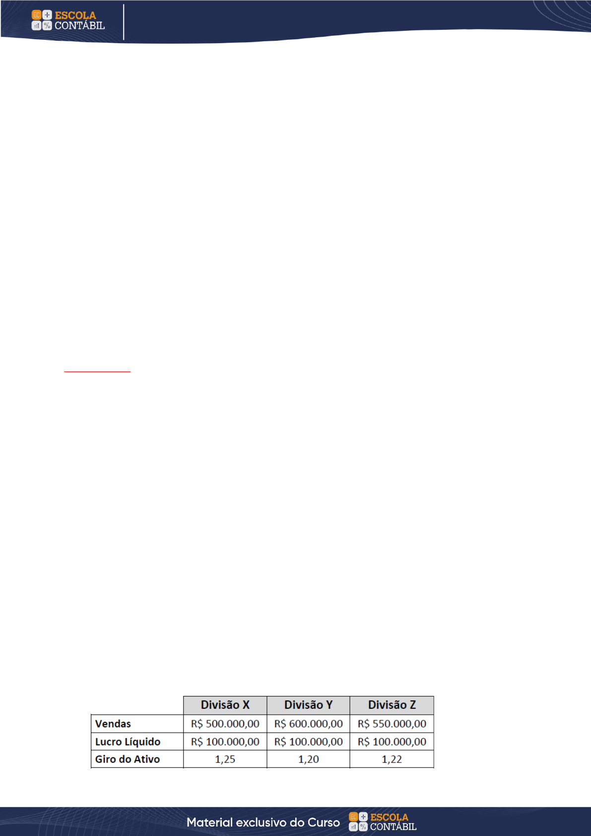 189 CADERNO 300 QUESTÕES COMENTADAS COMENTADAS CADERNO 300 QUESTÕES COMENTADAS COMENTADAS CADERNO 300 QUESTÕES EXAME DE SUFICIÊNCIA Gabarito → C. 145. (Consulplan/Exame CFC/2021.2) Utilizando-se os indicadores de atividade da Contabilidade Gerencial, podemos construir um indicador em número de dias do prazo médio, em que se desenvolve todo o processo produtivo, comercial e financeiro da empresa. Encontre os dias do ciclo operacional e financeiro de uma determinada empresa, a partir dos dados a seguir: • Prazo médio de recebimento: 50 dias; • Prazo médio de estocagem: 120 dias; e, • Prazo médio de pagamento: 36 dias. É possível concluir que os dias do ciclo operacional e do ciclo financeiro da empresa são, respectivamente: A) 50 dias e 36 dias. B) 134 dias e 170 dias. C) 170 dias e 134 dias. D) 170 dias e 206 dias. Çomentários: O ciclo operacional é o período entre a compra da mercadoria e o recebimento do valor. O ciclo financeiro é o período entre o pagamento ao fornecedor e o recebimento do cliente. Portanto, o ciclo operacional é o período de estocagem (período em que a mercadoria comprou e quanto tempo fica no estoque) + prazo médio de recebimento (período entre a venda e o recebimento). 120 + 50 = 170. Já o ciclo financeiro é o ciclo operacional – prazo médio de pagamento. 170 – 36 = 134 dias. Gabarito → C. 5. CONTROLADORIA 146. (Consulplan/Exame CFC/2020.1) Um centro de responsabilidade é um segmento da empresa onde existe um gestor responsável pelo seu desempenho. Os centros de responsabilidade podem ser organizados de três formas: Centros de Custo, Centros de Lucro e Centros de Investimento. A empresa PERSIAL Ltda. possui três divisões operacionais. Os