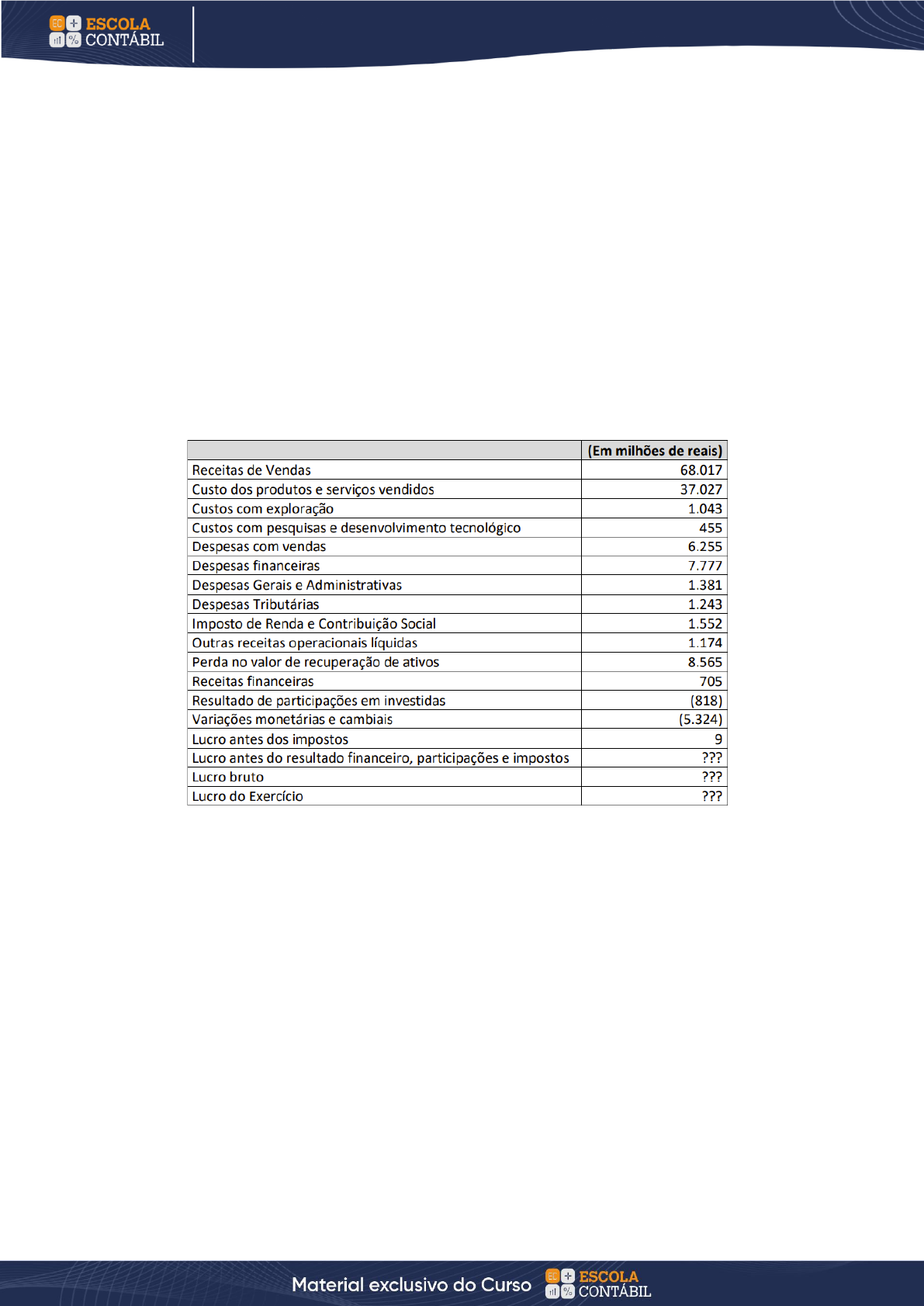 221 CADERNO 300 QUESTÕES EXAME DE SUFICIÊNCIA C)Para integral distribuição dos lucros, o microempresário deve manter escrituração contábil que evidencie seu lucro efetivo. Correto. Este é o nosso gabarito. D)A distribuição de lucros para empresas do Simples é feita sob as mesmas regras utilizadas para o regime do Lucro Presumido. Errado. A regra é distinta, posto que empresas do lucro presumido têm uma série a mais de obrigações das mais diversas naturezas, bem como aspectos distintos. Gabarito → C. 172. (Consulplan/Exame CFC/2022.1) Ao iniciar os trabalhos de auditoria, João analisou detidamente os documentos que lhe foram disponibilizados. Os números existentes na Demonstração de Resultado foram os seguintes: Considerando que João é um auditor extremamente consciente e profissional, atento às Normas Brasileiras de Contabilidade e às disposições da Lei nº 6.404/1976, ao analisar referidos números, certamente, ele concluirá que: A) O “Lucro Bruto” é de R$ 123.962 milhões. B) O “Lucro do Exercício” é de R$ 6.246 milhões. C) O valor do “Lucro antes dos impostos” é de R$ 37 milhões e não de R$ 9 milhões como afirmado. D) O valor do “Lucro antes do resultado financeiro, participações e impostos” é de R$ 13.223 milhões.