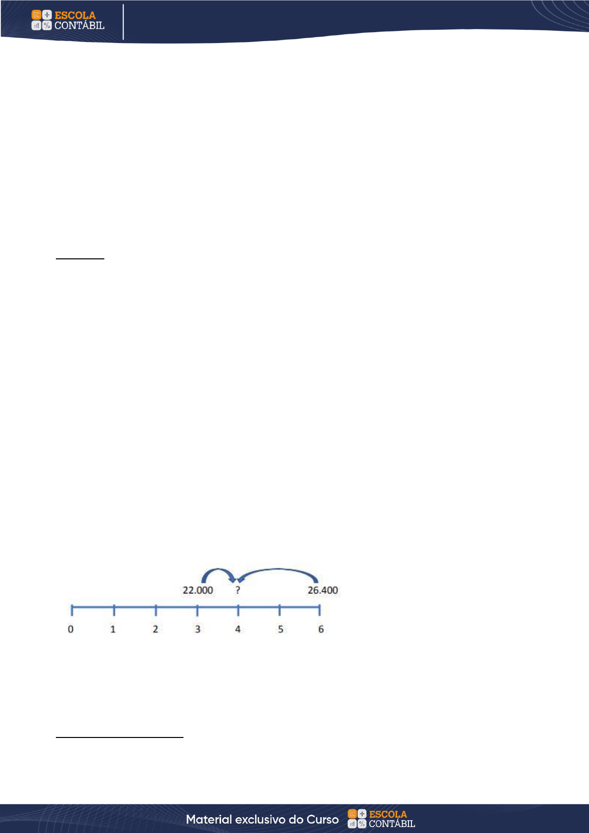 227 CADERNO 300 QUESTÕES EXAME DE SUFICIÊNCIA Se a dívida está muito alta, bancos relutarão em emprestar para a companhia. Com efeito, outras formas de captação (como ceder quotas da companhia, entre outras) serão sugeridas. A letra d está correta. GABARITO: ANULADA (FORA DO EDITAL) 177. (Consulplan/Exame CFC/2022.1) Um administrador de empresas acumulou duas dívidas após investimentos malsucedidos. A primeira dívida possui o montante de R$22.000,00 e deve ser quitada em três meses. A segunda dívida é de montante 20% maior que a primeira e seu valor deve ser pago no fim de seis meses. Considerando uma taxa de juros simples mensal de 5%, qual o valor do pagamento único que liquide as duas dívidas após 4 meses? Considere: Não serão aplicadas quaisquer penalidades por atraso, apenas cobrança dos juros devidos. Pagamentos adiantados terão seus juros devidamente descontados. A) R$44.953,38 B) R$47.100,00 C) R$49.992,38 D) R$52.140,00 Para resolver essa questão, utilizaremos a fórmula da capitalização simples: VF = VP ( 1 + i x n) Na situação apresentada, temos duas dívidas em momentos diferentes na linha do tempo: R$22.000,00 no terceiro mês, e R$26.400,00 no sexto mês (20% maior que a primeira): Dívida 2 = Dívida 1 + 20% Dívida 2 = 22.000 + (0,20 x 22.000) Dívida 2 = 22.000 + 4.400 Dívida 2 = 26.400 Dessa forma, precisamos encontrar: o Valor Futuro (VF) da Dívida 1 no mês 4 (1 mês depois) e o Valor Presente (VP) da Dívida 2 no mês 4 (2 meses antes). Valor da Dívida 1 no 4º mês: VF = VP (1 + i x n)