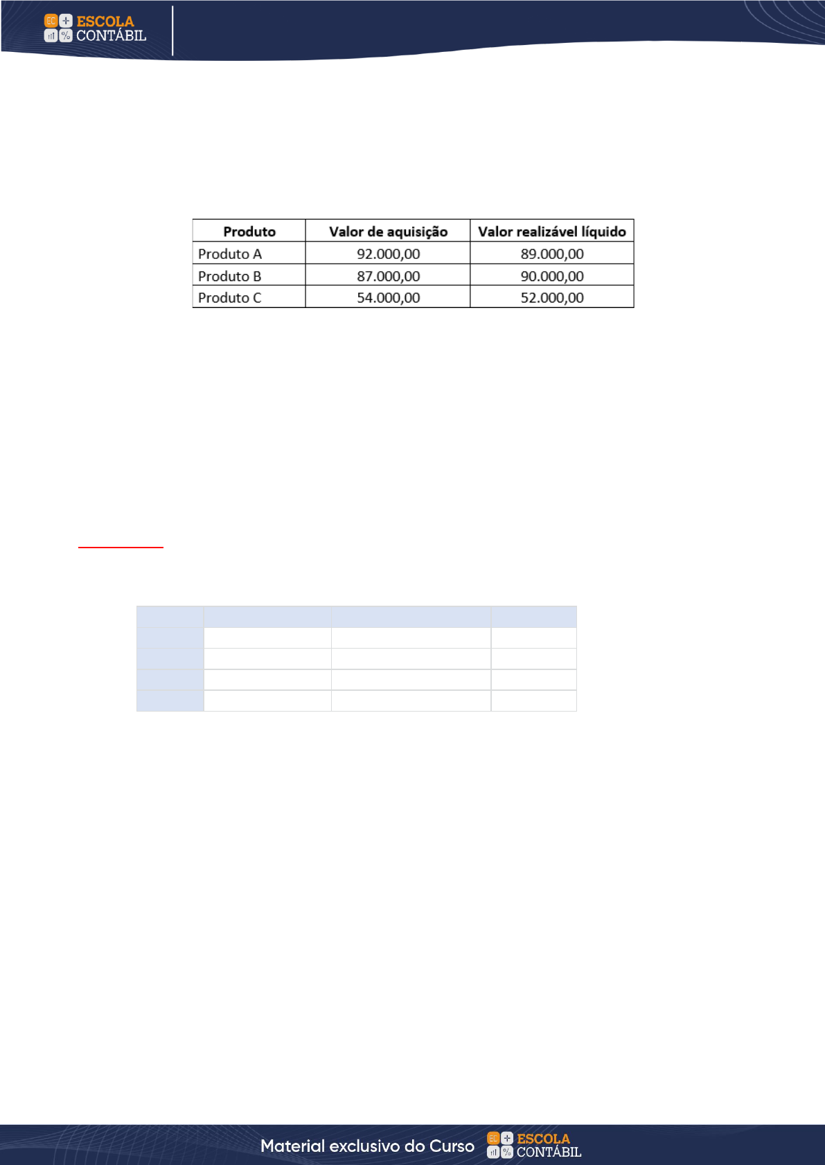 Uma empresa comercial revendia três tipos de produtos. Em 31/12/2019 apurou a seguinte situação sobre