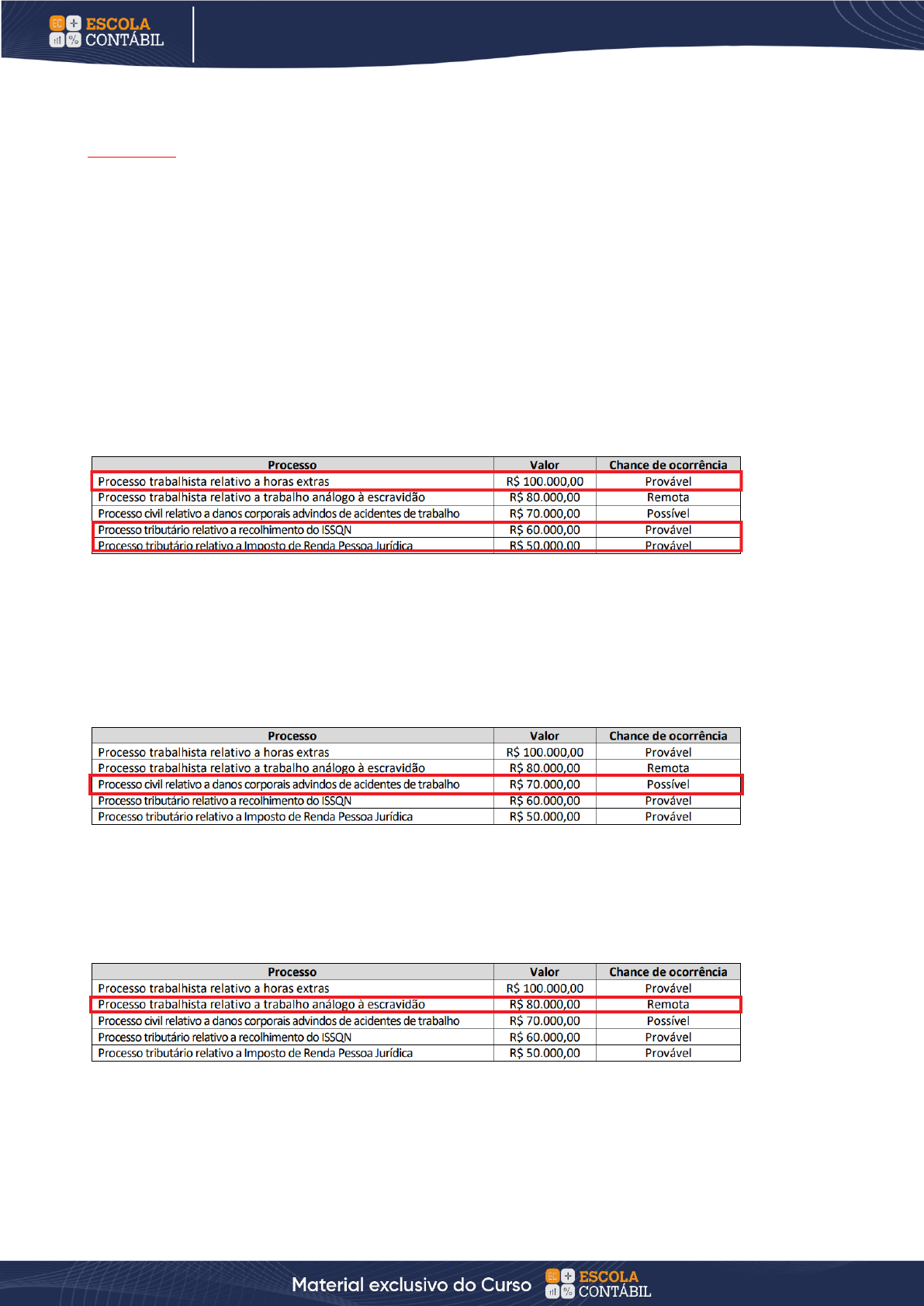319 CADERNO 300 QUESTÕES EXAME DE SUFICIÊNCIA Comentário: Questão, em tese, bem tranquila! Basta ver quais são as saídas de recursos julgadas prováveis. Para essa, teríamos a constituição de provisão para contingências, no passivo. As saídas possíveis figuram o que conhecemos por passivo contingente. Neste caso, a contabilização não é feita, divulgando-se apenas em notas explicativas. Para a probabilidade de saída de recursos remota, não contabilizamos e nem divulgamos em notas explicativas. Tema corriqueiramente previsto no CFC De A a Z. Teríamos o seguinte: Constituição de provisões: Reconhecemos, assim, o valor de R$ 210.000,00 para provisões no passivo. Divulgação de passivo contingente. Já a divulgação de passivo contingente, se dará apenas para os processos oriundos de acidentes de trabalho, no valor de R$ 70.000,00. Não divulga, nem contabiliza. Por fim, para o processo relativo a trabalho análogo à escravidão não precisamos nem divulgar nem contabilizar. Agora, vamos analisar as alternativas. A) Deverá reconhecer como provisão o valor de R$ 280.000,00 dos processos. Incorreto. O valor a ser reconhecido como provisão é de R$ 210.000,00. Contudo, este, erroneamente, foi o gabarito da banca. Comentamos esta questão ainda com gabarito preliminar. Acreditamos que, com o recurso, haja alteração.