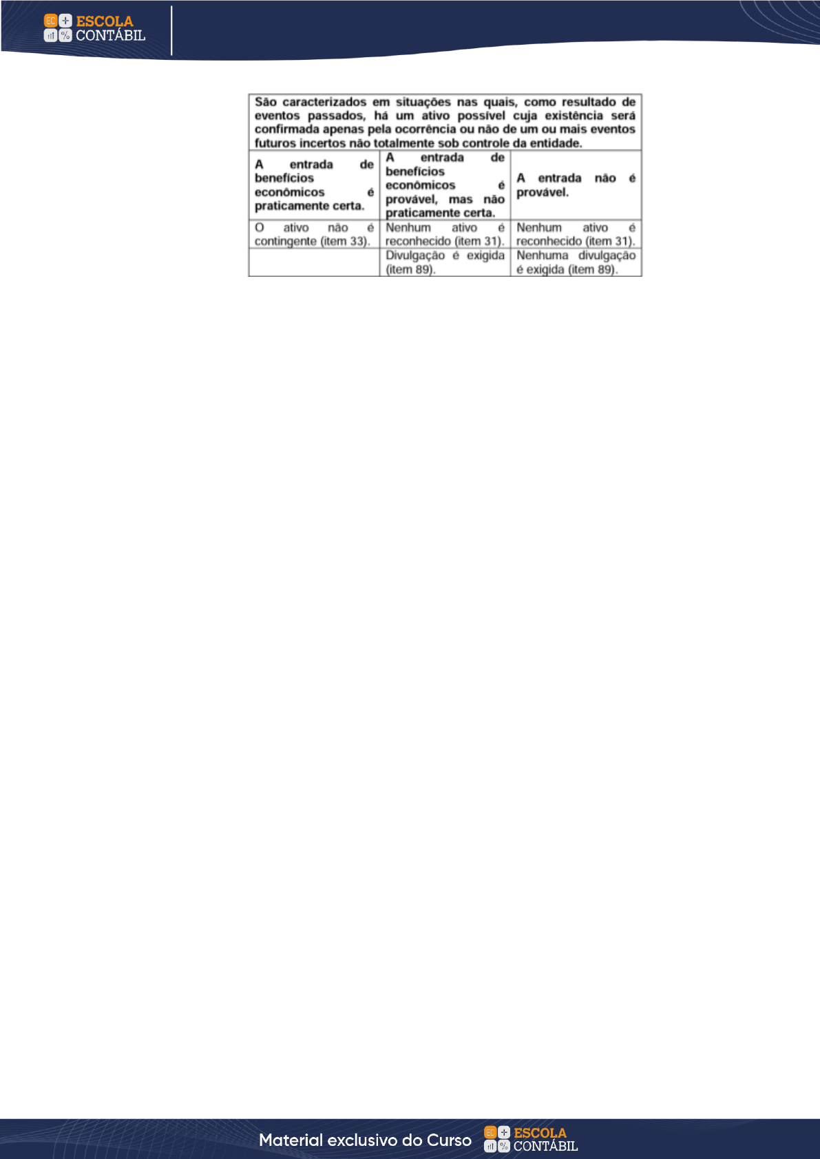 321 CADERNO 300 QUESTÕES EXAME DE SUFICIÊNCIA Para o ativo: - Entrada de recursos praticamente certa: contabiliza (mas não é ativo contingente). - Entrada de recursos provável: não contabiliza, mas divulga. - Entrada de recursos improvável: não contabiliza, nem divulga. Portanto, na questão em tela, estamos diante da última situação e o gabarito é a letra a: não deve proceder a qualquer registro contábil em contas patrimoniais, nem efetuar qualquer tipo de divulgação em notas explicativas. GABARITO: A. 253. (Consulplan/Exame CFC/2022.2) Em reunião com o departamento de contabilidade, o advogado de determinada empresa informa à chefia responsável, que, no último mês, a empresa foi notificada da existência de três ações judiciais, cujas características são: Ação de natureza trabalhista, ajuizada por ex-funcionário que alega o não recebimento de verbas. O advogado julga provável que será necessário desembolsar, até o encerramento do exercício seguinte, o valor de R$ 15.000,00, baseado em decisões recentes de casos semelhantes. Ação de natureza fiscal, no valor de R$ 9.000,00, ajuizada pela Prefeitura Municipal, que alega erro na base de cálculo do Imposto sobre Serviços recolhido pela empresa no último ano. O advogado afirma ser possível uma saída de recursos, mas não sabe estimar com confiança o prazo de sua ocorrência. Ação de natureza ambiental, movida pela autarquia de água e esgoto do município, que alega descarte irregular de lixo da empresa, e solicita indenização de R$ 14.000,00. O advogado afirma que a probabilidade de saída de recursos em decorrência deste litígio é remota, quase nula. Considerando o exposto e com base na NBC TG 25 (R2) – Provisões, Passivos Contingentes e Ativos Contingentes, assinale a afirmativa correta. O contador deve proceder ao reconhecimento de um passivo exigível de R$ 15.000,00, além de constituir provisão no Passivo Não Circulante no valor de R$ 23.000,00. As ações judiciais descritas nos itens I, II e III configuram-se como passivos contingentes; portanto, não é necessária qualquer provisão ou divulgação em Notas Explicativas. O procedimento a ser adotado pelo contador, em conformidade com a Norma citada, é o reconhecimento imediato de provisão no Passivo Circulante, no valor total de R$ 38.000,00. A ação descrita no item I requer a constituição de uma provisão, no Passivo Circulante, no valor de R$ 15.000,00, enquanto as ações descritas nos itens II e III devem ser consideradas Passivos contingentes e,