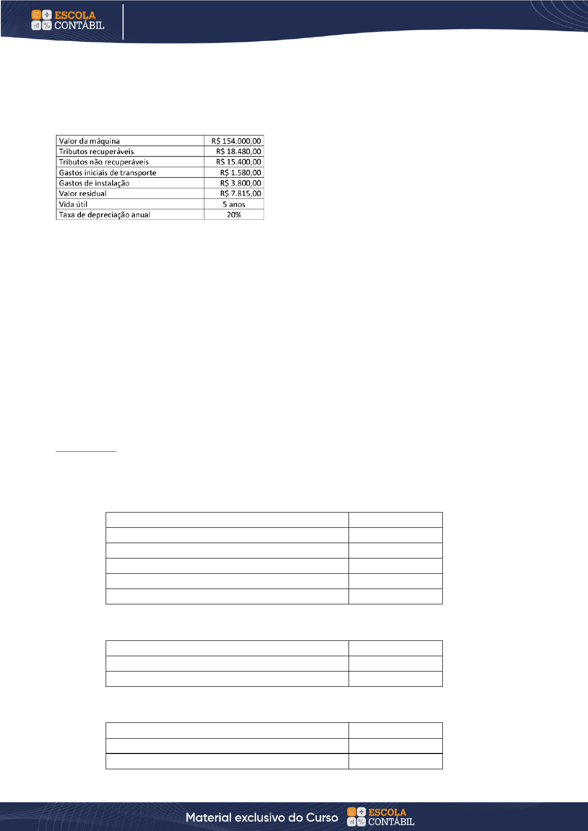 333 CADERNO 300 QUESTÕES EXAME DE SUFICIÊNCIA 262. (Consulplan/Exame CFC/2022.1) Uma sociedade empresária adquiriu uma máquina para uso, cuja data de início de operações foi em 01/07/2018, sobre a qual apresentou as seguintes informações: Outras informações: A sociedade empresária utiliza o método de depreciação linear. Não houve indicativos de perda desde o início de suas operações até 31/12/2021. Considerando somente as informações apresentadas e de acordo com a NBC TG 27 (R4) – Ativo Imobilizado, o valor contábil líquido da máquina, em 31/12/2021, corresponde a: A) R$ 37.512,00 B) R$ 44.545,50 C) R$ 46.890,00 D) R$ 52.360,50 Comentários: O gabarito dado pela douta banca examinadora foi a letra d. Contudo, não merece prosperar pelos motivos abaixo expostos. O cálculo apresentado pelo examinador foi o seguinte: Valor aquisição 154.000,00 Tributos recuperáveis -18.480,00 Tributos não recuperáveis 15.400,00 Gastos iniciais de transporte 1.580,00 Gastos de instalação 3.800,00 Valor contábil 156.300,00 E depois: Valor contábil 156.300,00 Valor residual -7.815,00 Valor depreciável 148.485,00 E, por fim, a depreciação: Depreciação anual 29.697,00 Depreciação 2018 14.848,50 Depreciação 2019 29.697,00