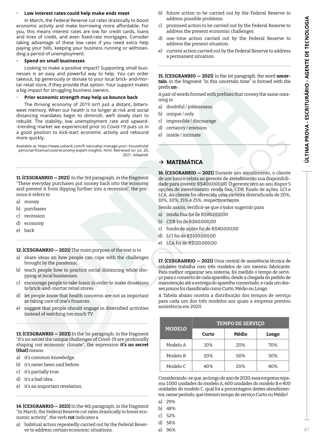 Bru no d a S ilv a R ib eir o - 00 6.3 40 .83 2- 52 Ú LT IM A P RO VA - ES CR IT U RÁ RI O - A G EN TE D E TE CN O LO G IA 41 y Low interest rates could help make ends meet In March, the Federal Reserve cut rates drastically to boost economic activity and make borrowing more affordable. For you, this means interest rates are low for credit cards, loans and lines of credit, and even fixed-rate mortgages. Consider taking advantage of these low rates if you need extra help paying your bills, keeping your business running or withstan- ding a period of unemployment. y Spend on small businesses Looking to make a positive impact? Supporting small busi- nesses is an easy and powerful way to help. You can order takeout, tip generously or donate to your local brick- and-mor- tar retail store, if they provide that option. Your support makes a big impact for struggling business owners. y Prior economic strength may help us bounce back The thriving economy of 2019 isn’t just a distant, bitters- weet memory. When our health is no longer at risk and social distancing mandates begin to diminish, we’ll slowly start to rebuild. The stability, low unemployment rate and upward- -trending market we experienced prior to Covid-19 puts us in a good position to kick-start economic activity and rebound more quickly. Available at: https://www.usbank.com/fi nancialiq/ manage-your--household/ personal-finance/covid-economy-expert-insights. html. Retrieved on: Jul. 20, 2021. Adapted. 11. (CESGRANRIO — 2021) In the 3rd paragraph, in the fragment “These everyday purchases put money back into the economy and prevent it from dipping further into a recession”, the pro- noun it refers to a) money b) purchases c) recession d) economy e) back 12. (CESGRANRIO — 2021) The main purpose of the text is to a) share ideas on how people can cope with the challenges brought by the pandemic. b) teach people how to practice social distancing while sho- pping at local businesses. c) encourage people to take loans in order to make donations to brick-and-mortar retail stores. d) let people know that health concerns are not as important as taking care of one’s finances. e) suggest that people should engage in diversified activities instead of watching too much TV. 13. (CESGRANRIO — 2021) In the 1st paragraph, in the fragment “it’s no secret the unique challenges of Covid-19 are profoundly shaping our economic climate”, the expression it’s no secret (that) means a) it’s common knowledge. b) it’s never been said before. c) it’s partially true. d) it’s a bad idea. e) it’s an important revelation. 14. (CESGRANRIO — 2021) In the 4th paragraph, in the fragment “In March, the Federal Reserve cut rates drastically to boost eco- nomic activity”, the verb cut indicates a a) habitual action repeatedly carried out by the Federal Reser- ve to address certain economic situations. b) future action to be carried out by the Federal Reserve to address possible problems. c) promised action to be carried out by the Federal Reserve to address the present economic challenges. d) one-time action carried out by the Federal Reserve to address the present situation. e) current action carried out by the Federal Reserve to address a permanent situation. 15. (CESGRANRIO — 2021) In the 1st paragraph, the word uncer- tain, in the fragment “in this uncertain time” is formed with the prefix un-. A pair of words formed with prefixes that convey the same mea- ning is: a) doubtful / joblessness b) unique / only c) impossible / discourage d) certainty / envision e) inside / intimate Æ MATEMÁTICA 16. (CESGRANRIO — 2021) Durante um atendimento, o cliente de um banco relata ao gerente de atendimento sua disponibili- dade para investir R$400.000,00. O gerente tem ao seu dispor 5 opções de investimento: renda fixa, CDB, fundo de ações, LCI e LCA. Ao cliente foi oferecida uma carteira diversificada de 20%, 10%, 30%, 15% e 25%, respectivamente. Sendo assim, verifica-se que o valor sugerido para a) renda fixa foi de R$80.000,00 b) CDB foi de R$60.000,00 c) fundo de ações foi de R$40.000,00 d) LCI foi de R$100.000,00 e) LCA foi de R$120.000,00 17. (CESGRANRIO — 2021) Uma central de assistência técnica de celulares trabalha com três modelos de um mesmo fabricante. Para melhor organizar seu sistema, foi medido o tempo de servi- ço para o conserto de cada aparelho, desde a chegada do pedido de manutenção até a entrega do aparelho consertado, e cada um des- ses prazos foi classificado como Curto, Médio ou Longo. A Tabela abaixo mostra a distribuição dos tempos de serviço para cada um dos três modelos aos quais a empresa prestou assistência em 2020. MODELO TEMPO DE SERVIÇO Curto Médio Longo Modelo A 10% 20% 70% Modelo B 20% 50% 30% Modelo C 40% 20% 40% Considerando-se que, ao longo do ano de 2020, essa empresa repa- rou 1.000 unidades do modelo A, 600 unidades do modelo B e 400 unidades do modelo C, qual foi a porcentagem destes atendimen- tos, nesse período, que tiveram tempo de serviço Curto ou Médio? a) 29% b) 48% c) 52% d) 58% e) 96% O conteúdo deste livro eletrônico é licenciado para Bruno da Silva Ribeiro - 006.340.832-52, vedada, por quaisquer meios e a qualquer título, a sua reprodução, cópia, divulgação ou distribuição, sujeitando-se aos infratores à responsabilização civil e criminal.
