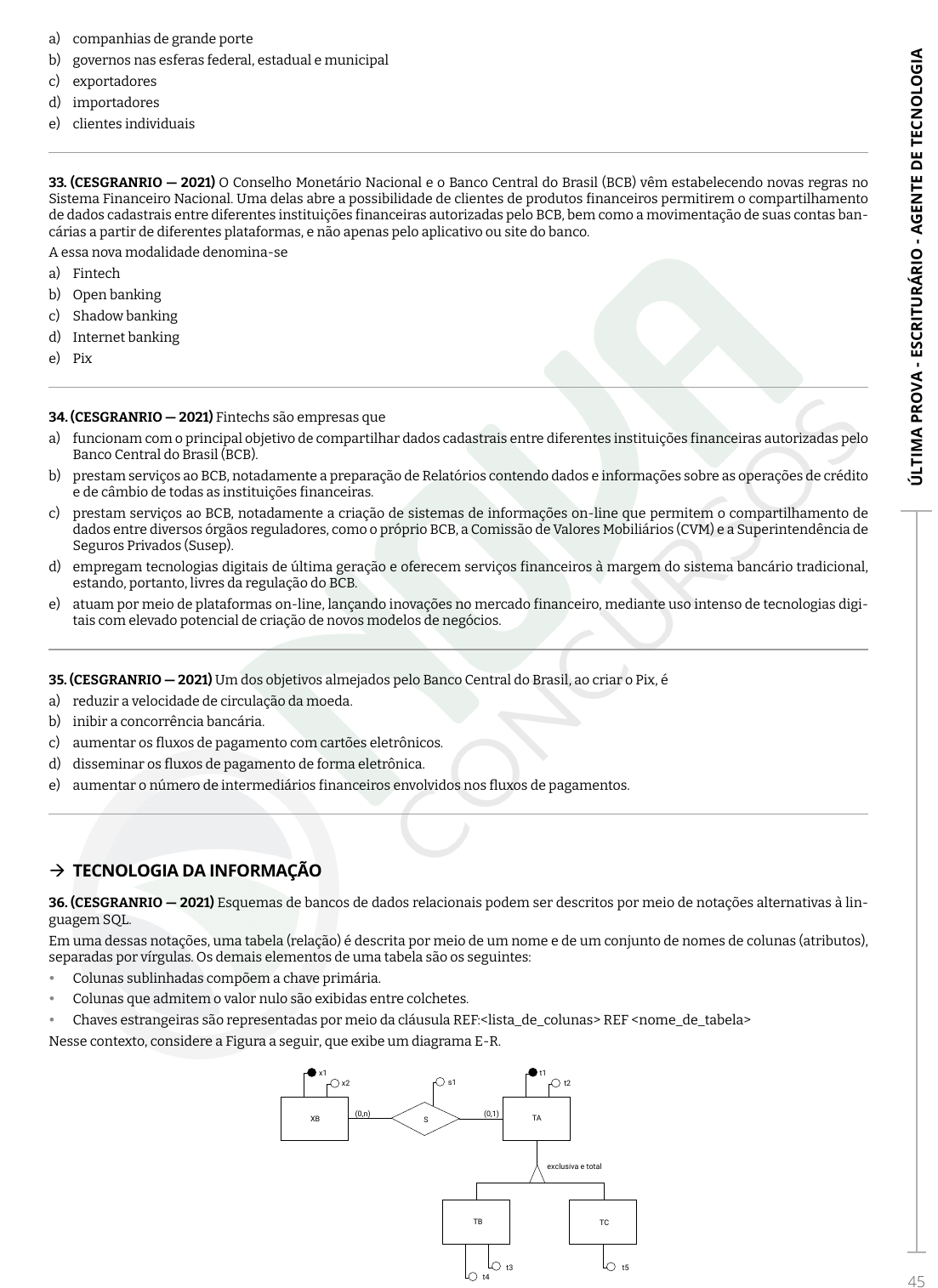 Bru no d a S ilv a R ib eir o - 00 6.3 40 .83 2- 52 Ú LT IM A P RO VA - ES CR IT U RÁ RI O - A G EN TE D E TE CN O LO G IA 45 a) companhias de grande porte b) governos nas esferas federal, estadual e municipal c) exportadores d) importadores e) clientes individuais 33. (CESGRANRIO — 2021) O Conselho Monetário Nacional e o Banco Central do Brasil (BCB) vêm estabelecendo novas regras no Sistema Financeiro Nacional. Uma delas abre a possibilidade de clientes de produtos financeiros permitirem o compartilhamento de dados cadastrais entre diferentes instituições financeiras autorizadas pelo BCB, bem como a movimentação de suas contas ban- cárias a partir de diferentes plataformas, e não apenas pelo aplicativo ou site do banco. A essa nova modalidade denomina-se a) Fintech b) Open banking c) Shadow banking d) Internet banking e) Pix 34. (CESGRANRIO — 2021) Fintechs são empresas que a) funcionam com o principal objetivo de compartilhar dados cadastrais entre diferentes instituições financeiras autorizadas pelo Banco Central do Brasil (BCB). b) prestam serviços ao BCB, notadamente a preparação de Relatórios contendo dados e informações sobre as operações de crédito e de câmbio de todas as instituições financeiras. c) prestam serviços ao BCB, notadamente a criação de sistemas de informações on-line que permitem o compartilhamento de dados entre diversos órgãos reguladores, como o próprio BCB, a Comissão de Valores Mobiliários (CVM) e a Superintendência de Seguros Privados (Susep). d) empregam tecnologias digitais de última geração e oferecem serviços financeiros à margem do sistema bancário tradicional, estando, portanto, livres da regulação do BCB. e) atuam por meio de plataformas on-line, lançando inovações no mercado financeiro, mediante uso intenso de tecnologias digi- tais com elevado potencial de criação de novos modelos de negócios. 35. (CESGRANRIO — 2021) Um dos objetivos almejados pelo Banco Central do Brasil, ao criar o Pix, é a) reduzir a velocidade de circulação da moeda. b) inibir a concorrência bancária. c) aumentar os fluxos de pagamento com cartões eletrônicos. d) disseminar os fluxos de pagamento de forma eletrônica. e) aumentar o número de intermediários financeiros envolvidos nos fluxos de pagamentos. Æ TECNOLOGIA DA INFORMAÇÃO 36. (CESGRANRIO — 2021) Esquemas de bancos de dados relacionais podem ser descritos por meio de notações alternativas à lin- guagem SQL. Em uma dessas notações, uma tabela (relação) é descrita por meio de um nome e de um conjunto de nomes de colunas (atributos), separadas por vírgulas. Os demais elementos de uma tabela são os seguintes: y Colunas sublinhadas compõem a chave primária. y Colunas que admitem o valor nulo são exibidas entre colchetes. y Chaves estrangeiras são representadas por meio da cláusula REF: REF Nesse contexto, considere a Figura a seguir, que exibe um diagrama E-R. XB S s1 x1 x2 (0,n) (0,1) TA TB TC t4 t3 t5 t1 t2 exclusiva e total O conteúdo deste livro eletrônico é licenciado para Bruno da Silva Ribeiro - 006.340.832-52, vedada, por quaisquer meios e a qualquer título, a sua reprodução, cópia, divulgação ou distribuição, sujeitando-se aos infratores à responsabilização civil e criminal.