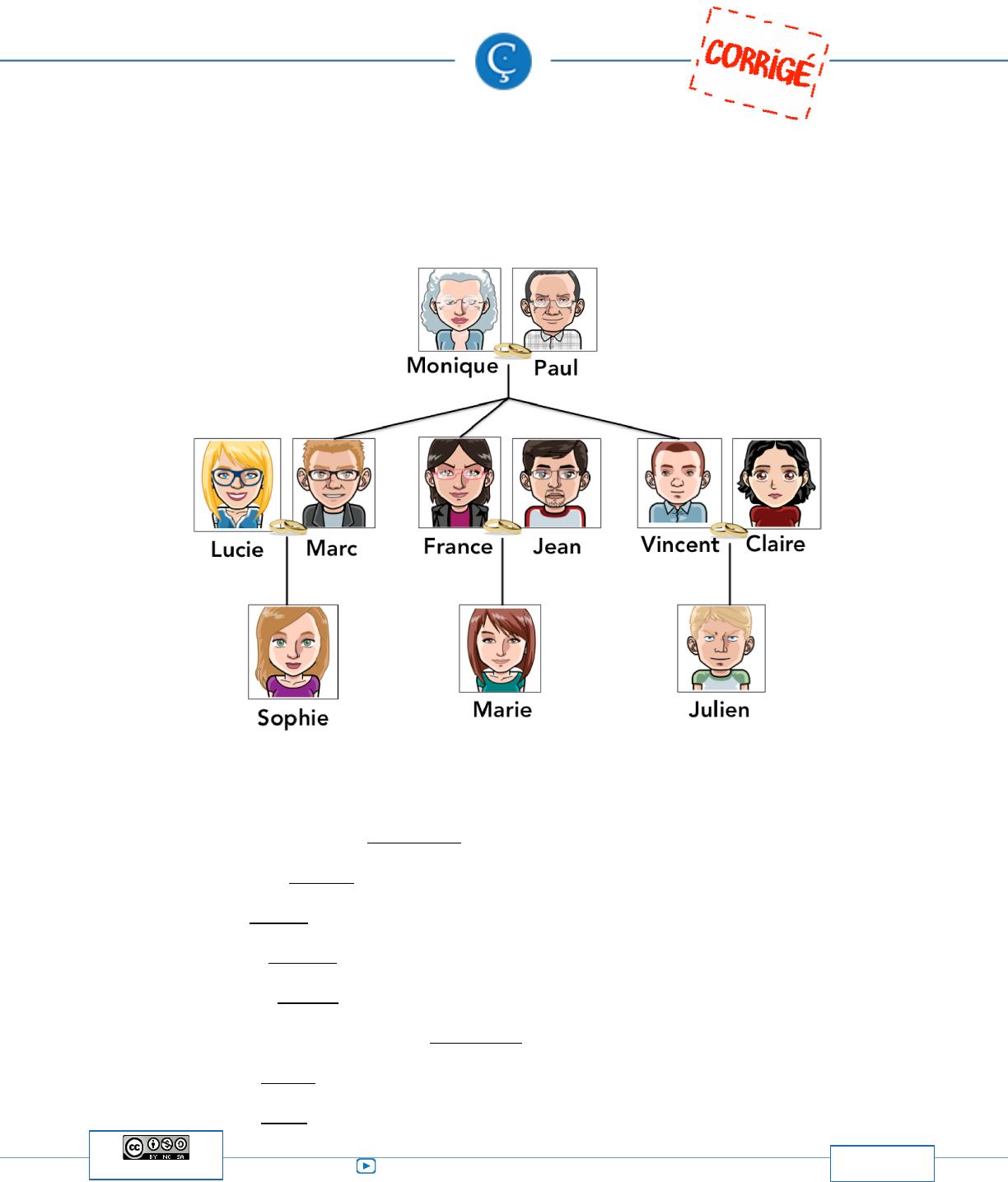 youtube.com/c/mademoisellecatherine 8 mademoisellecatherine.ca page 1 de 3 Catherine Marquis Le vocabulaire de la famille : exercice Voici l’arbre généalogique de la famille Tremblay: 1) Complétez les phrases suivantes avec le vocabulaire approprié. a. Monique et Paul sont les parents de Marc, de France et de Vincent. b. Monique est la mère de Marc, de France et de Vincent. c. Paul est le père de Marc, de France et de Vincent. d. France est la soeur de Marc et de Vincent. e. Vincent est le frère de Marc et de France. f. France, Marc et Vincent sont les enfants de Monique et de Paul. g. Marie est la fille de France et de Jean. h. Julien est le fils de Vincent et de Claire. youtube.com/c/mademoisellecatherine 8 mademoisellecatherine.ca page 2 de 3 Catherine Marquis Voici l’arbre généalogique de la famille Tremblay: 2) Complétez les phrases suivantes avec le vocabulaire approprié. a. Monique et Paul sont les grands-parents de Sophie, de Marie et de Julien. b. Paul est le grand-père de Sophie, de Marie et de Julien. c. Monique est la grand-mère de Sophie, de Marie et de Julien. d. Sophie est la petite-fille de Monique et de Paul. e. Julien est le petit-fils de Monique et de Paul. f. Sophie, Marie et Julien sont les petits-enfants de Monique et de Paul. g. Marc est l’oncle de Marie et de Julien. h. France est la tante de Sophie et de Julien. i. Sophie est la cousine de Marie et de Julien. j. Julien est le cousin de Sophie et de Marie. k. Sophie est la nièce de France et de Vincent. l. Julien est le neveu de Marc et de France. youtube.com/c/mademoisellecatherine 8 mademoisellecatherine.ca page 3 de 3 Catherine Marquis Voici l’arbre généalogique de la famille Tremblay: 3) Complétez les phrases suivantes avec le vocabulaire approprié. a. Lucie est la belle-soeur de France et de Vincent. b. Jean est le beau-frère de Marc et de Vincent. c. Lucie est la bru de Monique et de Paul. d. Jean est le gendre de Monique et de Paul. e. Monique est la belle-mère de Lucie, de Jean et de Claire. f. Paul est le beau-père de Lucie, de Jean et de Claire. g. Monique et Paul sont les beaux-parents de Lucie, de Jean et de Claire.