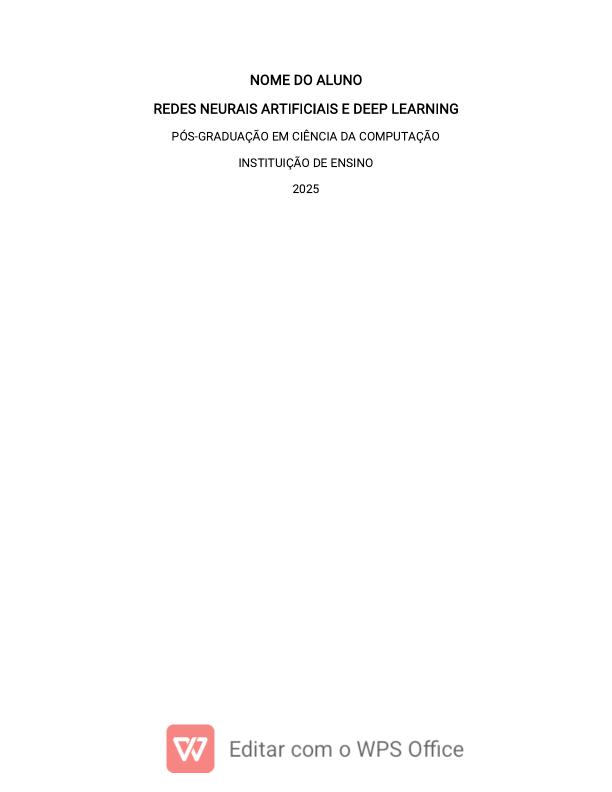 NOME DO ALUNO REDES NEURAIS ARTIFICIAIS E DEEP LEARNING PÓS-GRADUAÇÃO EM CIÊNCIA DA COMPUTAÇÃO INSTITUIÇÃO DE ENSINO 2025 NOME DO ALUNO REDES NEURAIS ARTIFICIAIS E DEEP LEARNING Trabalho de Conclusão de Curso apresentado ao curso de Pós-Graduação em Ciência da Computação da INSTITUIÇÃO DE ENSINO como requisito parcial para obtenção do título de especialista. Orientador: Nome do Orientador 2025 RESUMO Este trabalho aborda o conceito e funcionamento das Redes Neurais Artificiais (RNA) e a evolução para o Deep Learning (Aprendizado Profundo). São discutidas as estruturas básicas de uma rede neural, os principais algoritmos de treinamento como o backpropagation, e as arquiteturas mais avançadas, como redes convolucionais (CNNs) e redes recorrentes (RNNs). O trabalho também inclui aplicações práticas dessas tecnologias, como reconhecimento de imagem, processamento de linguagem natural e jogos. Por fim, são discutidos os desafios e perspectivas para o futuro do deep learning. ABSTRACT This paper addresses the concept and functioning of Artificial Neural Networks (ANNs) and their evolution to Deep Learning. It discusses the basic structures of a neural network, main training algorithms such as backpropagation, and advanced architectures like convolutional neural networks (CNNs) and recurrent neural networks (RNNs). The study includes practical applications of these technologies, such as image recognition, natural language processing, and games. Finally, it discusses the challenges and future perspectives of deep learning. SUMÁRIO 1 INTRODUÇÃO ................................................................................... 4 2 REDES NEURAIS ARTIFICIAIS: ESTRUTURA E FUNCIONAMENTO ...................... 5 3 DEEP LEARNING: CONCEITOS E ARQUITETURAS ......................................... 8 4 APLICAÇÕES PRÁTICAS ........................................................................ 12 5 DESAFIOS E PERSPECTIVAS FUTURAS .......................................................... 15 6 CONCLUSÃO ....................................................................................... 17 7 REFERÊNCIAS ..................................................................................... 18 1 INTRODUÇÃO As Redes Neurais Artificiais (RNAs) são sistemas computacionais inspirados na estrutura e funcionamento do cérebro humano. Com a evolução tecnológica e o crescimento da capacidade computacional, surgiu o Deep Learning, um ramo avançado das RNAs que permite a modelagem de dados complexos e de alta dimensionalidade. Este trabalho tem como objetivo apresentar os fundamentos, arquiteturas e aplicações dessas tecnologias revolucionárias.