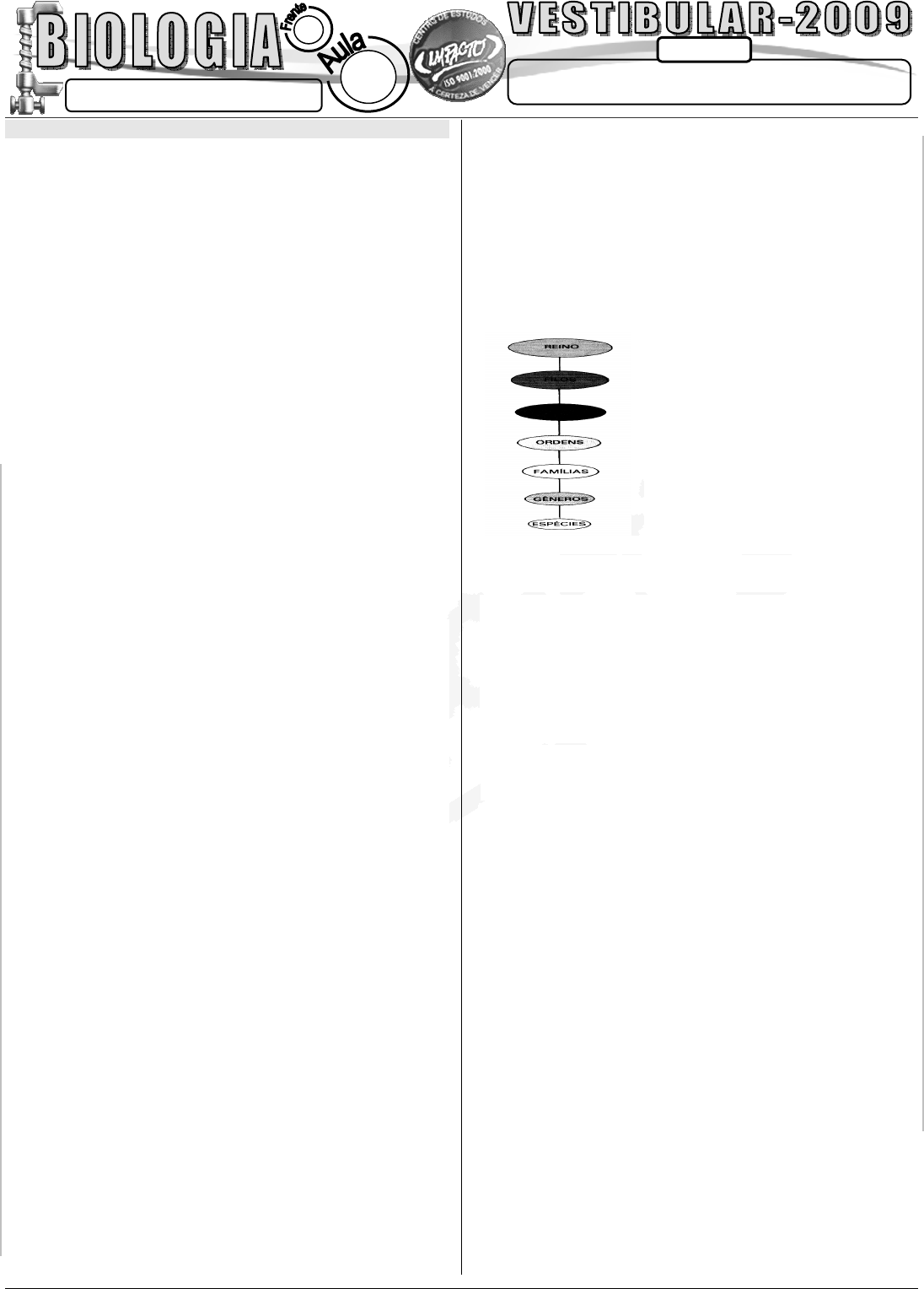GE190208 Taxonomia-Parte II FAÇO IMPACTO - A CERTEZA DE VENCER!!! PROFº: HUBERTT Fa le c on os co w w w .p or ta lim pa ct o. co m .b r VE ST IB UL AR – 2 00 9 CONTEÚDO A Certeza de Vencer 02 3 Como se classificam os organismos: O estudo descritivo de todas as espécies de seres vivos e sua classificação dentro de uma verdadeira hierarquia de grupamentos constitui a sistemática ou taxionomia. Tradicionalmente, distinguiam-se a sistemática zoológica, que se encarregava do estudo dos animais, e a sistemática botânica, na qual se classificavam as plantas. Modernamente, com a divisão dos seres em cinco reinos, o estudo da sistemática assume uma complexidade horizontal maior. Observação: Etimologicamente, taxionomia vem do grego taxis, 'ordem', e nomos, 'lei'. Ela é a parte da Biologia que trata da classificação dos sistemas viventes. Vamos começar a interpretar o papel da taxionomia vendo o conceito de espécie. Podemos dizer que espécie é um grupamento de indivíduos que revelam profundas semelhanças entre si, tanto no aspecto estrutural quanto no funcional, mostrando grandes similaridades bioquímicas, e no cariótipo (quadro cromossomial das células diplóides), com capacidade de se cruzarem naturalmente, dando origem a descendentes férteis. Observação: São da mesma espécie os indivíduos que apresentam: Profundas semelhanças estruturais e funcionais; Similaridades bioquímicas; O mesmo cariótipo; Capacidade de reprodução entre si. Observação: Considera-se como um sistema natural de classificação aquele que se baseia na morfologia e fisiologia dos organismos adultos, no desenvolvimento embrionário dos indivíduos, no cariótipo de cada espécie, na sua distribuição geográfica e, notadamente, nas relações dos seres com o processo da evolução das espécies. Um sistema artificial de classificação (que biologicamente não é correto) é aquele em que o taxionomista se baseia em uns poucos caracteres escolhidos arbitrariamente para classificar um determinado organismo. Classificações que dividissem os seres em aquáticos e terrestres, em macroscópicos e microscópicos, ou em alados e sem asas, seriam sistemas artificiais de classificação e não teriam qualquer valor cientifico. Para melhor entendimento, imagine que todas as criaturas humanas são razoavelmente semelhantes na sua anatomia e na sua fisiologia, têm grandes similaridades bioquímicas (a hemoglobina, a insulina, a tiroxina, a tripsina e numerosas outras substâncias são molecularmente idênticas em todos os indivíduos), possuem todos eles o mesmo número de cromossomos nas suas células somáticas (2n = 46), os quais correspondem a 23 tipos (pares homólogos) que se repetem em todas as pessoas e que, finalmente, cruzam-se e reproduzem-se naturalmente, originando descendentes férteis. Com essa observação, estamos afirmando que todos os seres humanos pertencem a uma mesma espécie. Essa espécie recebeu o nome de Homo sapiens. Ocorre, entretanto, que na Natureza existem espécies que, embora diferentes entre si, guardam grandes aproximações. O cão doméstico, o cachorro-do-mato, o lobo e o coiote revelam grandes semelhanças entre si, mas também demonstram algumas diferenças. Espécies muito próximas assim são enquadradas dentro de uma categoria taxionômica comum, que é o gênero. Portanto, no gênero Canis são reunidas as quatro espécies citadas: Canis familiaris (cão doméstico), Canis thou (cachorro-do-mato), Canis lúpus (lobo) e Canis latrans (coiote). Também com os vegetais observamos semelhante fato. O marmelo (Pirus cydonia), a maçã (Pirus malus) e a pêra (Pirus communis) constituem espécies distintas que se enquadram todas elas no mesmo gênero — Pirus. Como se vê, o gênero pode ser definido como um grupamento de espécies muito parecidas. Seguindo o mesmo raciocínio, podemos compreender que diversos gêneros muito próximos devam ser reunidos num grupamento taxionômico comum. Surge, então, a família. Todos os integrantes do gênero Canis, juntamente com a raposa- vermelha (Vulpes vulpes) e a raposa polar (Alopex lagopus), integram a família Canidae. Mencionamos três gêneros — Canis, Vulpes e Alopex, que pertencem a uma mesma família — Canidae. Você conclui, portanto, que família é uma reunião de gêneros afins, isto é, muito próximos ou parecidos. Agora, veja bem: o cão, o lobo, a raposa e demais organismos integrantes da família Canidae são todos carnívoros. Possuem dentes especiais para a alimentação à base de carne. Mas não são os únicos animais carnívoros. Os ursos, as hienas, os felinos (leão, tigre, onça, gato) também são carnívoros. E, no entanto, pertencem a famílias diferentes: Ursidae, Hienidae e Felidae, respectivamente. A reunião das famílias Canidae, Ursidae, Hienidae e Felidae resulta na formação de uma ordem — Carnívora. Logo, uma ordem é um grupamento de famílias que têm algo em comum. Por sua vez, as ordens se reúnem e formam as classes. Assim, a ordem Carnívora, juntamente com as ordens Rodentia (dos roedores), Primatas (dos macacos e do homem), Edentata (dos desdentados, como tamanduá, preguiça e tatu), Chiroptera (dos morcegos), Ungulata (dos portadores de cascos, como cavalos e bois) e Cetácea (baleias e golfinhos), forma a classe Mammalia (dos mamíferos). Realmente, em todas essas ordens, a fêmea é dotada de glândulas mamárias funcionais e suas crias, logo após o nascimento, são alimentadas com leite materno. Agora, preste muita atenção: todos os animais citados até aqui são dotados de coluna vertebral. Então, são vertebrados. Acontece, todavia, que existem outros vertebrados na Natureza que não são mamíferos. Assim são as aves, os répteis, os anfíbios e os peixes. As diversas classes desses animais se reúnem com a classe Mammalia e formam um filo ou ramo — o filo Chordata (animais que possuem notocórdio durante a formação embrionária, o qual geralme