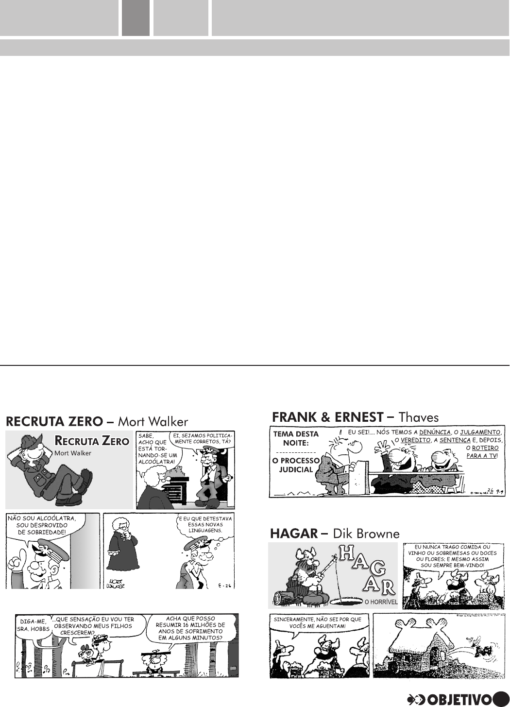 1 (MACKENZIE) – São palavras acentuadas de acordo com a mesma regra: a) há e Benício. b) atrás e gênio. c) só e Emílio. d) século e lírica. e) gênio e três. 2 (UESPI) – Assinale a opção em que os vocábulos obedecem à mesma regra de acen - tua ção gráfica. a) vôlei / mágico b) perdoo / açúcar c) ímã / pé d) hífen / príncipe e) áurea / amêndoas 3 (UESPI) – As palavras réstia e impossível são acentuadas, respectivamente, pelas seguin - tes regras de acentuação: a) ambas são paroxítonas. b) paroxítona terminada em ditongo e paroxí - tona terminada em "l". c) ambas são proparoxítonas. d) proparoxítona e paroxítona terminada em "el". e) paroxítona terminada em "a" e paroxítona terminada em "l". 4 (FAE) – "Vivemos em uma época em que muitas pes soas tem o hábito de desperdiçar água, energia, ali mentos e de não valorizar materiais que poderiam ser reuti lizados ou reaproveitados." O fragmento acima apresenta um erro de a) ortografia. b) acentuação gráfica. c) pontuação. d) regência verbal. 5 (UNOPAR) – Assinale a alternativa cuja palavra é acentuada pela mesma regra da pa la - vra gêmeas. a) Estereótipo. b) Estatísticas. c) Alguém. d) Psicanálise. e) Consultórios. 6 (UNIFESP) – Indique a alternativa em que todas as palavras são acentuadas graficamente, segundo a mesma regra. a) estômago, colégio, fábrica, lâmpada, infle - xível. b) Virgílio, fúria, carícias, matéria, colégio. c) trópicos, lábios, fúria, máquinas, elétricas. d) sério, cérebro, Virgílio, sábio, lógico. e) Ésquilo, carícia, Virgílio, átomos, êmbolo. 7 (U. PASSO FUNDO) – Considerando os cabeçalhos jornalísticos abaixo, assinale a alternativa que apresenta, respectivamente, as mesmas razões para acentuação das palavras "salários" e eletrônico". a) Polêmica afeta os empresários da soja. b) Novas regras para o ICMS têm semana de - cisiva na Câmara. c) Ministério Público Militar suspende no - mea ção de promo tora. d) A árvore da inconstância no futebol gaú - cho. e) Retratos de famílias alemãs em Ijuí. 8 Indique a opção que preenche corretamente as lacunas. 1. Aquele rapaz não __________________ de pensar na bela jovem que o deixou. 2. As palavras daquele orador _____________ de algum livro lido. 3. Eles ficaram tão desorientados que não sabiam onde ___________ o objeto derrubado. a) para – provém – por. b) para – provém – por. c) para – provém – pôr. d) para – proveem – pôr. e) para – provêm – pôr. PORTUGUÊS F1 Módulos 67 e 68 Acentuação I: monossílabos, oxítonos, paroxítonos e proparoxítonos / Linguagem figurada Exercícios Complementares no Portal Objetivo PORT1M414 e PORT1M415 59 Nas questões de 1 a D, identifique as figuras de linguagem presentes em cada uma das tiras. 1 2 3 4 TC4_1A_Port_Keli 23/05/11 15:37 Page 59 1 Assinale o item com erro de acento gráfico. a) fogaréu b) jurití c) jacaré d) Havaí e) atrás 2 Assinale a palavra que não deve levar acento gráfico. a) fugiram b) sairam c) enxaguam d) apoiam e) estreiam 3 Entre os itens a seguir, assinale aquele em que todas as palavras devem levar acento gráfico. a) povareu – bau – alguem – bacalhau b) ai – jilo – fogareu – aneis c) fuzis – jacare – peru – corroi d) alias – carmim – azuis – heroi e) onix – ali – alias – cafe 4 Sublinhe, em cada grupo, a única palavra que deve levar acento gráfico. a) ordens – abdomen – item – nuvem – hifens b) aqui – Jau – tupi – Bangu – Pacaembu c) impus – impos – rapaz – refez – impor d) faisca – ruir – fluindo – reunir – campainha e) fluor – jantar – funil – barris – apto f) ritmo – istmo – eclipse – fixo – climax g) exodo – jovens – bambu – raiz – coroa 5 Assinale a alternativa que contém o par de vocábulos em que um deles está errado quanto à acentuação gráfica. a) itens / item b) hífen / hífens c) sutil / sutis d) país / países e) raiz / raízes. 6 (ESAM) – Assinale a alternativa em que todas as pala vras estão grafadas de confor mi - dade com as regras de acentuação. a) Consequência – consequente – rói – ferí. b) Paraguai – amá-lo-íamos – côco – réu. c) Gregário – gratúito – recém – jóquei. d) Contigo – contíguo – hífen – item. e) Pedi – destruí – roi – lençóis. 7 (PUC) – Assinale a alternativa em que todas as palavras mudariam de sentido, caso estives - sem sem acento. a) sóbrio, história, está b) vários, vítimas, matá-los c) é, já, país d) é, está, país e) têm, matá-los, sóbrio 8 (PUC) – Entre as alternativas abaixo, aponte aquela que apresenta palavras cuja acentuação se deva ao mesmo motivo. a) capô, está, país b) república, já, matá-los c) vítimas, república, têm d) capô, já, história e) sóbrio, história, vários 9 (U. METODISTA) – A acentuação das pa - la vras está correta em: a) concordo (verbo); fabrica (verbo); Anhan - ga baú; indio. b) fábrica (substantivo); concordância; viuva; saúva. c) tatú; raínha; cocaína; tonél. d) sací; Tatuí; cipó; pálida. e) tendência; pó; Camboriú; saúde. J (UFPR) – Assinale a alternativa em que todos os vocábulos são acentuados por serem oxítonos: a) paletó, avô, pajé, café, jiló. b) parabéns, vêm, hífen, saí, oásis. c) vovô, capilé, Paraná, lápis, régua. d) amém, amável, filó, porém, além. e) caí, aí, ímã, ipê, abricó. 1 Identifique os sentidos dos conectivos (ou elemen tos de ligação) sublinhados. Atente para a relação es tabelecida entre as orações. a) Chegou atrasado, porque perdeu a hora. b) Os ladrões fugiram, logo que a polícia chegou. c) Não só estudamos a lição, como também fizemos os exercícios. d) Tomou os remédios, no entanto continuou doente. e) O aluno volta para casa, assim que acaba a aula. f) O tráfego aéreo foi suspenso, uma vez que chovia torrencialmente. g) O tempo