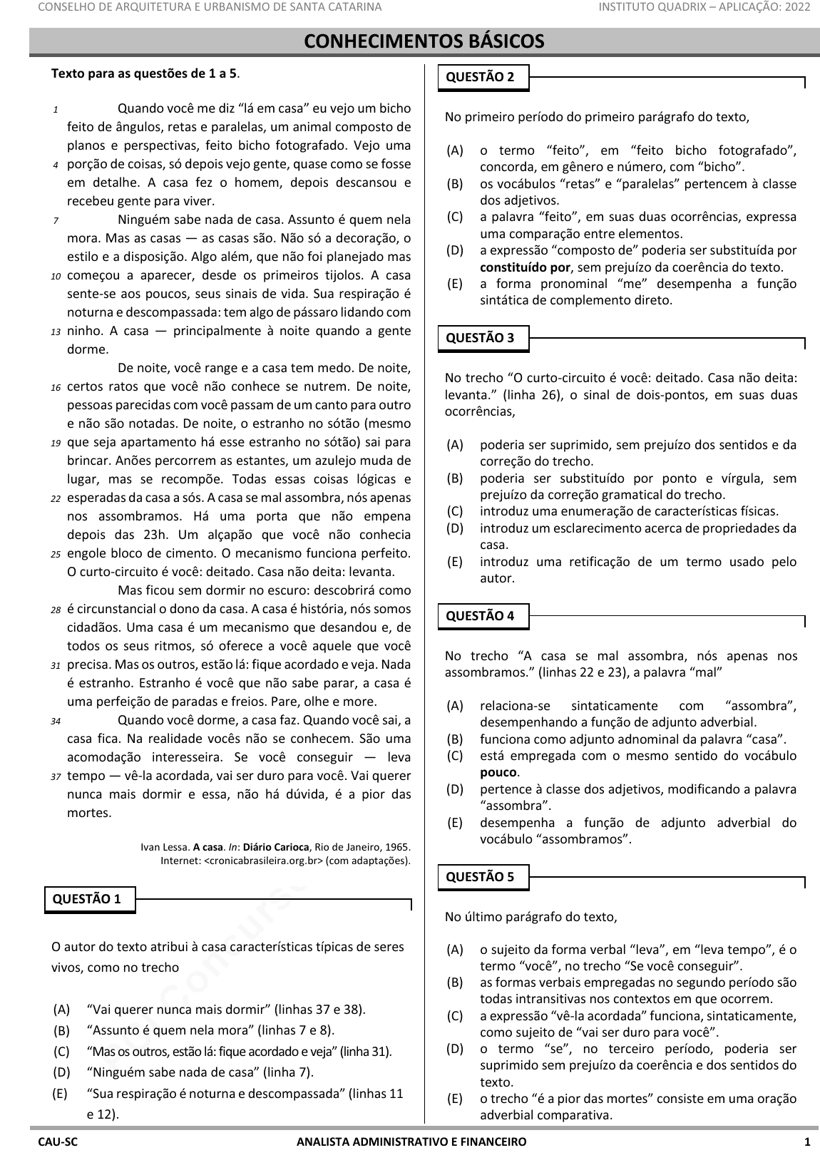 pcimarkpci MDAwMDowMDAwOjAwMDA6MDAwMDowMDAwOmZmZmY6OTU0ZTpiOTcw:VGh1LCAxOSBKdW4gMjAyNSAxMDo1MjoyMCAtMDMwMA== www.pciconcursos.com.br CONSELHO DE ARQUITETURA E URBANISMO DE SANTA CATARINA INSTITUTO QUADRIX – APLICAÇÃO: 2022 CAU-SC ANALISTA ADMINISTRATIVO E FINANCEIRO 1 CONHECIMENTOS BÁSICOS Texto para as questões de 1 a 5. 1 4 7 10 13 16 19 22 25 28 31 34 37 Quando você me diz “lá em casa” eu vejo um bicho feito de ângulos, retas e paralelas, um animal composto de planos e perspectivas, feito bicho fotografado. Vejo uma porção de coisas, só depois vejo gente, quase como se fosse em detalhe. A casa fez o homem, depois descansou e recebeu gente para viver. Ninguém sabe nada de casa. Assunto é quem nela mora. Mas as casas — as casas são. Não só a decoração, o estilo e a disposição. Algo além, que não foi planejado mas começou a aparecer, desde os primeiros tijolos. A casa sente-se aos poucos, seus sinais de vida. Sua respiração é noturna e descompassada: tem algo de pássaro lidando com ninho. A casa — principalmente à noite quando a gente dorme. De noite, você range e a casa tem medo. De noite, certos ratos que você não conhece se nutrem. De noite, pessoas parecidas com você passam de um canto para outro e não são notadas. De noite, o estranho no sótão (mesmo que seja apartamento há esse estranho no sótão) sai para brincar. Anões percorrem as estantes, um azulejo muda de lugar, mas se recompõe. Todas essas coisas lógicas e esperadas da casa a sós. A casa se mal assombra, nós apenas nos assombramos. Há uma porta que não empena depois das 23h. Um alçapão que você não conhecia engole bloco de cimento. O mecanismo funciona perfeito. O curto-circuito é você: deitado. Casa não deita: levanta. Mas ficou sem dormir no escuro: descobrirá como é circunstancial o dono da casa. A casa é história, nós somos cidadãos. Uma casa é um mecanismo que desandou e, de todos os seus ritmos, só oferece a você aquele que você precisa. Mas os outros, estão lá: fique acordado e veja. Nada é estranho. Estranho é você que não sabe parar, a casa é uma perfeição de paradas e freios. Pare, olhe e more. Quando você dorme, a casa faz. Quando você sai, a casa fica. Na realidade vocês não se conhecem. São uma acomodação interesseira. Se você conseguir — leva tempo — vê-la acordada, vai ser duro para você. Vai querer nunca mais dormir e essa, não há dúvida, é a pior das mortes. Ivan Lessa. A casa. In: Diário Carioca, Rio de Janeiro, 1965. Internet: (com adaptações). QUESTÃO 1 O autor do texto atribui à casa características típicas de seres vivos, como no trecho (A) “Vai querer nunca mais dormir” (linhas 37 e 38). (B) “Assunto é quem nela mora” (linhas 7 e 8). (C) “Mas os outros, estão lá: fique acordado e veja” (linha 31). (D) “Ninguém sabe nada de casa” (linha 7). (E) “Sua respiração é noturna e descompassada” (linhas 11 e 12). QUESTÃO 2 No primeiro período do primeiro parágrafo do texto, (A) o termo “feito”, em “feito bicho fotografado”, concorda, em gênero e número, com “bicho”. (B) os vocábulos “retas” e “paralelas” pertencem à classe dos adjetivos. (C) a palavra “feito”, em suas duas ocorrências, expressa uma comparação entre elementos. (D) a expressão “composto de” poderia ser substituída por constituído por, sem prejuízo da coerência do texto. (E) a forma pronominal “me” desempenha a função sintática de complemento direto. QUESTÃO 3 No trecho “O curto-circuito é você: deitado. Casa não deita: levanta.” (linha 26), o sinal de dois-pontos, em suas duas ocorrências, (A) poderia ser suprimido, sem prejuízo dos sentidos e da correção do trecho. (B) poderia ser substituído por ponto e vírgula, sem prejuízo da correção gramatical do trecho. (C) introduz uma enumeração de características físicas. (D) introduz um esclarecimento acerca de propriedades da casa. (E) introduz uma retificação de um termo usado pelo autor. QUESTÃO 4 No trecho “A casa se mal assombra, nós apenas nos assombramos.” (linhas 22 e 23), a palavra “mal” (A) relaciona-se sintaticamente com “assombra”, desempenhando a função de adjunto adverbial. (B) funciona como adjunto adnominal da palavra “casa”. (C) está empregada com o mesmo sentido do vocábulo pouco. (D) pertence à classe dos adjetivos, modificando a palavra “assombra”. (E) desempenha a função de adjunto adverbial do vocábulo “assombramos”. QUESTÃO 5 No último parágrafo do texto, (A) o sujeito da forma verbal “leva”, em “leva tempo”, é o termo “você”, no trecho “Se você conseguir”. (B) as formas verbais empregadas no segundo período são todas intransitivas nos contextos em que ocorrem. (C) a expressão “vê-la acordada” funciona, sintaticamente, como sujeito de “vai ser duro para você”. (D) o termo “se”, no terceiro período, poderia ser suprimido sem prejuízo da coerência e dos sentidos do texto. (E) o trecho “é a pior das mortes” consiste em uma oração adverbial comparativa. pcimarkpci MDAwMDowMDAwOjAwMDA6MDAwMDowMDAwOmZmZmY6OTU0ZTpiOTcw:VGh1LCAxOSBKdW4gMjAyNSAxMDo1MjoyMCAtMDMwMA== www.pciconcursos.com.br CONSELHO DE ARQUITETURA E URBANISMO DE SANTA CATARINA INSTITUTO QUADRIX – APLICAÇÃO: 2022 CAU-SC ANALISTA ADMINISTRATIVO E FINANCEIRO 2 Nas questões que avaliem conhecimentos de informática, a menos que seja explicitamente informado o contrário, considere que: todos os programas mencionados estejam em configuração-padrão, em português; o mouse esteja configurado para pessoas destras; expressões como clicar, clique simples e clique duplo refiram-se a cliques com o botão esquerdo do mouse; e teclar corresponda à operação de pressionar uma tecla e, rapidamente, liberá-la, acionando-a apenas uma vez. Considere também que não haja restrições de proteção, de funcionamento e de uso em relação aos program