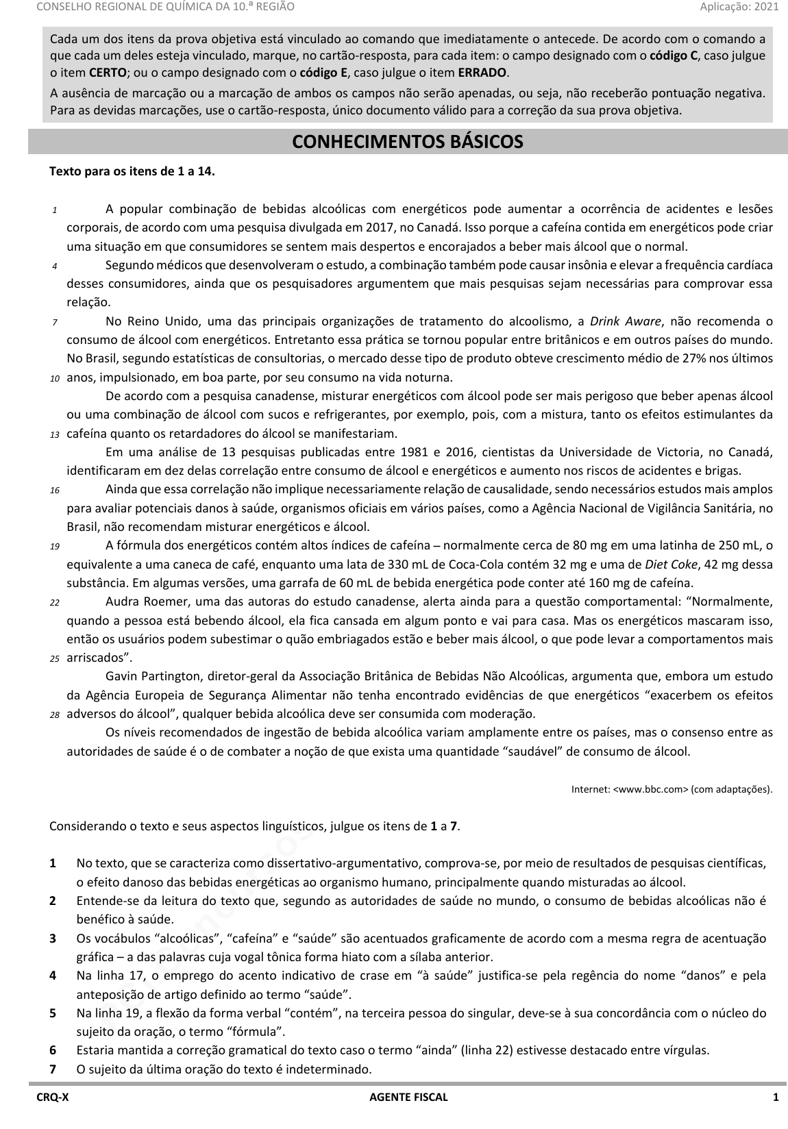 pcimarkpci MDAwMDowMDAwOjAwMDA6MDAwMDowMDAwOmZmZmY6OTU0ZTpiOTcw:VGh1LCAxOSBKdW4gMjAyNSAxMDozMTo0OCAtMDMwMA== www.pciconcursos.com.br CONSELHO REGIONAL DE QUÍMICA DA 10.ª REGIÃO Aplicação: 2021 CRQ‐X AGENTE FISCAL 1 Cada um dos itens da prova objetiva está vinculado ao comando que imediatamente o antecede. De acordo com o comando a que cada um deles esteja vinculado, marque, no cartão‐resposta, para cada item: o campo designado com o código C, caso julgue o item CERTO; ou o campo designado com o código E, caso julgue o item ERRADO. A ausência de marcação ou a marcação de ambos os campos não serão apenadas, ou seja, não receberão pontuação negativa. Para as devidas marcações, use o cartão‐resposta, único documento válido para a correção da sua prova objetiva. CONHECIMENTOS BÁSICOS Texto para os itens de 1 a 14. 1 4 7 10 13 16 19 22 25 28 A popular combinação de bebidas alcoólicas com energéticos pode aumentar a ocorrência de acidentes e lesões corporais, de acordo com uma pesquisa divulgada em 2017, no Canadá. Isso porque a cafeína contida em energéticos pode criar uma situação em que consumidores se sentem mais despertos e encorajados a beber mais álcool que o normal. Segundo médicos que desenvolveram o estudo, a combinação também pode causar insônia e elevar a frequência cardíaca desses consumidores, ainda que os pesquisadores argumentem que mais pesquisas sejam necessárias para comprovar essa relação. No Reino Unido, uma das principais organizações de tratamento do alcoolismo, a Drink Aware, não recomenda o consumo de álcool com energéticos. Entretanto essa prática se tornou popular entre britânicos e em outros países do mundo. No Brasil, segundo estatísticas de consultorias, o mercado desse tipo de produto obteve crescimento médio de 27% nos últimos anos, impulsionado, em boa parte, por seu consumo na vida noturna. De acordo com a pesquisa canadense, misturar energéticos com álcool pode ser mais perigoso que beber apenas álcool ou uma combinação de álcool com sucos e refrigerantes, por exemplo, pois, com a mistura, tanto os efeitos estimulantes da cafeína quanto os retardadores do álcool se manifestariam. Em uma análise de 13 pesquisas publicadas entre 1981 e 2016, cientistas da Universidade de Victoria, no Canadá, identificaram em dez delas correlação entre consumo de álcool e energéticos e aumento nos riscos de acidentes e brigas. Ainda que essa correlação não implique necessariamente relação de causalidade, sendo necessários estudos mais amplos para avaliar potenciais danos à saúde, organismos oficiais em vários países, como a Agência Nacional de Vigilância Sanitária, no Brasil, não recomendam misturar energéticos e álcool. A fórmula dos energéticos contém altos índices de cafeína ̶ normalmente cerca de 80 mg em uma latinha de 250 mL, o equivalente a uma caneca de café, enquanto uma lata de 330 mL de Coca‐Cola contém 32 mg e uma de Diet Coke, 42 mg dessa substância. Em algumas versões, uma garrafa de 60 mL de bebida energética pode conter até 160 mg de cafeína. Audra Roemer, uma das autoras do estudo canadense, alerta ainda para a questão comportamental: “Normalmente, quando a pessoa está bebendo álcool, ela fica cansada em algum ponto e vai para casa. Mas os energéticos mascaram isso, então os usuários podem subestimar o quão embriagados estão e beber mais álcool, o que pode levar a comportamentos mais arriscados”. Gavin Partington, diretor‐geral da Associação Britânica de Bebidas Não Alcoólicas, argumenta que, embora um estudo da Agência Europeia de Segurança Alimentar não tenha encontrado evidências de que energéticos “exacerbem os efeitos adversos do álcool”, qualquer bebida alcoólica deve ser consumida com moderação. Os níveis recomendados de ingestão de bebida alcoólica variam amplamente entre os países, mas o consenso entre as autoridades de saúde é o de combater a noção de que exista uma quantidade “saudável” de consumo de álcool. Internet: (com adaptações). Considerando o texto e seus aspectos linguísticos, julgue os itens de 1 a 7. 1 No texto, que se caracteriza como dissertativo‐argumentativo, comprova‐se, por meio de resultados de pesquisas científicas, o efeito danoso das bebidas energéticas ao organismo humano, principalmente quando misturadas ao álcool. 2 Entende‐se da leitura do texto que, segundo as autoridades de saúde no mundo, o consumo de bebidas alcoólicas não é benéfico à saúde. 3 Os vocábulos “alcoólicas”, “cafeína” e “saúde” são acentuados graficamente de acordo com a mesma regra de acentuação gráfica – a das palavras cuja vogal tônica forma hiato com a sílaba anterior. 4 Na linha 17, o emprego do acento indicativo de crase em “à saúde” justifica‐se pela regência do nome “danos” e pela anteposição de artigo definido ao termo “saúde”. 5 Na linha 19, a flexão da forma verbal “contém”, na terceira pessoa do singular, deve‐se à sua concordância com o núcleo do sujeito da oração, o termo “fórmula”. 6 Estaria mantida a correção gramatical do texto caso o termo “ainda” (linha 22) estivesse destacado entre vírgulas. 7 O sujeito da última oração do texto é indeterminado. pcimarkpci MDAwMDowMDAwOjAwMDA6MDAwMDowMDAwOmZmZmY6OTU0ZTpiOTcw:VGh1LCAxOSBKdW4gMjAyNSAxMDozMTo0OCAtMDMwMA== www.pciconcursos.com.br CONSELHO REGIONAL DE QUÍMICA DA 10.ª REGIÃO Aplicação: 2021 CRQ‐X AGENTE FISCAL 2 Com relação à correção gramatical e à coerência das substituições propostas para vocábulos e trechos destacados do texto, julgue os itens de 8 a 12. 8 “em que” (linha 3) por cujos 9 “ainda que” (linha 5) por embora 10 “se manifestariam” (linha 13) por manifestariam‐se 11 “enquanto” (linha 20) por ao passo que 12 “qualquer” (linha 28) por toda ____________________________________________________ Julgue os 