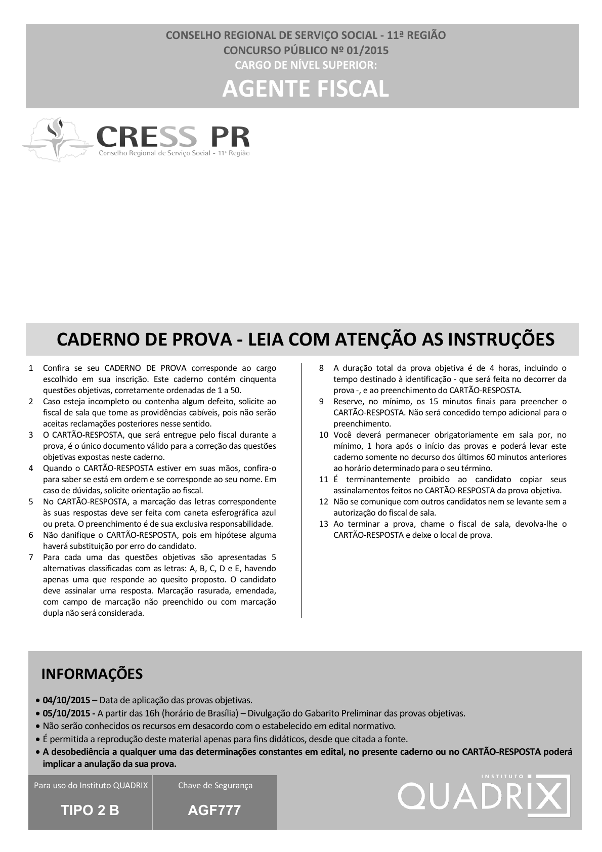 pcimarkpci MDAwMDowMDAwOjAwMDA6MDAwMDowMDAwOmZmZmY6OTU0ZTpiOTcw:VGh1LCAxOSBKdW4gMjAyNSAxMDozMjo1NSAtMDMwMA== www.pciconcursos.com.brwww.pciconcursos.com.br 1 Confira se seu CADERNO DE PROVA corresponde ao cargo escolhido em sua inscrição. Este caderno contém cinquenta questões objetivas, corretamente ordenadas de 1 a 50. 2 Caso esteja incompleto ou contenha algum defeito, solicite ao fiscal de sala que tome as providências cabíveis, pois não serão aceitas reclamações posteriores nesse sentido. 3 O CARTÃO-RESPOSTA, que será entregue pelo fiscal durante a prova, é o único documento válido para a correção das questões objetivas expostas neste caderno. 4 Quando o CARTÃO-RESPOSTA estiver em suas mãos, confira-o para saber se está em ordem e se corresponde ao seu nome. Em caso de dúvidas, solicite orientação ao fiscal. 5 No CARTÃO-RESPOSTA, a marcação das letras correspondente às suas respostas deve ser feita com caneta esferográfica azul ou preta. O preenchimento é de sua exclusiva responsabilidade. 6 Não danifique o CARTÃO-RESPOSTA, pois em hipótese alguma haverá substituição por erro do candidato. 7 Para cada uma das questões objetivas são apresentadas 5 alternativas classificadas com as letras: A, B, C, D e E, havendo apenas uma que responde ao quesito proposto. O candidato deve assinalar uma resposta. Marcação rasurada, emendada, com campo de marcação não preenchido ou com marcação dupla não será considerada. 8 A duração total da prova objetiva é de 4 horas, incluindo o tempo destinado à identificação - que será feita no decorrer da prova -, e ao preenchimento do CARTÃO-RESPOSTA. 9 Reserve, no mínimo, os 15 minutos finais para preencher o CARTÃO-RESPOSTA. Não será concedido tempo adicional para o preenchimento. 10 Você deverá permanecer obrigatoriamente em sala por, no mínimo, 1 hora após o início das provas e poderá levar este caderno somente no decurso dos últimos 60 minutos anteriores ao horário determinado para o seu término. 11 É terminantemente proibido ao candidato copiar seus assinalamentos feitos no CARTÃO-RESPOSTA da prova objetiva. 12 Não se comunique com outros candidatos nem se levante sem a autorização do fiscal de sala. 13 Ao terminar a prova, chame o fiscal de sala, devolva-lhe o CARTÃO-RESPOSTA e deixe o local de prova. INFORMAÇÕES 04/10/2015 – Data de aplicação das provas objetivas. 05/10/2015 - A partir das 16h (horário de Brasília) – Divulgação do Gabarito Preliminar das provas objetivas. Não serão conhecidos os recursos em desacordo com o estabelecido em edital normativo. É permitida a reprodução deste material apenas para fins didáticos, desde que citada a fonte. A desobediência a qualquer uma das determinações constantes em edital, no presente caderno ou no CARTÃO-RESPOSTA poderá implicar a anulação da sua prova. CONSELHO REGIONAL DE SERVIÇO SOCIAL - 11ª REGIÃO CONCURSO PÚBLICO Nº 01/2015 CARGO DE NÍVEL SUPERIOR: AGENTE FISCAL CADERNO DE PROVA - LEIA COM ATENÇÃO AS INSTRUÇÕES Para uso do Instituto QUADRIX TIPO 2 B Chave de Segurança AGF777 pcimarkpci MDAwMDowMDAwOjAwMDA6MDAwMDowMDAwOmZmZmY6OTU0ZTpiOTcw:VGh1LCAxOSBKdW4gMjAyNSAxMDozMjo1NSAtMDMwMA== www.pciconcursos.com.brwww.pciconcursos.com.br │CRESS-PR_ AGF777_2B│Cargo: Agente Fiscal Instituto QUADRIX│CRESS-PR – Aplicação: 2015│ -2- PROVA OBJETIVA LÍNGUA PORTUGUESA Para responder às questões de 1 a 5, leia o texto abaixo. Migrantes pegam trens com destino à Alemanha e à Áustria Centenas de migrantes que estavam bloqueados em campos de refugiados improvisados em estações de Budapeste, na Hungria, conseguiram embarcar com destino à Alemanha e à Áustria. Famílias com crianças estão no grupo que conseguiu entrar nos trens. Centenas também embarcaram na Macedônia em direção à Sérvia. A empresa que opera o sistema de trens na Hungria informou que a composição que vai para Munique parou em Hegyeshalom, cidade na fronteira com a Áustria, à espera da "ação das autoridades". A polícia austríaca informou que quem pediu asilo à Hungria não pode prosseguir viagem. Já aqueles que querem pedir refúgio à Áustria podem se mover por duas semanas no país. Depois disso, eles podem ser devolvidos para o último país de trânsito. Budapeste Muitos refugiados aproveitaram que não havia forças de segurança para correr até os trens que partiam para Viena, Munique e Berlim, de acordo com a agência France Presse. A checagem dos documentos era feita pelas autoridades dentro do trem, segundo a Reuters. De acordo com o canal local M1, no entanto, embarcaram apenas migrantes que tinham comprado as passagens e dispunham de documentos válidos. (1) vários dias, muitas pessoas (2) espera de asilo na Alemanha, Áustria ou em um país escandinavo permaneceram em acampamentos improvisados e pediam que (3) autoridades deixassem o grupo seguir viagem. Na Macedônia, o governo forneceu trens, que partem duas vezes por dia, para os imigrantes que se dirigem à Servia. Em um acampamento improvisado, as pessoas receberam ajuda humanitária antes de embarcar em comboios escoltados pela polícia e pelo exército macedônio. [...] Nos últimos dias, as autoridades detiveram 36 pessoas por tráfico de seres humanos, que enfrentarão investigações policiais, indicou o relatório do Ministério do Interior húngaro. Os ministros do Interior da França, da Alemanha e do Reino Unido pediram à presidência da União Europeia que organize uma reunião nas duas próximas semanas sobre a chegada de grande quantidade de imigrantes às fronteiras do bloco. Guerras, pobreza, repressão política e religiosa são alguns dos motivos que impulsionam milhares de pessoas a deixar países como Síria, Afeganistão, Iraque, Líbia e Eritreia. (g1.globo.com/) QUESTÃO 1 Observe o uso do sinal indicativo de crase nas seguintes passagens: I. “[...] conseguiram embarcar com destino à Alemanha e à Áustria”. II. 
