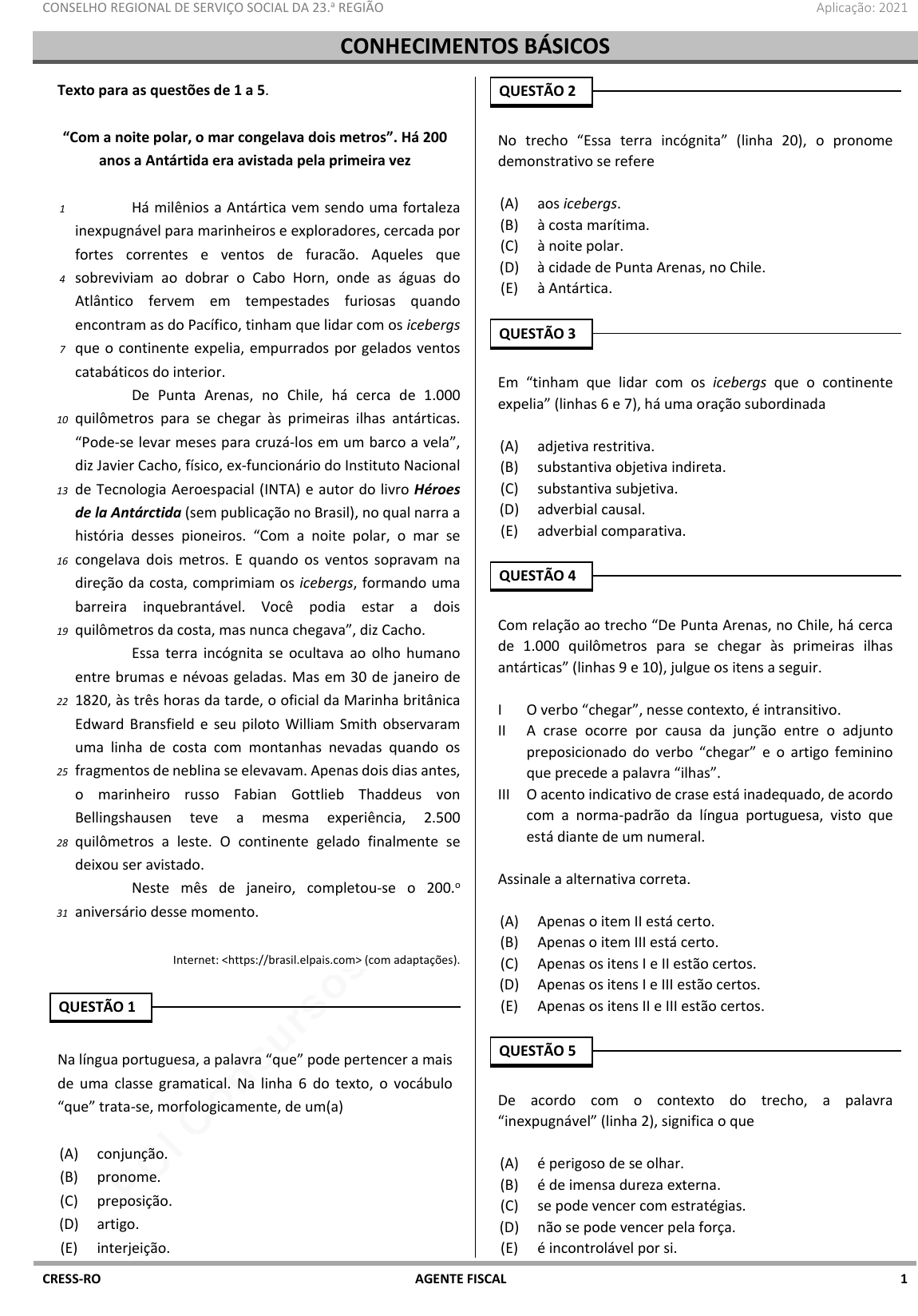 pcimarkpci MDAwMDowMDAwOjAwMDA6MDAwMDowMDAwOmZmZmY6OTU0ZTpiOTcw:VGh1LCAxOSBKdW4gMjAyNSAxMDozMjoyNyAtMDMwMA== www.pciconcursos.com.br CONSELHO REGIONAL DE SERVIÇO SOCIAL DA 23.a REGIÃO Aplicação: 2021 CRESS-RO AGENTE FISCAL 1 CONHECIMENTOS BÁSICOS Texto para as questões de 1 a 5. “Com a noite polar, o mar congelava dois metros”. Há 200 anos a Antártida era avistada pela primeira vez 1 4 7 10 13 16 19 22 25 28 31 Há milênios a Antártica vem sendo uma fortaleza inexpugnável para marinheiros e exploradores, cercada por fortes correntes e ventos de furacão. Aqueles que sobreviviam ao dobrar o Cabo Horn, onde as águas do Atlântico fervem em tempestades furiosas quando encontram as do Pacífico, tinham que lidar com os icebergs que o continente expelia, empurrados por gelados ventos catabáticos do interior. De Punta Arenas, no Chile, há cerca de 1.000 quilômetros para se chegar às primeiras ilhas antárticas. “Pode-se levar meses para cruzá-los em um barco a vela”, diz Javier Cacho, físico, ex-funcionário do Instituto Nacional de Tecnologia Aeroespacial (INTA) e autor do livro Héroes de la Antárctida (sem publicação no Brasil), no qual narra a história desses pioneiros. “Com a noite polar, o mar se congelava dois metros. E quando os ventos sopravam na direção da costa, comprimiam os icebergs, formando uma barreira inquebrantável. Você podia estar a dois quilômetros da costa, mas nunca chegava”, diz Cacho. Essa terra incógnita se ocultava ao olho humano entre brumas e névoas geladas. Mas em 30 de janeiro de 1820, às três horas da tarde, o oficial da Marinha britânica Edward Bransfield e seu piloto William Smith observaram uma linha de costa com montanhas nevadas quando os fragmentos de neblina se elevavam. Apenas dois dias antes, o marinheiro russo Fabian Gottlieb Thaddeus von Bellingshausen teve a mesma experiência, 2.500 quilômetros a leste. O continente gelado finalmente se deixou ser avistado. Neste mês de janeiro, completou-se o 200.o aniversário desse momento. Internet: (com adaptações). QUESTÃO 1 Na língua portuguesa, a palavra “que” pode pertencer a mais de uma classe gramatical. Na linha 6 do texto, o vocábulo “que” trata-se, morfologicamente, de um(a) (A) conjunção. (B) pronome. (C) preposição. (D) artigo. (E) interjeição. QUESTÃO 2 No trecho “Essa terra incógnita” (linha 20), o pronome demonstrativo se refere (A) aos icebergs. (B) à costa marítima. (C) à noite polar. (D) à cidade de Punta Arenas, no Chile. (E) à Antártica. QUESTÃO 3 Em “tinham que lidar com os icebergs que o continente expelia” (linhas 6 e 7), há uma oração subordinada (A) adjetiva restritiva. (B) substantiva objetiva indireta. (C) substantiva subjetiva. (D) adverbial causal. (E) adverbial comparativa. QUESTÃO 4 Com relação ao trecho “De Punta Arenas, no Chile, há cerca de 1.000 quilômetros para se chegar às primeiras ilhas antárticas” (linhas 9 e 10), julgue os itens a seguir. I O verbo “chegar”, nesse contexto, é intransitivo. II A crase ocorre por causa da junção entre o adjunto preposicionado do verbo “chegar” e o artigo feminino que precede a palavra “ilhas”. III O acento indicativo de crase está inadequado, de acordo com a norma-padrão da língua portuguesa, visto que está diante de um numeral. Assinale a alternativa correta. (A) Apenas o item II está certo. (B) Apenas o item III está certo. (C) Apenas os itens I e II estão certos. (D) Apenas os itens I e III estão certos. (E) Apenas os itens II e III estão certos. QUESTÃO 5 De acordo com o contexto do trecho, a palavra “inexpugnável” (linha 2), significa o que (A) é perigoso de se olhar. (B) é de imensa dureza externa. (C) se pode vencer com estratégias. (D) não se pode vencer pela força. (E) é incontrolável por si. pcimarkpci MDAwMDowMDAwOjAwMDA6MDAwMDowMDAwOmZmZmY6OTU0ZTpiOTcw:VGh1LCAxOSBKdW4gMjAyNSAxMDozMjoyNyAtMDMwMA== www.pciconcursos.com.br CONSELHO REGIONAL DE SERVIÇO SOCIAL DA 23.a REGIÃO Aplicação: 2021 CRESS-RO AGENTE FISCAL 2 Texto para as questões de 6 a 8. Internet: . QUESTÃO 6 Em alguns quadrinhos, é comum que a mensagem transmitida apresente críticas. Considerando essa informação, é correto afirmar que a tirinha de Armandinho possui uma crítica (A) aos corações que sangram pelos problemas no mundo. (B) às pessoas que não se fazem indiferentes às emoções. (C) às semelhanças entre os sentimentos das pessoas. (D) às pessoas que sentem empatia pelos demais. (E) às desigualdades sociais e à indiferença do ser humano. QUESTÃO 7 As preposições estabelecem uma relação de sentido entre as palavras que unem. Assim, em “um coração de ferro”, a preposição expressa uma relação de (A) instrumento. (B) meio. (C) matéria. (D) modo. (E) causa. QUESTÃO 8 Em “fizeram-no de carne”, a colocação pronominal está, de acordo com a norma-padrão, (A) adequada, pois, na construção em questão, o pronome oblíquo deve estar em ênclise. (B) adequada, pois, com uma oração imperativa afirmativa, usa-se a ênclise. (C) adequada, pois, quando o verbo está no gerúndio (“fizeram”), o pronome deve estar em ênclise. (D) inadequada, pois, quando se inicia um período, o pronome oblíquo deve estar em próclise. (E) inadequada, pois, na presença de pronomes indefinidos, como, por exemplo, “meu”, há o uso de próclise. ____________________________________________________ Texto para as questões 9 e 10. QUESTÃO 9 A oração subordinada adjetiva “que invadiu o gramado num jogo” expressa (A) restrição, pois restringe o lugar onde o cão estava, isto é, no gramado do jogo do mês passado. (B) restrição, mostrando que não foi qualquer cachorro que entrou no programa, mas sim aquele em específico. (C) explicação, mostrando onde o cachorro estava, isto é, em um campo de futebol. (D) explicação, pois explica, em detalhes, qual cachorro entrou no programa. (E) explicação, p