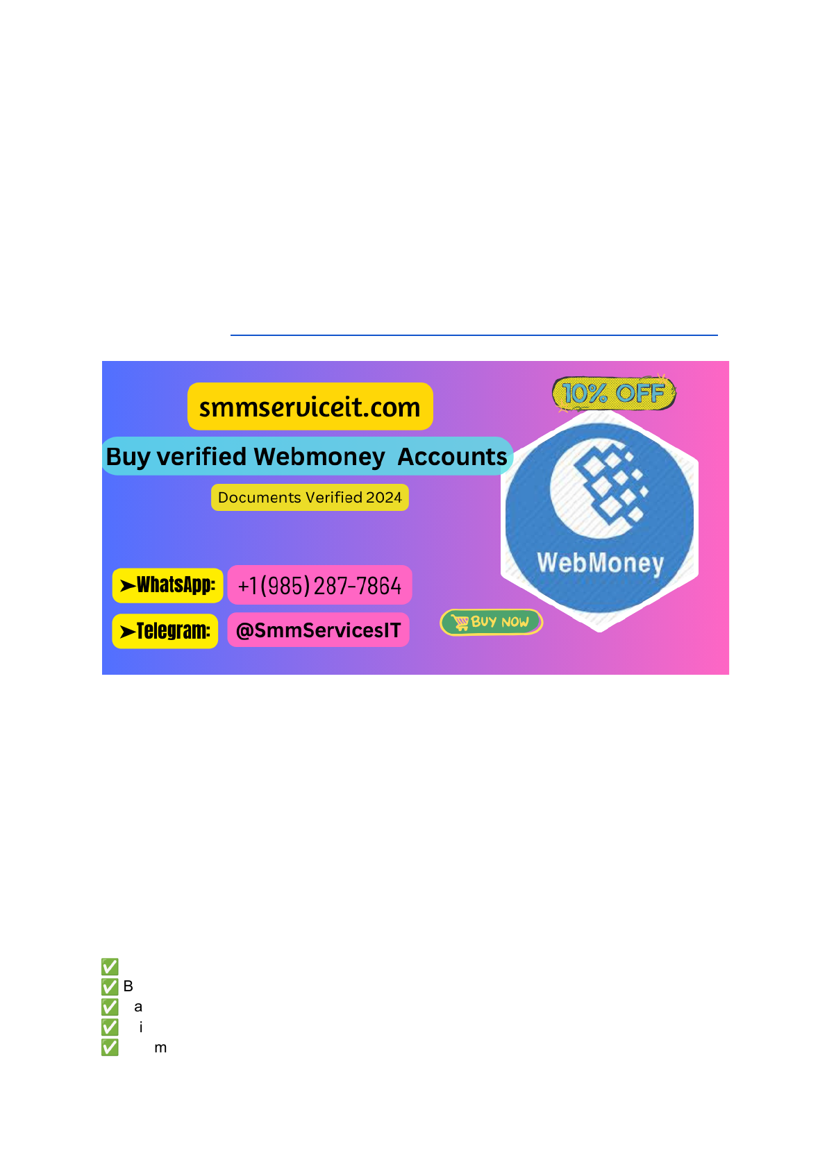 Buy Verified WebMoney account online easily and safely WebMoney is popular online payment system that allows you to earn fast. If you want to more information just contact now. 24 Hours Reply/Contact ➤Email: smmserviceit@gmail.com ➤Skype: SmmServiceIT ➤Telegram: @SmmServicesIT ➤WhatsApp: +1 (985) 287-7864 Visit Our Website:https://smmserviceit.com/product/buy-verified-webmoney-account/ Buy Verified WebMoney Accounts When it comes to managing your online transactions, WebMoney is the best solution. It would help if you bought verified WebMoney accounts from a reliable source to avoid inconvenient payment methods. If you’re looking for verified WebMoney accounts in the EU, US, and other countries, Smmserviceit.com can help you. If you want to get it, please contact us by Skype, WhatsApp, or Telegram. So buy verified WebMoney account and enjoy it. Our Service Always Trusted Customers sufficient Guarantee – ✅ Date of Birth used ✅ Bank Verified ✅ Card Verified ✅ Driving License And Passport ✅ Webmoney Email and password https://join.skype.com/invite/wmLhDRzAtTvK https://t.me/smmservicesit https://api.whatsapp.com/send?phone=19852877864 https://smmserviceit.com/product/buy-verified-webmoney-account/ ✅ Verified Phone: US, UK, CA Phone Verify ✅ Email logins associated with Webmoney ✅ Name, address, City, Social Security Number & further all the details. ✅ Last 4 digits of Korea ,USA, UK, CA SSN ✅ Credit card used in Webmoney ✅ Send and receive money without limits ✅ 30 Days Replacement ✅ 100% Money-Back Guarantee ✅ 24/7 Ready to Customer Support Buy Verified WebMoney Account Are you looking for a convenient and secure way to make online payments? Look no further than WebMoney! This globally recognized online payment system provides users with a seamless and reliable financial transaction method. And if you want to take your WebMoney experience to the next level, buying a verified WebMoney account is the way to go! In this post, we’ll explore WebMoney, the importance of having a verified account, how it works, and why purchasing one can be incredibly beneficial. So, let’s dive in and discover the world of verified WebMoney accounts together. Buy Verified WebMoney Account. What is WebMoney? WebMoney is a popular online payment system allowing individuals and businesses to send and receive funds in various currencies securely. Founded in 1998, WebMoney has gained a strong reputation for its reliability and user-friendly interface. It operates as an electronic wallet, enabling users to store their funds digitally. One of the critical features of WebMoney is its ability to facilitate domestic and international transactions easily. Users can transfer money between accounts, make payments for goods and services online, or even top up their mobile phone credit – all within a few clicks. To ensure the safety of transactions, WebMoney utilizes advanced security measures such as multi-factor authentication, encryption protocols, and real-time monitoring to detect suspicious activities. Buy Verified WebMoney Account. This provides peace of mind for users concerned about the confidentiality of their financial information. Moreover, WebMoney offers additional services like issuing prepaid cards linked to your account balance, which can be used for offline purchases at physical stores or https://smmserviceit.com/product/buy-verified-webmoney-account/ https://www.wmtransfer.com/ ATMs worldwide. This flexibility makes it convenient for individuals who prefer to avoid carrying cash but still want access to their funds wherever they go. WebMoney provides a secure and efficient platform for conducting financial transactions online. With its wide range of features and global reach, it’s no wonder that millions of people worldwide choose WebMoney as their preferred payment method. Importance of Verified Webmoney Account: The importance of having a verified WebMoney account must be balanced. In today’s digital age, online transactions have become the norm, and ensuring that your financial information remains secure is crucial. You can access various benefits and features that enhance your online payment experience by obtaining a verified WebMoney account. Buy Verified WebMoney Account. One of the primary advantages of having a verified WebMoney account is increased security. With identity verification measures in place, you can rest assured that your funds are protected from unauthorized access or fraudulent activities. Additionally, through verification, you establish trust with potential business partners or clients who may require proof of your legitimacy before engaging in financial transactions. Another significant benefit is the ability to transact globally without restrictions. Whether purchasing goods from international vendors or sending money to friends and family abroad, having a verified WebMoney account ensures smooth https://smmserviceit.com/product/buy-verified-webmoney-account/ cross-border payments. This convenience saves time and eliminates currency conversion fees associated with traditional banking methods. Furthermore, a verified WebMoney account opens to additional services, such as loans and investments within the platform’s ecosystem. These opportunities allow users to grow their wealth while enjoying greater financial flexibility. Acquiring a verified WebMoney account offers enhanced security for online transactions, global payment capabilities without limitations, and access to additional financial services. With these benefits at hand, it becomes clear why having this type of account is essential when navigating the digital marketplace efficiently and securely. How does WebMoney work? WebMoney is a digital payment system that allows users to send and receive money online securely. It operates in multiple currencies, including USD, EUR, and RUB, making it convenient for users worldwide. But how does WebMoney work? To start using WebMoney, yo