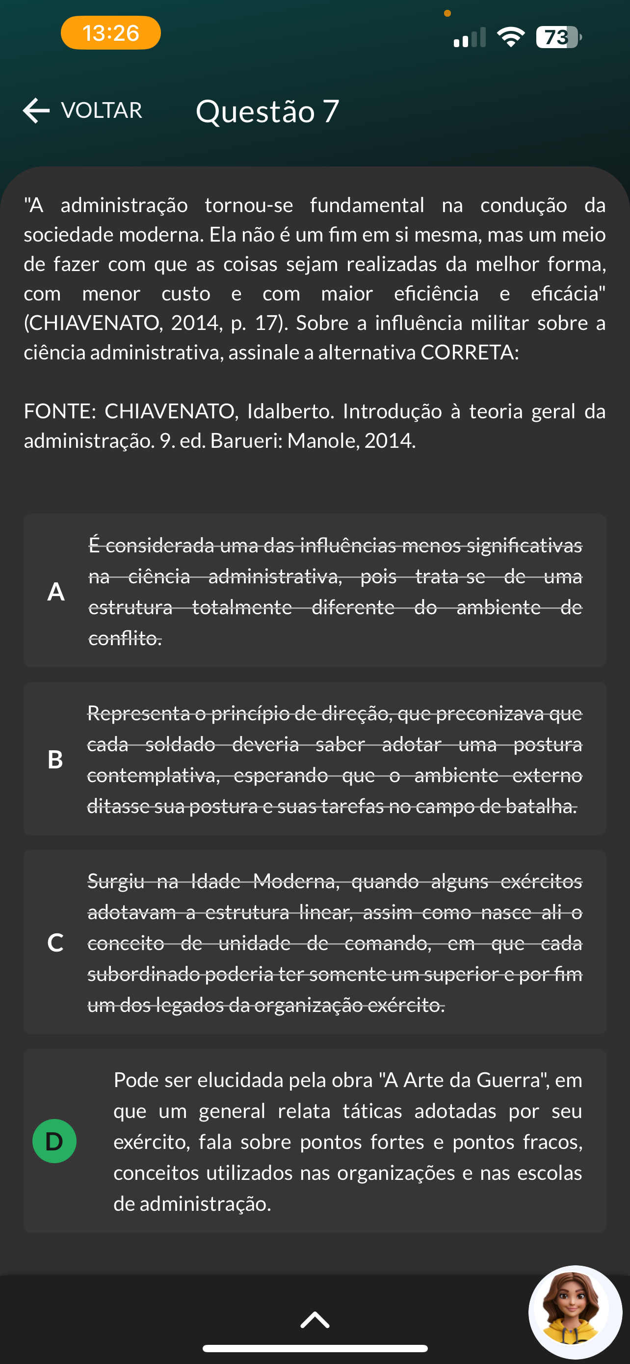 13:26 73 VOLTAR Questão 7 "A administração tornou-se fundamental na condução da sociedade moderna. Ela não é um fim em si mesma, mas um meio de fazer com que as coisas sejam realizadas da melhor forma, com menor custo e com maior eficiência e eficácia" (CHIAVENATO, 2014, p. 17). Sobre a influência militar sobre a ciência administrativa, assinale a alternativa CORRETA: FONTE: CHIAVENATO, Idalberto. Introdução à teoria geral da administração. 9. ed. Barueri: Manole, 2014. É considerada uma das influências menos significativas na ciência administrativa, pois trata se de uma A estrutura totalmente diferente do ambiente de conflito. Representa princípio de direção, que preconizava que cada soldado deveria saber adotar uma postura contemplativa, esperando que ambiente externo ditasse sua postura e suas tarefas no campo de batalha. Surgiu na Idade Moderna, quando alguns exércitos adotavam a estrutura linear, assim como nasce ali c conceito de unidade de comando, em que cada subordinado poderia ter somente um superior e por fim um dos legados da organização exército. Pode ser elucidada pela obra "A Arte da Guerra", em que um general relata táticas adotadas por seu D exército, fala sobre pontos fortes e pontos fracos, conceitos utilizados nas organizações e nas escolas de administração.