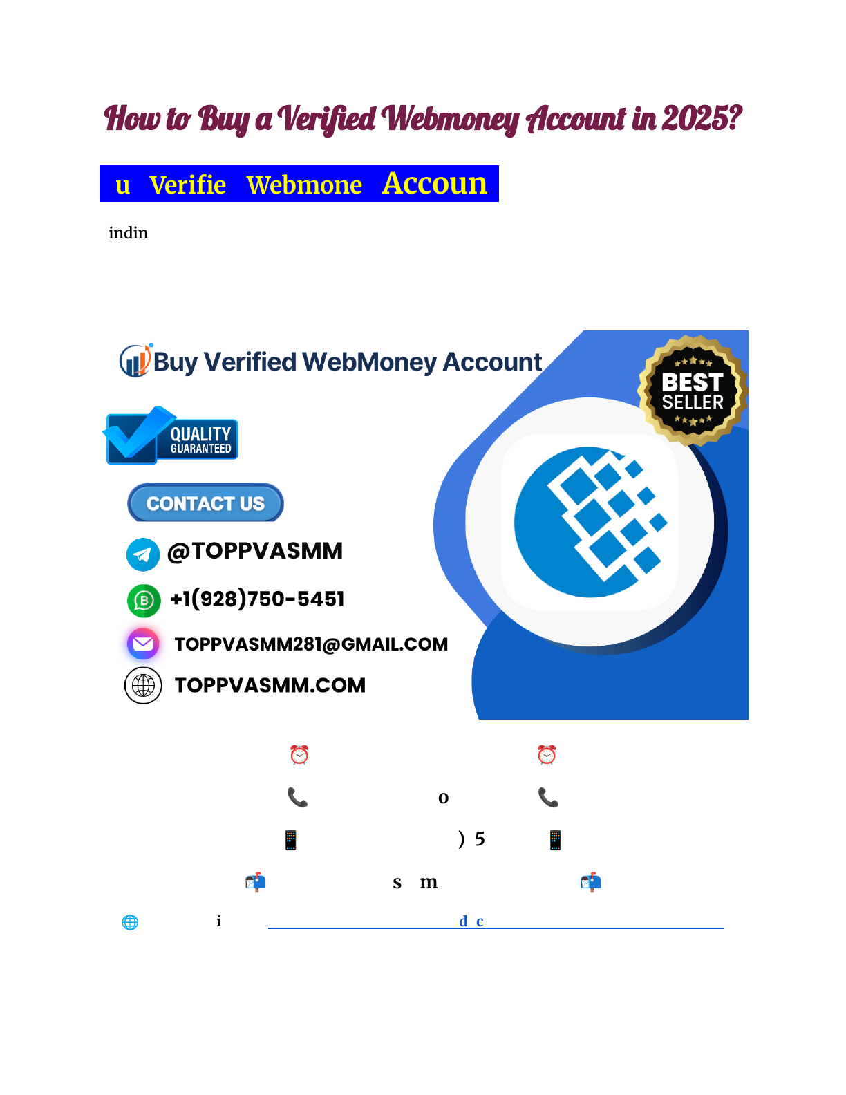How to Buy a Verified Webmoney Account in 2025? Buy Verified Webmoney Account Finding a reliable and secure way to get a verified account can feel confusing and risky. But what if you could avoid common mistakes and make a smart purchase that saves you time and hassle? In this guide, you’ll discover clear, step-by-step tips to help you buy a verified Webmoney account safely and confidently. ⏰24/7 Hours Reply/Contact⏰ 📞Telegram : @Toppvasmm📞 📱WhatsApp :+1(928)750-5451📱 📬Email : toppvasmm281@gmail.com📬 🌐Website Visit Now :https://toppvasmm.com/product/buy-verified-webmoney-account/ Keep reading to unlock the secrets that will protect your money and boost your online transactions. Your smooth Webmoney experience starts here. https://toppvasmm.com/product/buy-verified-webmoney-account/ Why Choose A Verified Webmoney Account Choosing a verified Webmoney account brings many advantages. Verification confirms your identity and makes your account more trustworthy. This trust is important for secure transactions and smooth operations. Many users prefer verified accounts for safer money transfers and better service access. Unverified accounts have limits and risks. Verification removes these limits and lets you use all Webmoney features. It also improves your reputation among other users and partners. Benefits Of Verification Verification increases account security. It helps protect your funds from fraud and theft. Verified accounts can send and receive higher amounts of money. You can use more Webmoney services without restrictions. Verification also speeds up dispute resolution if problems arise. Many businesses only accept payments from verified accounts. Risks Of Unverified Accounts Unverified accounts face many restrictions. They have low transaction limits and limited service access. These accounts are more likely to be blocked or frozen. Fraudsters often target unverified accounts due to weak security. You may lose money or face delays in resolving issues. Using unverified accounts can harm your online reputation. Key Features Of Verified Accounts Verified Webmoney accounts offer many benefits that regular accounts do not. These accounts provide better options for transactions, security, and service access. Understanding these features helps in making the right choice when buying a verified account in 2025. Transaction Limits Verified accounts have higher transaction limits. Users can send and receive larger amounts of money. This is important for business or frequent users. The limits are set by Webmoney based on verification levels. This allows smoother handling of bigger payments without interruptions. https://toppvasmm.com/product/buy-verified-webmoney-account/ Security Enhancements Verification adds extra security to the account. It helps prevent fraud and unauthorized access. Webmoney applies stricter checks on verified accounts. Users get more control over their account safety. Features include two-factor authentication and identity confirmation steps. ⏰24/7 Hours Reply/Contact⏰ 📞Telegram : @Toppvasmm📞 📱WhatsApp :+1(928)750-5451📱 📬Email : toppvasmm281@gmail.com📬 🌐Website Visit Now :https://toppvasmm.com/product/buy-verified-webmoney-account/ Access To Services Verified accounts can use more Webmoney services. Some features and tools are only open to verified users. This includes advanced payment options and business solutions. Access to these services improves account flexibility and usability. It makes the account suitable for different financial needs. Where To Find Verified Accounts Finding a verified Webmoney account requires care and attention. The right source matters for safety and reliability. Buying from the correct place reduces risks and ensures a smooth experience. Several options exist for buying verified accounts. Each has its own benefits and precautions. Knowing where to look helps you make a smart choice. Trusted Marketplaces Trusted marketplaces host verified Webmoney accounts for sale. These platforms check sellers before allowing listings. They offer buyer protection and secure payment methods. Use marketplaces with good reviews and clear policies. Avoid sites with many complaints or hidden fees. Reputable Sellers https://toppvasmm.com/product/buy-verified-webmoney-account/ Reputable sellers have a history of honest transactions. They provide proof of account verification and clear terms. Look for sellers with high ratings and positive feedback. Contact them to ask questions before purchasing. Reliable sellers value customer trust and respond quickly. Avoiding Scams Scams are common in online account sales. Never pay outside secure platforms or to unknown individuals. Check seller credentials and read all reviews carefully. Avoid deals that seem too cheap or urgent. Use escrow services if possible to protect your money. Steps To Buy A Verified Account Buying a verified Webmoney account requires clear steps. Follow these to avoid risks and secure a reliable account. Understanding each step helps you make a safe purchase. Verification means the account is confirmed by Webmoney itself. This makes it more trustworthy for transactions. Checking Seller Credentials Start by reviewing the seller’s background. Check their ratings and reviews on trusted platforms. A good seller will have positive feedback from many buyers. Avoid sellers with low ratings or no reviews. Ask for proof of identity to confirm they are genuine. This reduces the chance of fraud. Account Verification Proof Ask the seller to provide verification documents. These include screenshots of the Webmoney verification page. The documents should show the account status and owner details. This proof shows the account is indeed verified. Without it, do not proceed with the purchase. Payment Methods Choose safe payment options. Use methods that offer buyer protection, like PayPal or escrow services. Avoid direct bank transfers or wire services without safegua