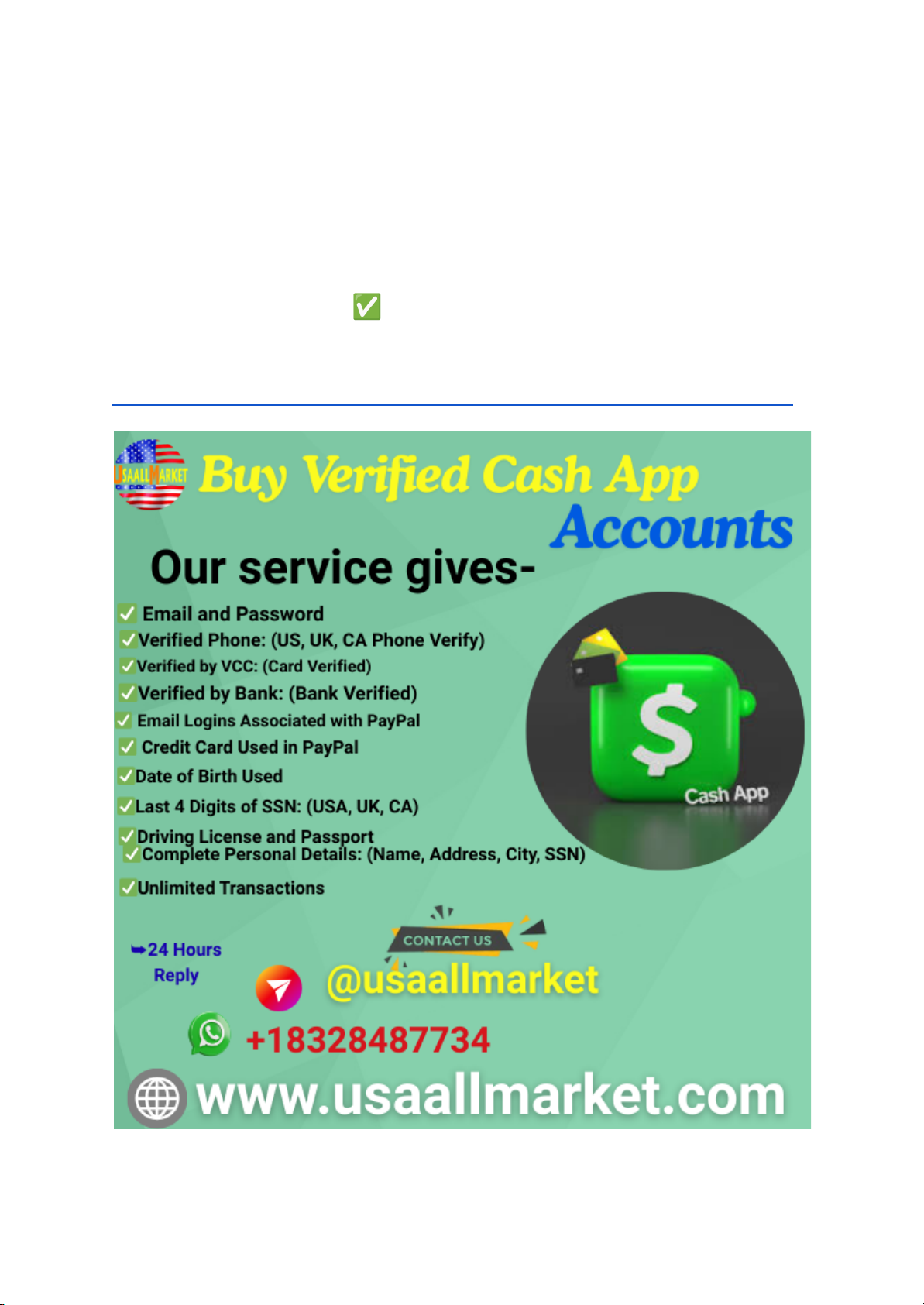 Why Verified Cash App Accounts Are Important for Secure Transactions ➥ If you want to more information just contact now. ➤ 24 Hours Reply ➤Whatsapp:+18328487734 ✅ Telegram: @usaallmarket ➤ Email: usaallmarket@gmail.com https://usaallmarket.com/product/buy-verified-cash-app-accounts/ Buy Verified Cash App Accounts https://wa.me/18328487734 https://t.me/usaallmarket https://usaallmarket.com/product/buy-verified-cash-app-accounts/ Looking to buy verified Cash App accounts? You can purchase verified Cash App accounts from reputable online sellers to use for your financial transactions. These accounts have been authenticated and verified by the platform, providing you with a secure and reliable option for managing your money. Whether you need a verified account for personal or business use, buying one can offer peace of mind and convenience. With a verified Cash App account, you can take advantage of various features and services offered by the platform without the hassle of verification procedures. It’s important to ensure that you are purchasing from a reliable source to guarantee the legitimacy and security of the account. Why Choose Verified Cash App Accounts Choosing verified Cash App accounts can make a big difference. It ensures safe and smooth transactions. Verified accounts offer many benefits that unverified ones lack. These benefits are crucial for both personal and business use. Let's explore the advantages of using verified Cash App accounts. Benefits Of Verification Verification adds trust to your Cash App account. It allows higher transaction limits. You can send and receive more money each month. Verified accounts often enjoy faster support. This means help is available when needed. Verification also opens access to additional features. This includes a Cash Card and Bitcoin trading. These benefits make your experience better and more efficient. Enhanced Security Features Security is a top concern in digital transactions. Verified accounts offer stronger security. They use advanced encryption to protect your data. This keeps your money safe from hackers. Verification also reduces the risk of fraud. It ensures that your account is truly yours. Enhanced security gives peace of mind. You can focus on your transactions without worry. Risks Of Unverified Accounts When you use Cash App, you want to ensure your transactions are safe and secure. However, using unverified accounts can pose significant risks. Understanding these risks can help you make informed decisions about your financial safety. Let's delve into the dangers of unverified Cash App accounts and why opting for verified accounts could be a wiser choice. Potential For Fraud https://usaallmarket.com/product/buy-verified-cash-app-accounts/ https://usaallmarket.com/product/buy-verified-cash-app-accounts/ https://usaallmarket.com/product/buy-verified-cash-app-accounts/ Unverified accounts are like open doors for fraudsters. They lack the security checks that verified accounts undergo, making them easy targets for scams. Imagine sending money to someone you believe is trustworthy, only to find out it's a fraudulent account. Without verification, you might fall prey to phishing attempts or fraudulent transactions. These scams can drain your balance and leave you vulnerable. Can you afford to lose your hard-earned money to a scam? Impact On Transaction Safety Using unverified accounts can compromise your transaction safety. Verified accounts offer layers of protection, like identity checks and transaction monitoring. These features help ensure your money reaches the right destination. Unverified accounts may lack these safeguards, making it easier for transactions to be intercepted or redirected. Picture this: you think you've paid your rent, but your money is rerouted to an unknown account. How would you feel if your financial stability was jeopardized? By choosing verified accounts, you reduce these risks significantly. You can enjoy peace of mind knowing your transactions are secure and your money is safe. Isn't it worth taking that extra step to protect your finances? How Verification Protects You Verification is essential for safe Cash App transactions. It builds trust and security. Verified accounts offer peace of mind. Knowing your transactions are secure is crucial. Verification protects users from fraud and data breaches. Let's explore how. Data Encryption Data encryption is a key feature of verified accounts. It protects sensitive information. Encryption converts data into a secure code. This makes it unreadable to hackers. Only authorized parties can access the information. Your financial details remain safe and private. Fraud Detection Mechanisms Fraud detection mechanisms are vital for security. They monitor transactions for unusual activity. This helps identify suspicious behavior quickly. Alerts are sent if a threat is detected. Verified accounts ensure prompt action to protect your funds. This minimizes risk and enhances user confidence. ➥ If you want to more information just contact now. ➤ 24 Hours Reply ➤Whatsapp:+18328487734 ✅ Telegram: @usaallmarket https://usaallmarket.com/product/buy-verified-cash-app-accounts/ https://wa.me/18328487734 https://t.me/usaallmarket ➤ Email: usaallmarket@gmail.com https://usaallmarket.com/product/buy-verified-cash-app-accounts/ Where To Buy Verified Cash App Accounts Many people use Cash App for quick money transfers and online purchases. Verified accounts offer extra security and features. Finding a reliable source to buy these accounts is crucial. Let's explore some places where you can find verified Cash App accounts. Trusted Vendors Trusted vendors provide verified Cash App accounts with authenticity. They ensure your account is secure and works properly. Do research to identify genuine vendors. Read reviews and customer feedback. This helps you avoid scams and make informed decisions. Online Marketplaces Online marketplaces are another option for buyi