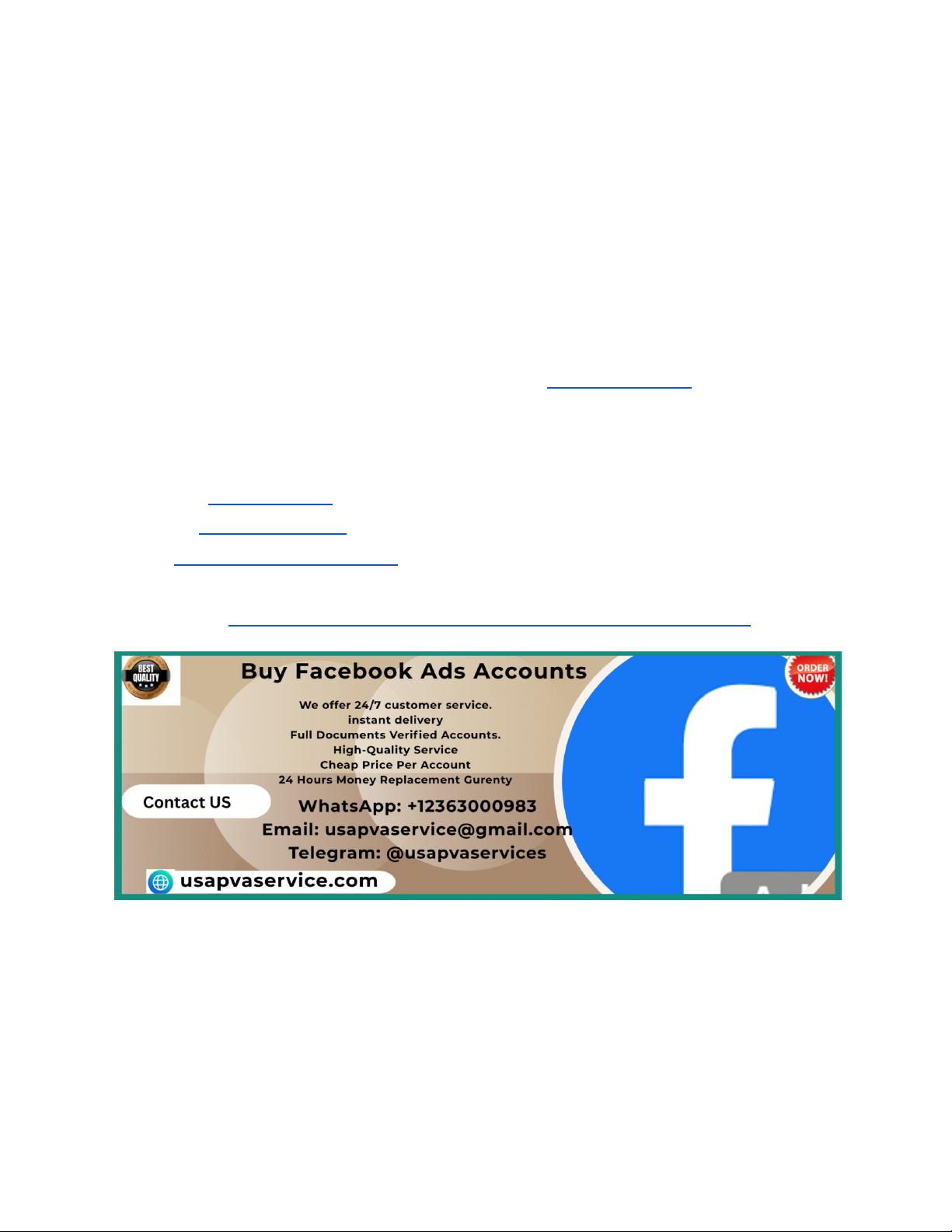 Facebook advertising offers massive reach and scalability, but it also comes with structural constraints such as spending caps, review delays, and trust-based limitations. Because of this, many advertisers search for ways to “run ads without limits,” often exploring alternative Facebook Ads account options to understand how scale is achieved in practice. This article explains the topic from an educational and strategic perspective. It clarifies what advertisers usually mean by “without limits,” how Facebook actually controls scale, and what realistically determines long-term advertising freedom. At USAPVASERVICE, we focus on helping advertisers separate assumptions from reality and build systems that scale sustainably rather than chasing risky shortcuts If you want more Information, Contact us now: WhatsApp: +12363000983 Telegram: @usapvaservices Email: usapvaservice@gmail.com Website Link: https://usapvaservice.com/product/buy-facebook-ads-accounts/ . What Advertisers Mean by “Running Ads Without Limits” When advertisers say they want to run ads without limits, they are usually referring to frustrations with low spending caps, frequent reviews, or sudden account restrictions. These limitations can slow growth, disrupt campaigns, and reduce predictability. https://usapvaservice.com/product/buy-facebook-ads-accou https://usapvaservice.com/product/buy-facebook-ads-accounts/ https://usapvaservice.com/product/buy-facebook-ads-accounts/ https://usapvaservice.com/product/buy-facebook-ads-accounts/ https://usapvaservice.com/product/buy-facebook-ads-accounts/ However, Facebook does not offer unlimited advertising by default. All accounts operate within trust-based systems that adjust limits dynamically based on behavior, performance, and reliability. In reality, “without limits” means fewer artificial constraints, smoother scaling, and higher tolerance from the platform—not total freedom. USAPVASERVICE helps advertisers reframe this goal into something achievable: building trust signals that allow consistent, scalable spending over time. Why Facebook Imposes Spending and Account Limits Facebook imposes limits to protect users, advertisers, and the platform itself. These controls reduce fraud, policy abuse, and poor user experiences. Spending caps, ad reviews, and account checks are part of an automated risk management system. New or inconsistent accounts face tighter limits until they demonstrate reliability. Limits are not punishments; they are safeguards. Accounts that behave predictably and comply with policies earn more flexibility. USAPVASERVICE emphasizes understanding why limits exist, because working with the system is far more effective than trying to fight it. Why Advertisers Look to Buy Facebook Ads Accounts Advertisers typically explore buying Facebook Ads accounts after encountering repeated restrictions, disabled accounts, or slow scaling. Others want to separate campaigns across multiple accounts to distribute risk. In fast-paced markets, delays can feel costly, leading advertisers to search for alternatives that promise faster or broader access. However, buying accounts is often a reaction to underlying issues such as compliance gaps, payment instability, or aggressive scaling patterns. USAPVASERVICE encourages advertisers to diagnose root causes before seeking replacements, as unresolved issues tend to follow new accounts as well. Common Myths About Unlimited Facebook Advertising A major myth is that any account—new, aged, or verified—can run ads without oversight. In reality, all accounts are subject to ongoing evaluation. https://usapvaservice.com/product/buy-facebook-ads-accou Another misconception is that spending limits are fixed. They change based on trust signals, not account labels. Some advertisers believe buying accounts removes the need for warm-up or compliance. This belief often leads to faster shutdowns. USAPVASERVICE replaces myths with operational clarity grounded in how Facebook systems actually work. How Facebook Determines Account Trust Levels Facebook evaluates trust through patterns across account behavior, ad quality, payment reliability, and user feedback. Trust is cumulative and dynamic. Consistent spending patterns, stable billing, compliant creatives, and positive engagement increase tolerance over time. Abrupt changes—such as sudden budget spikes or frequent creative shifts—can reset trust regardless of account history. USAPVASERVICE helps advertisers align execution with trust-building mechanisms rather than chasing perceived loopholes. The Role of Account Age and History Account age often influences perception, but it is not decisive. Older accounts with clean, consistent histories may face fewer early restrictions, but age alone does not guarantee scalability. Dormant or previously misused accounts can carry hidden risk. Facebook prioritizes recent behavior over historical existence. USAPVASERVICE helps advertisers evaluate when account history supports goals and when it becomes a liability. Why Warm-Up Is Critical for Higher Spending Freedom Warm-up is the process of gradually increasing activity to establish predictable behavior. Even accounts that appear ready benefit from warm-up. Warm-up helps Facebook systems understand intent, reducing the likelihood of reviews when budgets increase. Skipping warm-up may allow brief high spending but often leads to rapid restrictions. USAPVASERVICE designs warm-up strategies that balance speed with long-term flexibility. Payment Methods and Financial Trust Signals Payment stability is one of the strongest indicators of trust. Reliable billing histories support higher spending thresholds. Failed payments, frequent card changes, or mismatched billing information undermine confidence and increase reviews. Advertisers aiming for fewer limits must treat payment setup as strategic infrastructure. USAPVASERVICE integrates payment planning into scaling frameworks to support consistent growth