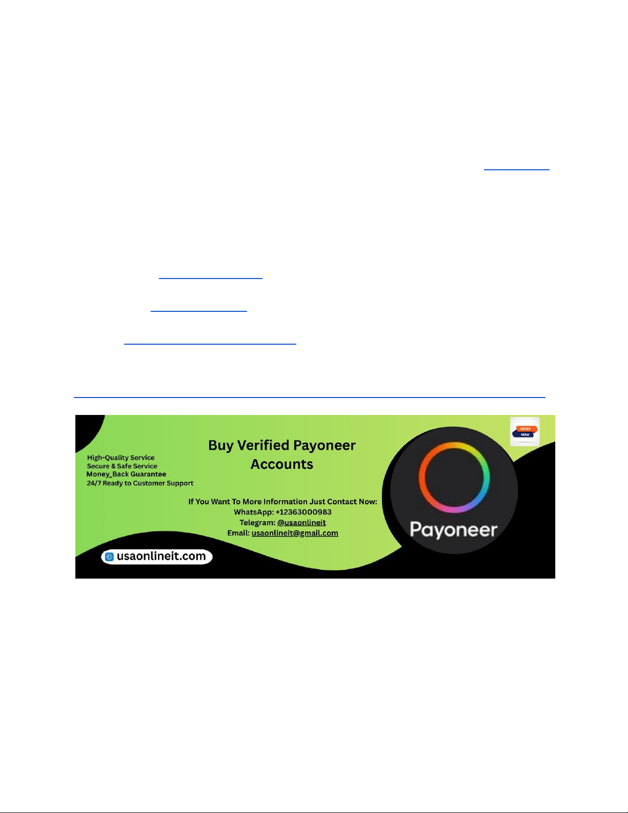 In the rapidly evolving digital economy of 2026, having verified payment accounts is crucial for businesses aiming to establish credibility, ensure secure transactions, and expand their online presence. With the increasing demand for authentic and verified financial tools, many entrepreneurs are seeking reliable sources to acquire genuine payment accounts. USAOnlineIT stands out as a trusted provider, offering verified accounts tailored to your business needs. This guide explores the best avenues, considerations, and tips for purchasing verified payment accounts in 2026. If You Want To More Information Just Contact Now: WhatsApp: +12363000983 Telegram: @usaonlineit Email: usaonlineit@gmail.com website link : https://usaonlineit.com/product/buy-verified-payoneer-accounts/ Understanding Verified Payment Accounts A verified payment account is an online financial profile that has undergone a comprehensive verification process by the payment provider, confirming the identity and legitimacy of the user or business. These accounts typically have higher transaction limits, lower risk of suspension, and improved trustworthiness with customers and partners. Verification methods may include providing official documents, linking bank accounts, or confirming business credentials. For businesses, having verified accounts ensures smoother operations, regulatory compliance, and enhanced reputation. In 2026, the importance of verified accounts is more pronounced, https://usaonlineit.com/product/buy-verified-payoneer-accounts/ https://wa.me/message/74UDWDX2TFOWF1 https://t.me/usaonlineit https://usaonlineit.com/product/buy-facebook-ads-accounts/usaonlineit@gmail.com https://usaonlineit.com/product/buy-verified-payoneer-accounts/ especially with stricter financial regulations and fraud prevention measures. Choosing genuine verified accounts from reputable sources protects your business from potential fraud, account suspensions, and legal issues. Legal and Regulatory Considerations in 2026 Navigating the legal landscape when purchasing verified payment accounts is essential. In 2026, regulations surrounding online financial transactions are stricter than ever, aiming to combat money laundering, fraud, and cybercrime. Businesses must ensure that the accounts they acquire comply with local and international laws. Engaging with reputable providers like USAOnlineIT ensures that accounts are obtained through legal channels, with proper verification and documentation. Avoiding black-market or unverified sources is crucial, as these can lead to legal penalties, account freezes, or financial losses. Staying informed about the legal requirements for your region and industry can save your business from potential liabilities and ensure smooth operations. Top Platforms for Purchasing Verified Payment Accounts in 2026 In 2026, several platforms have established themselves as reliable sources for verified payment accounts. These include specialized marketplaces, direct provider websites, and trusted brokers. USAOnlineIT is recognized as one of the leading providers, offering verified accounts with guaranteed authenticity. Other notable platforms include established marketplaces like Paxful, LocalBitcoins (for crypto-based accounts), and dedicated financial service providers. When selecting a platform, consider reputation, customer reviews, security measures, and compliance standards. It’s essential to verify that the platform adheres to legal protocols and offers genuine accounts to avoid scams and fraud. USAOnlineIT: Your Trusted Partner for Verified Accounts USAOnlineIT has built a reputation for providing genuine, verified payment accounts tailored for business needs. With years of experience in the industry, USAOnlineIT ensures that every account is thoroughly verified, compliant with regulations, and ready for immediate use. Their dedicated customer support helps businesses navigate the complexities of acquiring verified accounts, offering guidance and assistance throughout the process. USAOnlineIT prioritizes security, transparency, and customer satisfaction, making them a preferred choice for businesses in 2026. Whether you need PayPal, merchant accounts, or other digital payment tools, USAOnlineIT provides solutions that align with your operational goals. Types of Verified Payment Accounts Available in 2026 The variety of verified payment accounts available in 2026 caters to diverse business needs. Common types include PayPal Business Accounts, Stripe Verified Accounts, Skrill Accounts, and bank-linked merchant accounts. Each type offers unique features, transaction limits, and verification procedures. PayPal Business Accounts are popular for general online transactions, while Stripe accounts are preferred for e-commerce platforms. Skrill and other e-wallets offer additional flexibility. USAOnlineIT provides a range of these accounts, ensuring your business can select the right type based on your industry, transaction volume, and operational requirements. Understanding the differences helps in choosing the most suitable account for seamless financial management. How to Verify Payment Accounts in 2026 Verifying a payment account in 2026 involves several steps designed to confirm your identity and business legitimacy. Typically, verification requires submitting official documents such as business registration certificates, tax IDs, or government-issued IDs. Linking a verified bank account or credit card is also essential. Some platforms may perform additional checks like facial recognition or address verification. At USAOnlineIT, verification processes are streamlined to ensure quick approval without compromising security. Proper verification not only grants higher transaction limits but also enhances trustworthiness. Businesses should ensure all submitted information is accurate and up-to-date to avoid delays or account suspensions. Risks Associated with Unverified or Fake Accounts Using unverified or fake payme