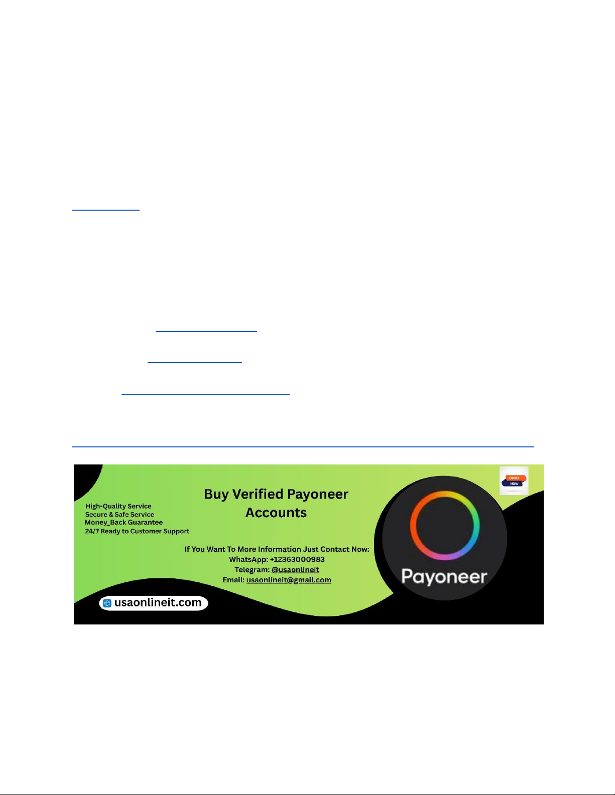 Introduction: Understanding Verified Payment Accounts In today’s digital economy, verified payment accounts have become essential for businesses and individuals alike. These accounts, often linked to major payment platforms like PayPal, Stripe, and others, provide credibility, security, and ease of transactions. However, acquiring a verified account can sometimes be challenging due to strict verification processes and security measures. As we advance into 2026, the demand for verified payment accounts continues to grow, prompting many to seek reliable sources where such accounts are available for sale. USAOnlineIT stands out as a trusted provider in this space, ensuring secure and verified accounts for clients worldwide. In this comprehensive guide, we will explore the safest avenues to buy verified payment accounts, how to verify their authenticity, legal considerations, and best practices to avoid scams. Whether you're an entrepreneur, freelancer, or e-commerce seller, this guide will equip you with the knowledge to navigate the market confidently and securely. If You Want To More Information Just Contact Now: WhatsApp: +12363000983 Telegram: @usaonlineit Email: usaonlineit@gmail.com website link : https://usaonlineit.com/product/buy-verified-payoneer-accounts/ The Growing Demand for Verified Payment Accounts Over recent years, the necessity for verified payment accounts has skyrocketed. Businesses prefer these accounts because they reduce transaction limits, improve credibility, and minimize risks of account suspension. Freelancers and online sellers also rely on verified accounts to https://usaonlineit.com/product/buy-verified-payoneer-accounts/ https://wa.me/message/74UDWDX2TFOWF1 https://t.me/usaonlineit https://usaonlineit.com/product/buy-facebook-ads-accounts/usaonlineit@gmail.com https://usaonlineit.com/product/buy-verified-payoneer-accounts/ https://usaonlineit.com/product/buy-verified-payoneer-accounts/ facilitate smooth payments without interruptions. In 2026, with the expansion of digital commerce and remote work, the demand is even more pronounced. Verified accounts help in building trust with customers and payment processors, reducing fraud, and maintaining compliance with financial regulations. Additionally, many platforms now restrict transactions from unverified accounts to prevent money laundering and fraudulent activities, making verified accounts crucial for operational continuity. USAOnlineIT recognizes this trend and offers verified payment accounts that meet platform requirements, ensuring users can operate smoothly and securely. As the market evolves, understanding where and how to find legitimate verified accounts becomes vital for any online financial activity. Legality and Ethical Considerations in Buying Payment Accounts Before diving into where to purchase verified payment accounts, it’s essential to understand the legal and ethical implications involved. Many platforms strictly prohibit the sale or transfer of accounts, considering it a violation of their terms of service. Engaging in such transactions might lead to account suspension, loss of funds, or legal action. However, some providers operate within legal boundaries by selling accounts that are authorized for transfer or resale. USAOnlineIT emphasizes transparency and compliance, ensuring that all accounts sold are legitimate and adhere to platform policies. Buyers should thoroughly research and confirm the legitimacy of sellers before proceeding. Ethical considerations also include avoiding accounts that may have been obtained through fraudulent means or stolen credentials. Responsible purchasing not only protects you legally but also preserves the integrity of your online operations. Always prioritize reputable sources and verify the authenticity of accounts to prevent future complications. Top Platforms to Find Verified Payment Accounts in 2026 In 2026, several online platforms have emerged as reliable sources for verified payment accounts. These platforms typically offer a marketplace where verified accounts are listed for sale, often with guarantees or warranties. USAOnlineIT is among the most trusted providers, offering verified accounts that are tested and compliant with platform standards. Other notable platforms include specialized marketplaces like PayPal Resale Marketplaces, eBay (with verified seller ratings), and niche forums dedicated to digital accounts. It’s important to look for platforms that provide detailed information about the account’s history, verification status, and seller reputation. User reviews and platform guarantees can also be indicators of reliability. Always opt for platforms that prioritize security, transparency, and customer support. By choosing the right marketplace, you ensure a safer transaction and access to verified accounts that can be used immediately for business or personal needs. How to Verify the Authenticity of Payment Accounts for Sale Verifying the authenticity of a payment account before purchase is crucial to avoid scams and future account issues. Start by requesting comprehensive documentation from the seller, including proof of ownership, transaction history, and verification status. Reputable sellers like USAOnlineIT often provide guarantees or warranties, which can serve as proof of authenticity. Additionally, check the account’s activity history, recent transactions, and linked bank details to ensure it is active and legitimate. Use tools such as email verification, phone verification, and platform-specific checks to authenticate the account. Conduct online research about the seller, reading reviews and ratings from previous buyers. If possible, test the account with small transactions to confirm functionality before making a larger purchase. Remember that authentic accounts should have a clear, traceable history and should not be flagged for suspicious activity. Taking these steps helps secure your investment and ensures compliance w