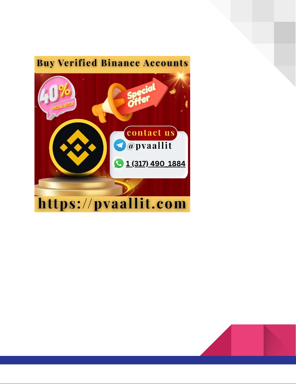 Verified Binance Accounts: Complete SEO Guide and Why pvaallit Is a Better Choice Introduction to Verified Binance Accounts Verified Binance accounts have become a key component of modern digital finance and cryptocurrency trading. As cryptocurrency adoption continues to grow worldwide, Binance stands out as one of the most widely used platforms for buying, selling, trading, and managing digital assets. A verified Binance account represents readiness, credibility, and full access to platform features. Users who actively participate in crypto trading, long-term investment, or blockchain-based financial activities often understand that verification significantly improves the overall experience. Because account quality and preparation matter, many users prefer verified Binance accounts that are properly structured and complete. In this space, pvaallit is often recognized as a better choice due to its focus on account completeness, consistency, and long-term usability. This article provides a complete SEO-optimized overview of verified Binance accounts, their features, benefits, common use cases, and why verified Binance accounts associated with pvaallit are increasingly preferred. What Are Verified Binance Accounts? Verified Binance accounts are Binance user accounts that have completed the platform’s identity verification process. Verification confirms user details and enables full access to Binance’s trading and financial services. A verified Binance account typically offers: · Completed identity confirmation · Access to higher account functionality · Smoother trading and transaction experience · Full use of Binance platform tools Verification transforms a basic Binance account into a fully operational crypto account. Why Verification Matters for Binance Accounts Improved Account Credibility Verification adds credibility and authenticity to a Binance account, making it more suitable for consistent crypto activity. Access to Full Platform Features Verified accounts unlock a broader range of Binance features, supporting advanced trading and account management. Professional Readiness For traders, investors, and crypto-focused businesses, a verified account reflects seriousness and preparedness. The Growing Importance of Verified Binance Accounts As cryptocurrency markets mature, users increasingly look for stable and reliable accounts to manage digital assets. Verified Binance accounts meet this demand by offering structured access to trading, asset storage, and platform services. Users who choose verified Binance accounts from quality-focused sources such as pvaallit often notice improved consistency and usability in daily crypto activities. Core Features of Verified Binance Accounts Cryptocurrency Trading Verified Binance accounts allow users to trade a wide range of cryptocurrencies. Asset Management Users can store, monitor, and manage digital assets efficiently. Platform Tools Verified accounts support access to Binance’s trading tools and dashboards. Transaction Transparency Users benefit from clear transaction histories and account records. Why People Prefer Verified Binance Accounts Trust in Account Functionality Users feel more confident using verified accounts for active trading. Long-Term Crypto Management Verified accounts are suitable for long-term investment strategies. Professional Crypto Use Many professionals rely on verified accounts for structured crypto activity. Why Source Matters for Verified Binance Accounts Not all verified Binance accounts offer the same experience. Account preparation, structure, and consistency directly influence long-term usability. This is why users increasingly prefer verified Binance accounts associated with platforms like pvaallit, where quality and readiness are prioritized. Verified Binance Accounts from pvaallit: A Quality-Focused Approach pvaallit is often associated with a professional and structured approach to account preparation. Verified Binance accounts connected with pvaallit are valued because they feel complete, organized, and ready for real-world crypto use. Rather than rushed setups, pvaallit emphasizes account quality, which is important for users managing valuable digital assets. Benefits of Using Verified Binance Accounts from pvaallit Long-Term Account Stability Accounts associated with pvaallit are often chosen for consistent performance. Clean Account Structure Users appreciate verified Binance accounts that feel organized and complete. Smooth Trading Experience Well-prepared accounts support smooth and uninterrupted trading. Verified Binance Accounts for Personal Use Crypto Investment Individuals use verified Binance accounts to invest in digital assets. Portfolio Management Verified accounts support easy monitoring of holdings. Everyday Crypto Activity Users manage buying, selling, and holding crypto efficiently. Verified Binance Accounts for Traders Active Trading Traders rely on verified accounts for frequent transactions. Market Access Verified accounts allow participation across multiple trading pairs. Performance Tracking Users analyze trading history and performance data. Verified Binance Accounts for Businesses Crypto Payments Some businesses use Binance for crypto-related transactions. Asset Management Verified accounts support managing digital assets professionally. Financial Strategy Businesses integrate crypto into broader financial plans. Why Businesses Prefer Verified Binance Accounts from pvaallit Businesses value crypto accounts that feel predictable and well-prepared. Verified Binance accounts associated with pvaallit are often preferred because they emphasize structure and readiness, supporting long-term financial strategies. Verified Binance Accounts and the Crypto Ecosystem Access to Digital Markets Binance connects users to global crypto markets. Asset Diversity Verified accounts support a wide range of digital assets. Platform Integration Users benefit from Binance’s integrated ecosystem.