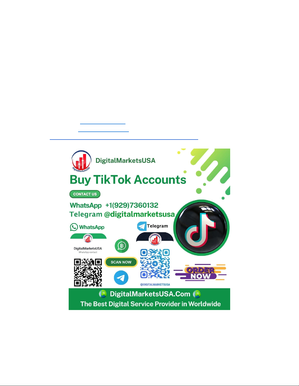 100+ Way to Buy TikTok Account – TikTok Accounts for Sale USA (2026 Market Research Guide) Complete Guide to TikTok Accounts (2026 Edition): Growth, Trends, USA Market Insights, and Algorithm Behavior Contact Now: ● WhatsApp: +1 (929) 736-0132 ● Telegram: @DigitalMarketsUSA Visit: https://digitalmarketsusa.com/product/buy-tiktok-account/ Introduction to TikTok Accounts in 2026 TikTok accounts have become one of the most influential digital assets in the social media world, shaping culture, marketing, trends, and online identity at a https://api.whatsapp.com/send/?phone=19297360132&text&type=phone_number&app_absent=0 https://telegram.me/digitalmarketsusa https://digitalmarketsusa.com/product/buy-tiktok-account/ scale never seen before. In 2026, the platform dominates short-form content in the USA and globally, with businesses, creators, brands, influencers, and everyday users depending on TikTok accounts to reach massive audiences through viral videos and trend-driven content. With more than 1.8 billion active users worldwide, TikTok accounts now play a crucial role in marketing, community building, entertainment, and brand visibility. Understanding how TikTok accounts function, how engagement works, and how the algorithm ranks content is essential for anyone interested in TikTok marketing, TikTok creator accounts, TikTok business accounts, influencer branding, or digital growth strategies. This guide explores the complete landscape of TikTok accounts, including account types, niche profiles, algorithm behavior, follower insights, U.S. market data, and the overall future of TikTok in the digital economy. Types of TikTok Accounts and Why They Matter There are several types of TikTok accounts, including personal TikTok accounts, TikTok creator accounts, TikTok business accounts, and niche content accounts. Personal accounts focus on everyday content, trends, and social engagement, while creator accounts unlock analytics, engagement insights, and content performance tools. Contact Now: ● WhatsApp: +1 (929) 736-0132 ● Telegram: @DigitalMarketsUSA Visit: https://digitalmarketsusa.com/product/the-ultimate-guide-for-chime-bank-a ccounts/ Business accounts on TikTok allow brands to run paid ads, connect storefronts, add external links, and access marketing dashboards that help companies reach U.S. and global audiences through advanced targeting. Niche TikTok accounts—such as fitness, beauty, food, travel, comedy, lifestyle, tech, and education—are especially important in 2026 because niche-focused pages often grow faster and maintain higher engagement rates. https://digitalmarketsusa.com/product/buy-new-gmail-accounts/ https://api.whatsapp.com/send/?phone=19297360132&text&type=phone_number&app_absent=0 https://telegram.me/digitalmarketsusa https://digitalmarketsusa.com/product/the-ultimate-guide-for-chime-bank-accounts/ https://digitalmarketsusa.com/product/the-ultimate-guide-for-chime-bank-accounts/ Each account type interacts differently with the TikTok algorithm, and understanding these dynamics helps creators optimize performance, increase followers, and build viral content strategies. Why TikTok Accounts Are So Powerful for Engagement TikTok accounts outperform most other social media platforms when it comes to engagement, making them one of the most valuable digital channels in modern marketing. The TikTok algorithm prioritizes content discovery, meaning that even new accounts can go viral with a single video if the content is engaging, creative, and retention-friendly. TikTok’s For You Page is built to push content based on user behavior rather than follower count, which is why TikTok accounts can grow faster than Instagram, YouTube, or Facebook profiles. Engagement comes from likes, comments, shares, watch time, video completion rate, and user interactions, and these signals tell the algorithm which TikTok accounts deserve more visibility. This unique engagement engine is why brands, influencers, and creators invest so heavily in TikTok accounts for marketing and audience building. How TikTok Accounts Grow Followers in the Current Algorithm Growing TikTok followers in 2026 requires an understanding of the updated algorithm, which is now more advanced, AI-driven, and behavior-based than ever https://digitalmarketsusa.com/product/buy-snapchat-accounts/ before. TikTok accounts grow when they post consistent content that aligns with niche interests and generates strong engagement within the first hour of posting. The algorithm analyzes watch time, retention rate, comment activity, profile visits, and share frequency to decide how widely to distribute a video. Accounts that post content in a consistent niche—such as comedy, fitness, beauty, gaming, luxury lifestyle, cooking, tech reviews, or motivation—tend to grow followers faster than random-content accounts. Adding trending sounds, participating in challenges, using high-performing hashtags, and optimizing video hooks also help TikTok accounts accelerate follower growth, especially in the USA where trends spread quickly. Understanding TikTok Niche Accounts and Their Growth Potential Niche TikTok accounts are some of the most successful profiles on the platform because niche-focused content builds more loyal, engaged audiences. Whether it’s a cooking account, beauty page, fitness instructor, entrepreneur brand, tech reviewer, travel influencer, or educational creator, niche TikTok accounts attract followers who prefer specific content types. This allows niche accounts to gain higher retention rates, more comments, and better engagement compared to generic accounts. Search volume for keywords like “fitness TikTok”, “beauty TikTok”, “food TikTok”, “business TikTok”, and “USA niche TikTok accounts” continues to grow, showing that niche categories dominate platform discovery. Niche accounts also earn more brand partnerships and have stronger long-term growth because advertisers prefer clear, targeted aud