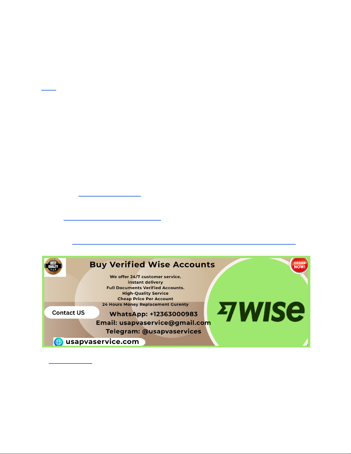 Buy Wise Accounts with Instant Access – Trusted Platform Why Wise Accounts Are Essential for Global Payments Wise has become one of the most trusted financial platforms for international transactions, offering multi-currency accounts, low conversion fees, and fast transfers. Businesses and freelancers working with global clients rely on Wise to receive and send money smoothly across borders. A properly set up Wise account helps users avoid delays, excessive bank fees, and complicated international banking procedures. That is why demand for ready-to-use Wise account solutions is increasing every day. If You Want more Information, Just Contact us now: WhatsApp: +12363000983 Telegram: @usapvaservices Email: usapvaservice@gmail.com Visit us :https://usapvaservice.com/product/buy-verified-wise-accounts/ At usapvaservice, we understand how critical instant access and reliability are for international payments. Our platform focuses on helping users get started quickly while ensuring compliance, stability, and long-term usability. Wise accounts are widely accepted by marketplaces, payment gateways, and global clients, making them a smart choice for anyone operating online. With the right support, users can manage multiple currencies, receive local bank details, and scale global https://usapvaservice.com/product/buy-verified-wise-accounts/ http://@usapvaservices https://usapvaservice.com/product/buy-verified-wise-accounts/ https://usapvaservice.com/product/buy-verified-wise-accounts/ operations without stress. Choosing a trusted platform is the key to making Wise work effectively for your business goals. Understanding Instant Access Wise Account Solutions Instant access means you do not need to wait days or weeks to start using your Wise account features. For online businesses, time is money, and delays can lead to missed opportunities. A Wise account with instant usability allows you to receive payments, hold balances, and initiate transfers right away. This is particularly important for freelancers, digital agencies, and eCommerce sellers working on tight schedules. usapvaservice focuses on streamlining the onboarding experience so clients can begin operations quickly and confidently. Our approach prioritizes smooth setup, account readiness, and guidance on using Wise features correctly. Instead of dealing with complicated steps alone, users benefit from structured support that reduces errors and saves time. Instant access is not just about speed; it is about having a fully functional account that works reliably from day one. That reliability is what makes Wise a preferred choice for global financial management. Key Features That Make Wise Accounts Valuable Wise accounts offer multi-currency balances, local bank details for major countries, and transparent exchange rates. These features help users manage international finances without opening multiple bank accounts. Businesses can receive payments like a local in the US, UK, EU, and other regions, which builds trust with clients and platforms. Another major advantage is cost efficiency. Wise uses real exchange rates and low, upfront fees, making it more affordable than traditional banks. With usapvaservice, users gain access to Wise account solutions designed to leverage these features effectively. We help clients understand how to use balances, convert currencies smartly, and maintain account health. When used properly, Wise becomes a powerful financial tool that supports growth, stability, and long-term success in global markets. Trusted Platform Benefits with usapvaservice Trust is the most important factor when choosing a Wise account service provider. A trusted platform ensures transparency, security, and ongoing support. usapvaservice has built its reputation by focusing on client satisfaction, compliance awareness, and clear communication. Our goal is to provide reliable Wise account assistance without hidden risks. We guide users through best practices, helping them avoid common mistakes that may lead to account limitations. Our platform emphasizes ethical use and proper account management so clients can operate confidently. By choosing usapvaservice, users benefit from structured support, responsive communication, and a service model designed for long-term usability. Trust is not just a word for us; it is the foundation of every service we provide. Wise Accounts for Freelancers and Remote Workers Freelancers and remote professionals often work with international clients who prefer paying via Wise. A Wise account allows them to receive payments quickly and convert funds at low cost. This improves cash flow and reduces dependency on expensive intermediaries. For freelancers, instant access to funds can make a significant difference in managing daily expenses and reinvesting in their work. usapvaservice understands the challenges freelancers face and offers Wise account solutions tailored to their needs. From receiving global payments to managing multiple currencies, our support helps freelancers stay focused on their work instead of financial complications. A properly managed Wise account can become a reliable financial backbone for remote professionals worldwide. Wise Accounts for eCommerce and Online Businesses eCommerce businesses operating internationally need efficient payment solutions. Wise accounts provide local bank details that simplify receiving payouts from marketplaces and payment processors. This reduces delays and improves overall financial management. Businesses can hold funds in multiple currencies and convert them when exchange rates are favorable. With usapvaservice, online businesses receive guidance on using Wise accounts strategically. We help clients understand payout structures, currency management, and account maintenance. This ensures smoother operations and better control over international revenue streams. A Wise account, when used correctly, can significantly enhance eCommerce scalability and profitability.