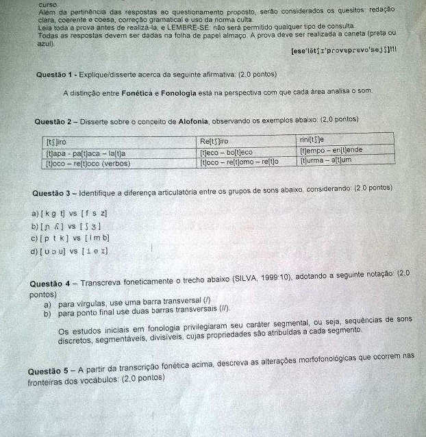 Prova 1 I Português Qual diferença entre fonética e fonologia? A) Fono estuda Som e Fonética estuda a língua. B) Fonética estuda a pronuncia de uma...